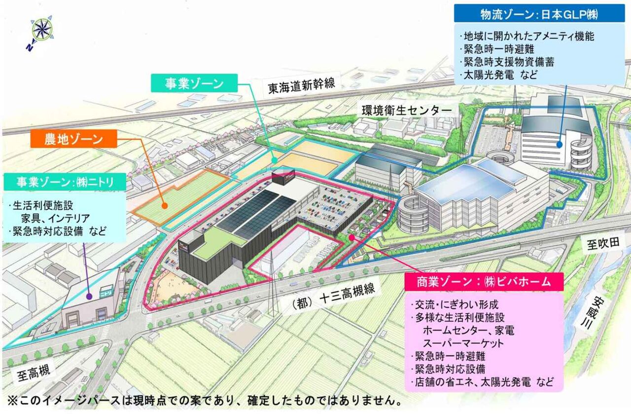 茨木市のページを参照しますと、「南目垣・東野々宮地区は、商業施設、物流施設の進出を核とした土地区画整理事業により、市南部地域の拠点として賑わいと活力あるまちに生まれ変わります」とあります。十三高槻線の府道沿いには、商業施設(ビバモール茨木)という商業施設もできるらしく、2024年開業の予定のようです。アークランドサカモト、ヤマダ電機ができるようです。アークランドサカモトはホームセンタームサシをを展開している会社のよう。そこにスーパーや、専門店が入る業態のようです。