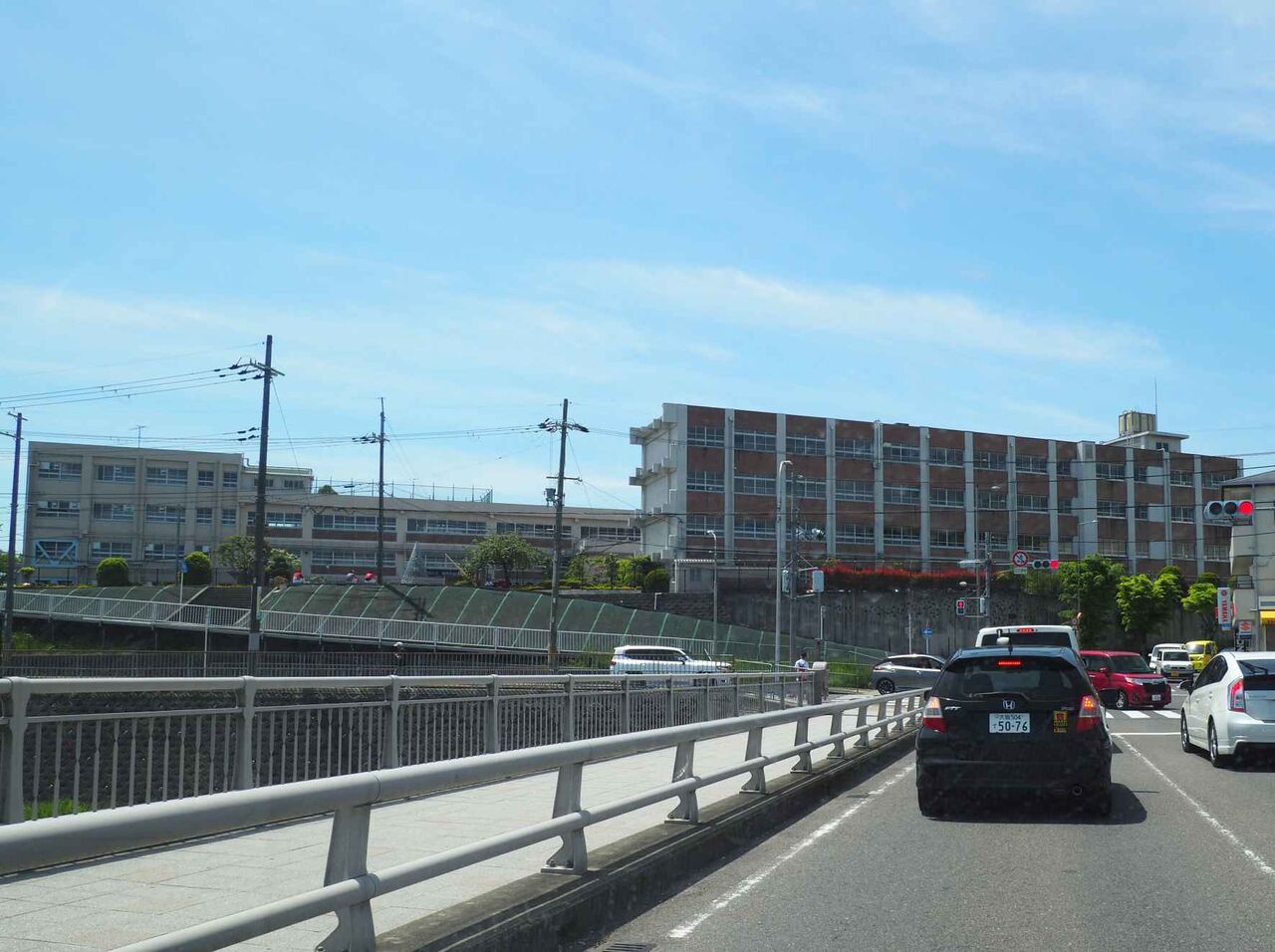 高槻市立第二中学校が写っていました。この校舎は昭和38年に建て替えされた校舎です。昭和37年の建て替え時には奥の校舎はありましたが、手前はまだ木造でした。