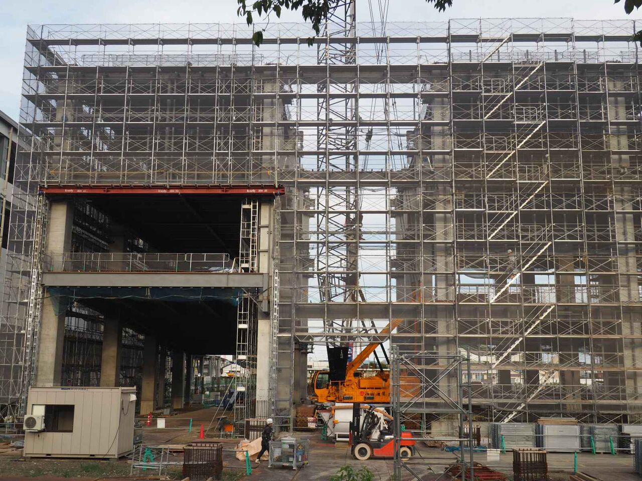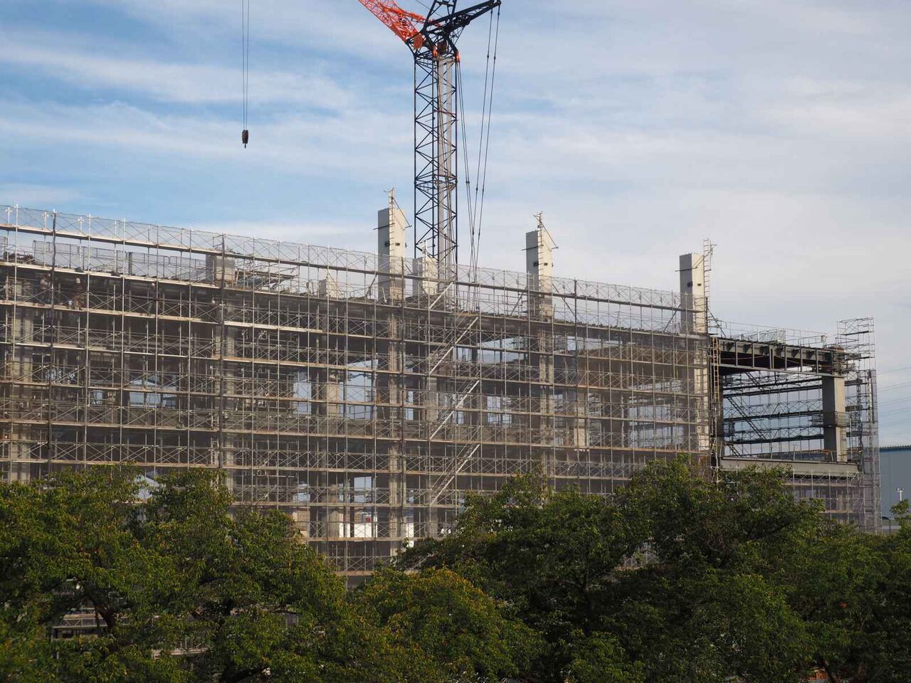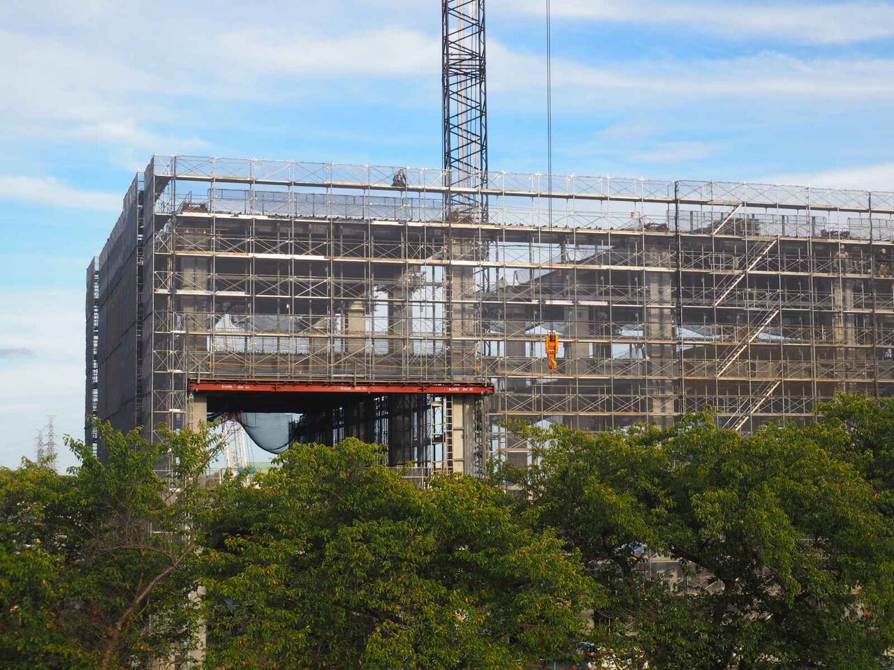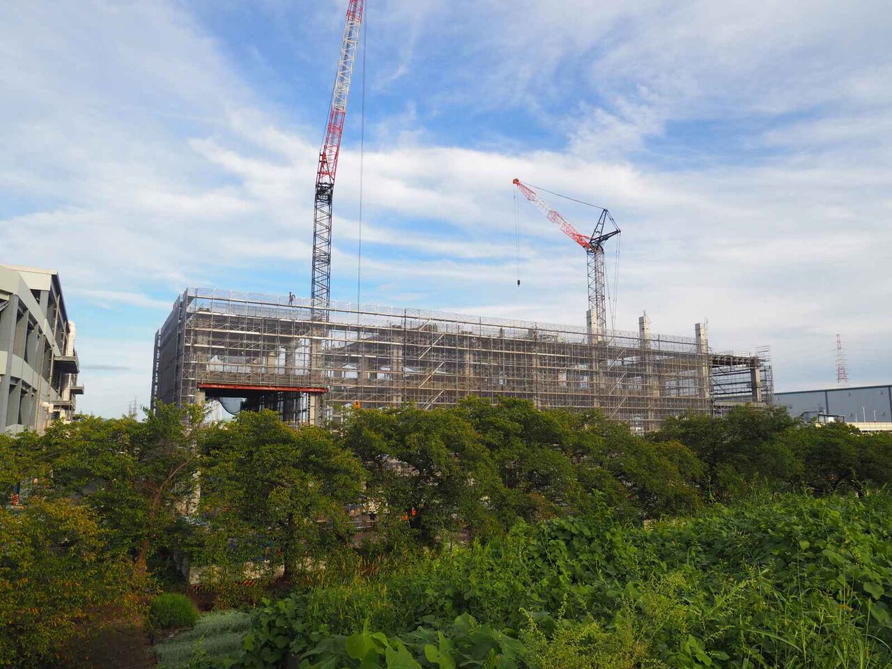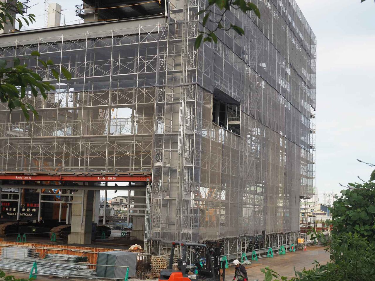 裏から建設が始まったんですが、表(府道沿い)の方まで骨格ができてきました。こちらも、ブロックのような鉄筋を積み上げる工法のようです。なので早い感じ。何やら左手には屋根までの高さのある大きな台車のような構造物もあるようです。移動するんでしょうか。こちらも変化がありましたら追記していきたいと思います。