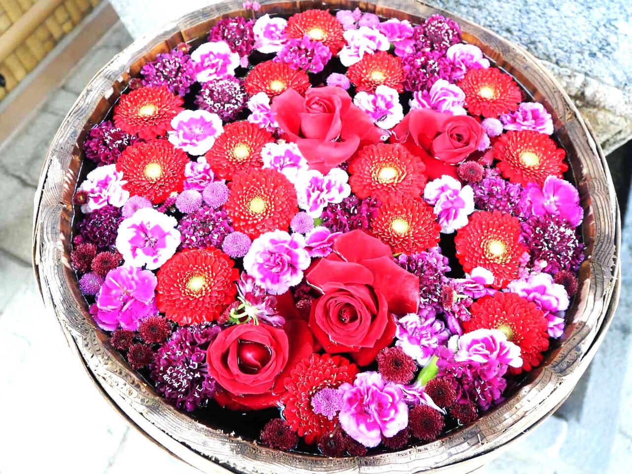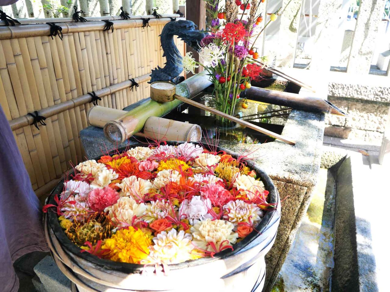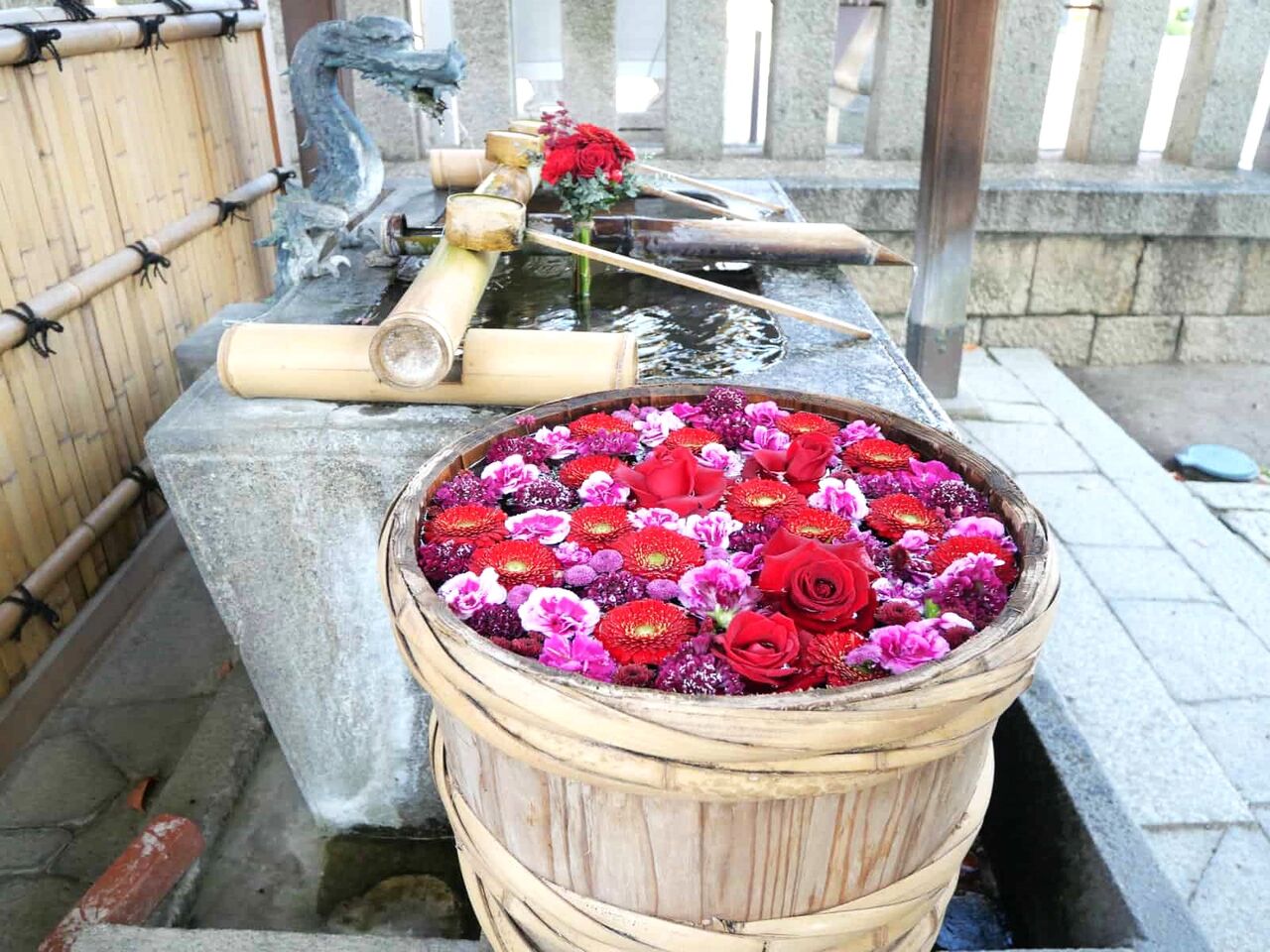 花手水は、ガーベラ、ダリア、カーネーション、バラなどがありました。