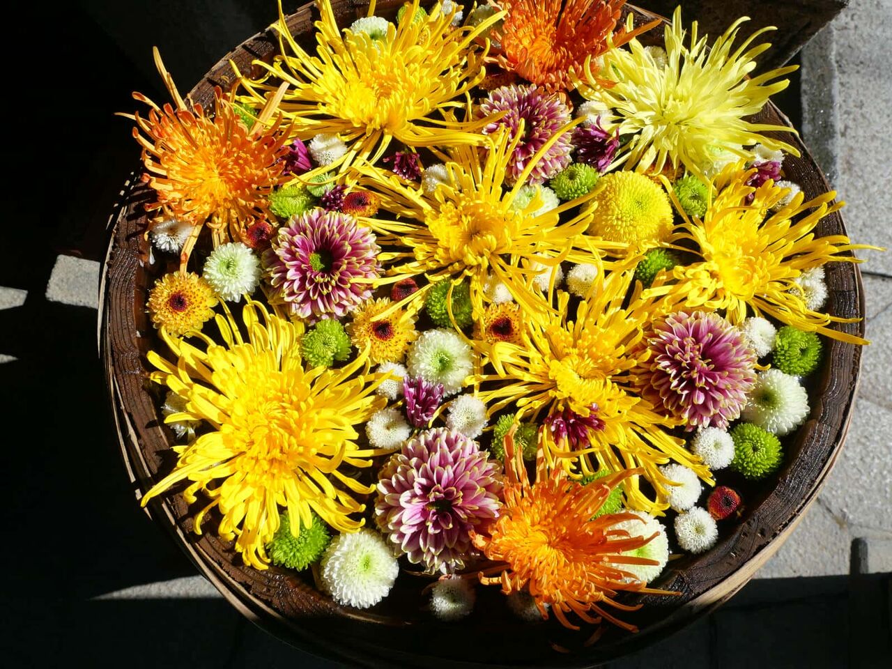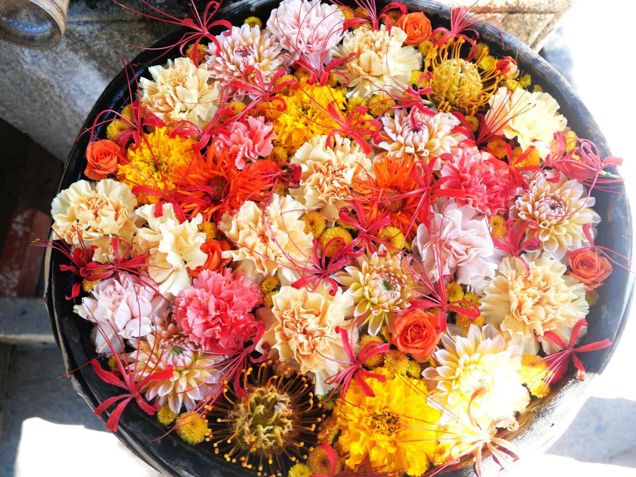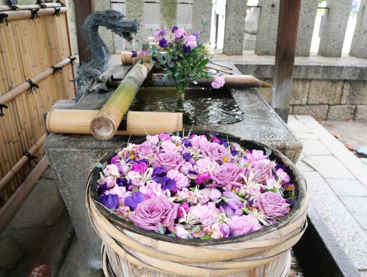 花手水は、ガーベラ、ダリア、カーネーション、バラなどがありました。