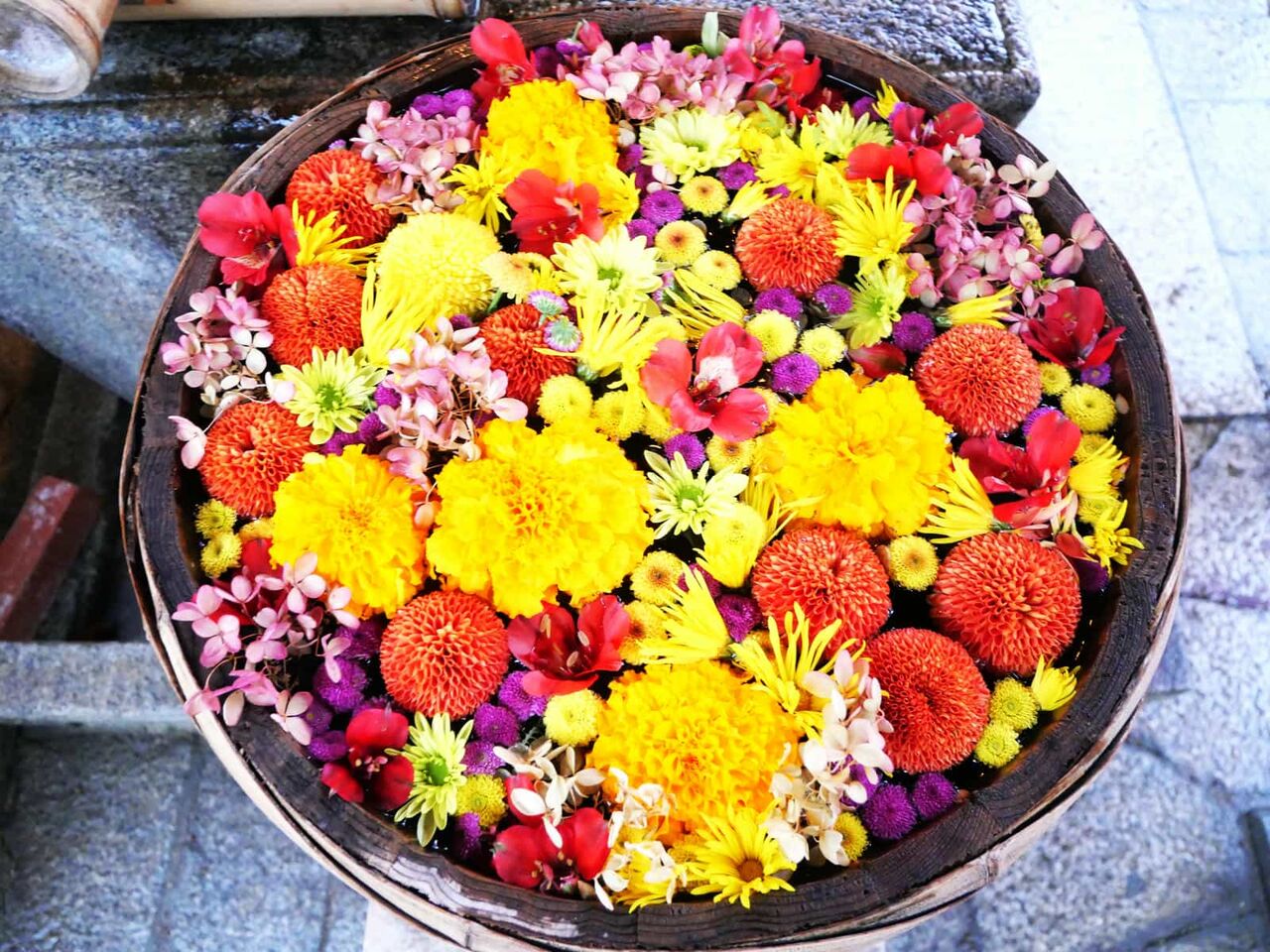 カラフルで元気いっぱいの花手水#高槻 #茨木 #吹田 #枚方 #高槻市 #高槻花屋 #高槻市営葬儀 #御朱印 #パワースポット #神社仏閣 #大阪観光 #泣き相撲 #花手水 #野見神社 #石田花店 pic.twitter.com/GxleVmCeP3