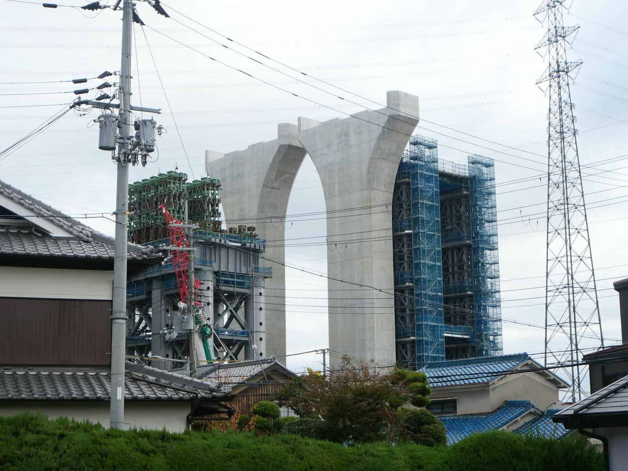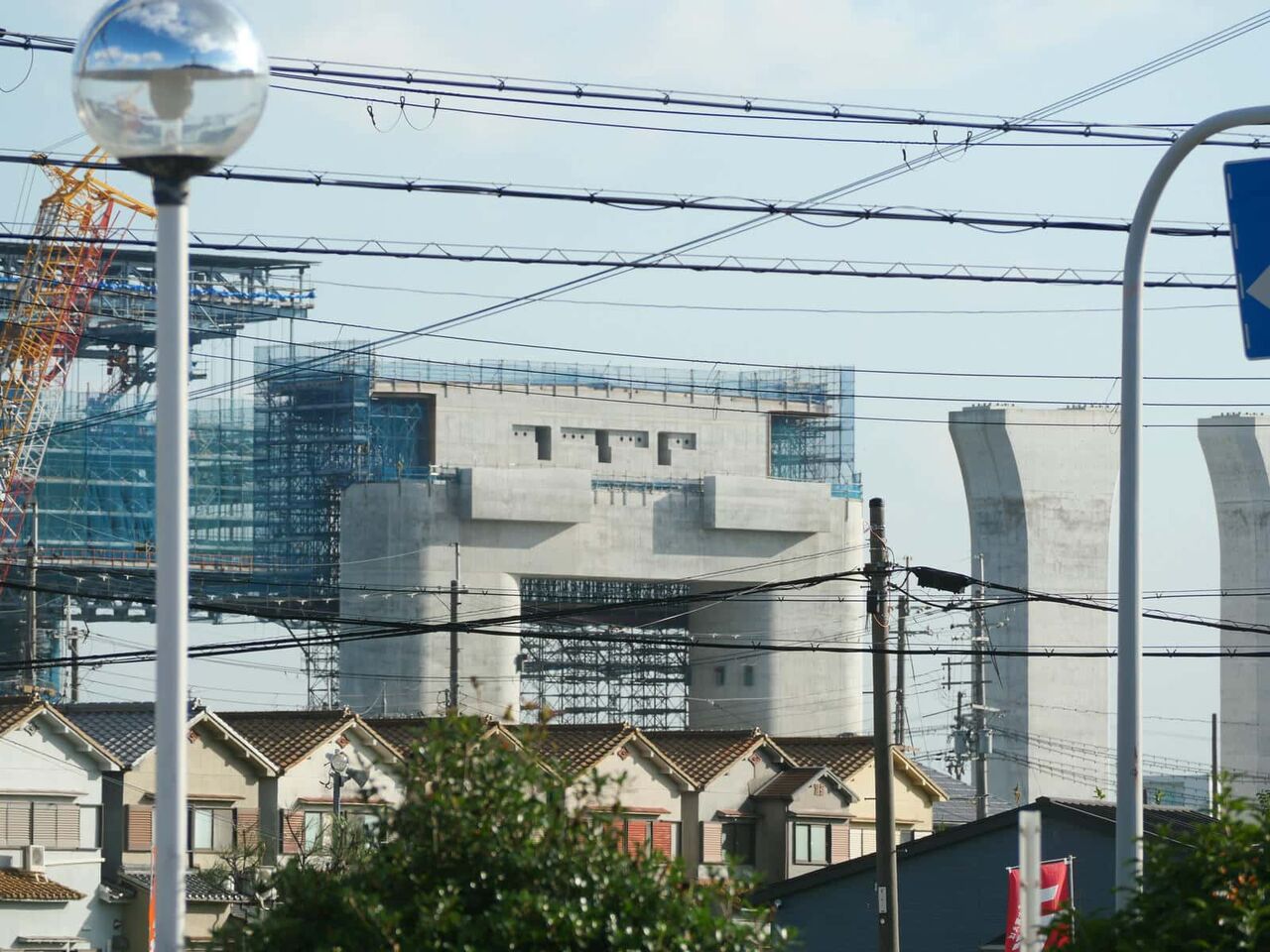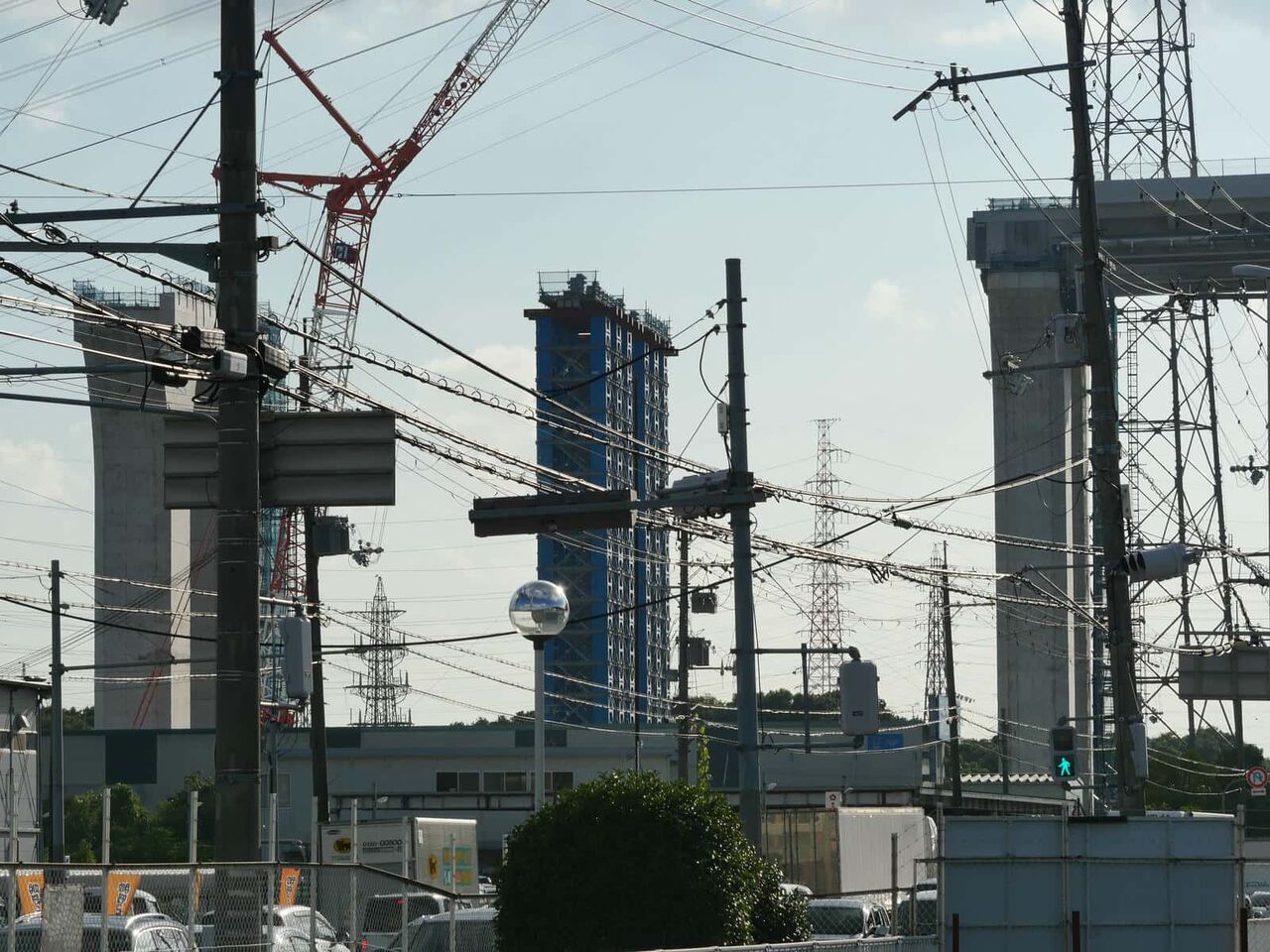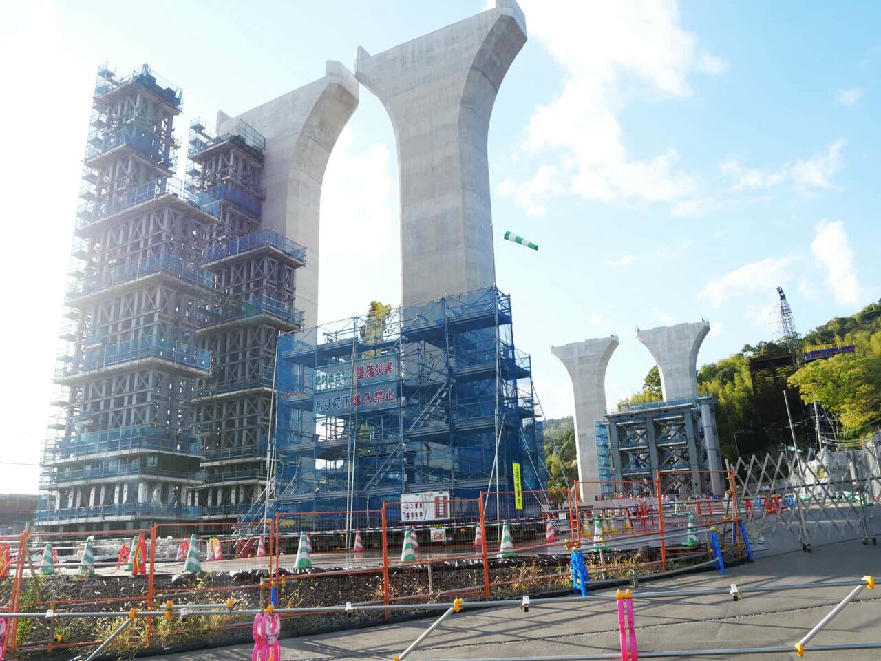 JRからの1本目と2本目の間にも、謎の丸い柱の仮の橋脚ができてきています。ここを足場にして橋梁工事をするとみられます。高さが高いので上から置いたり、筒状の橋梁をつなぐことはできないのではないでしょうか。