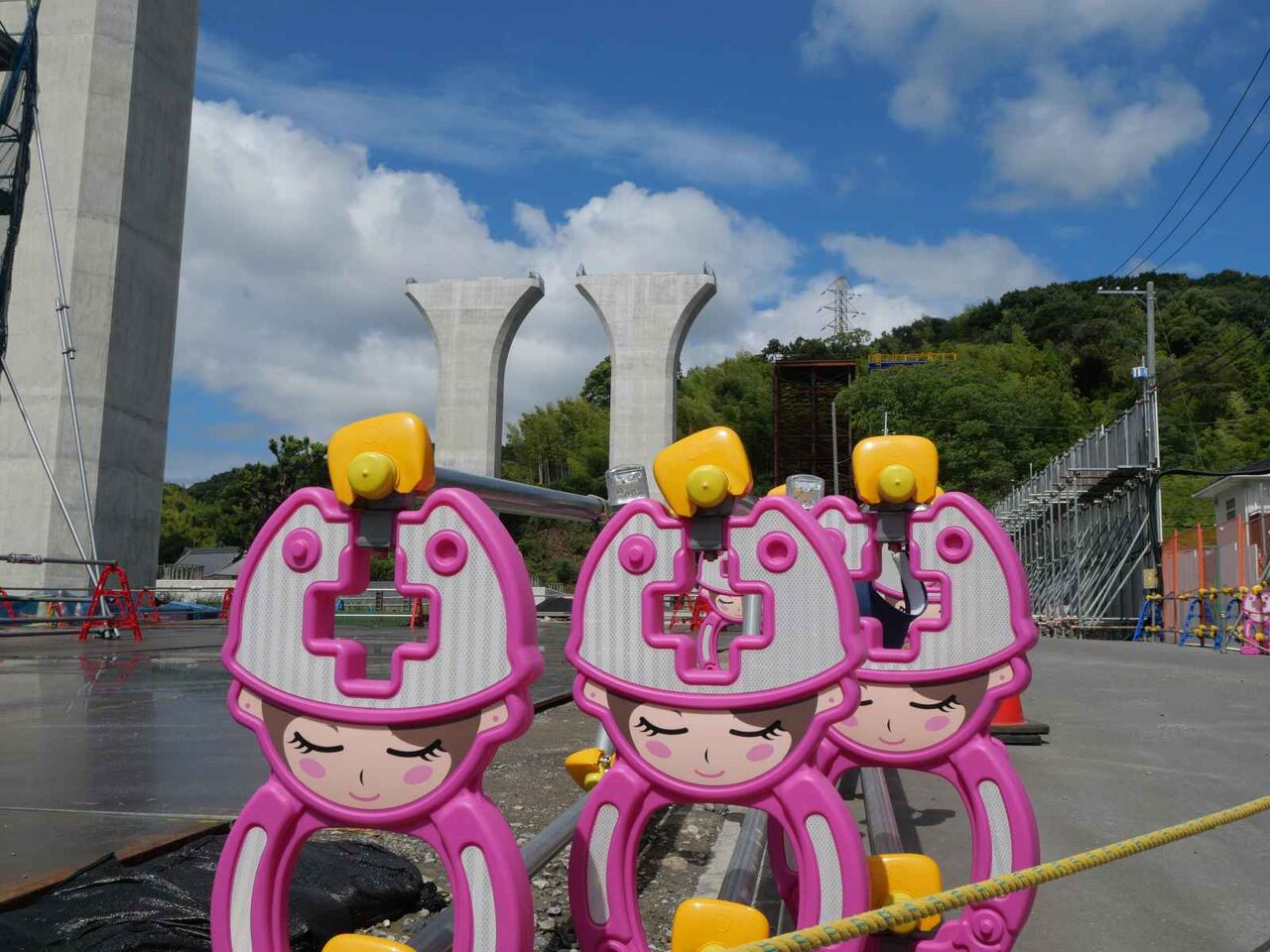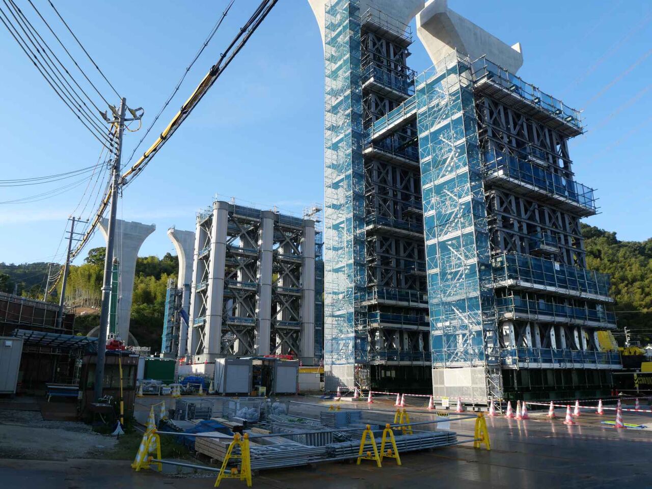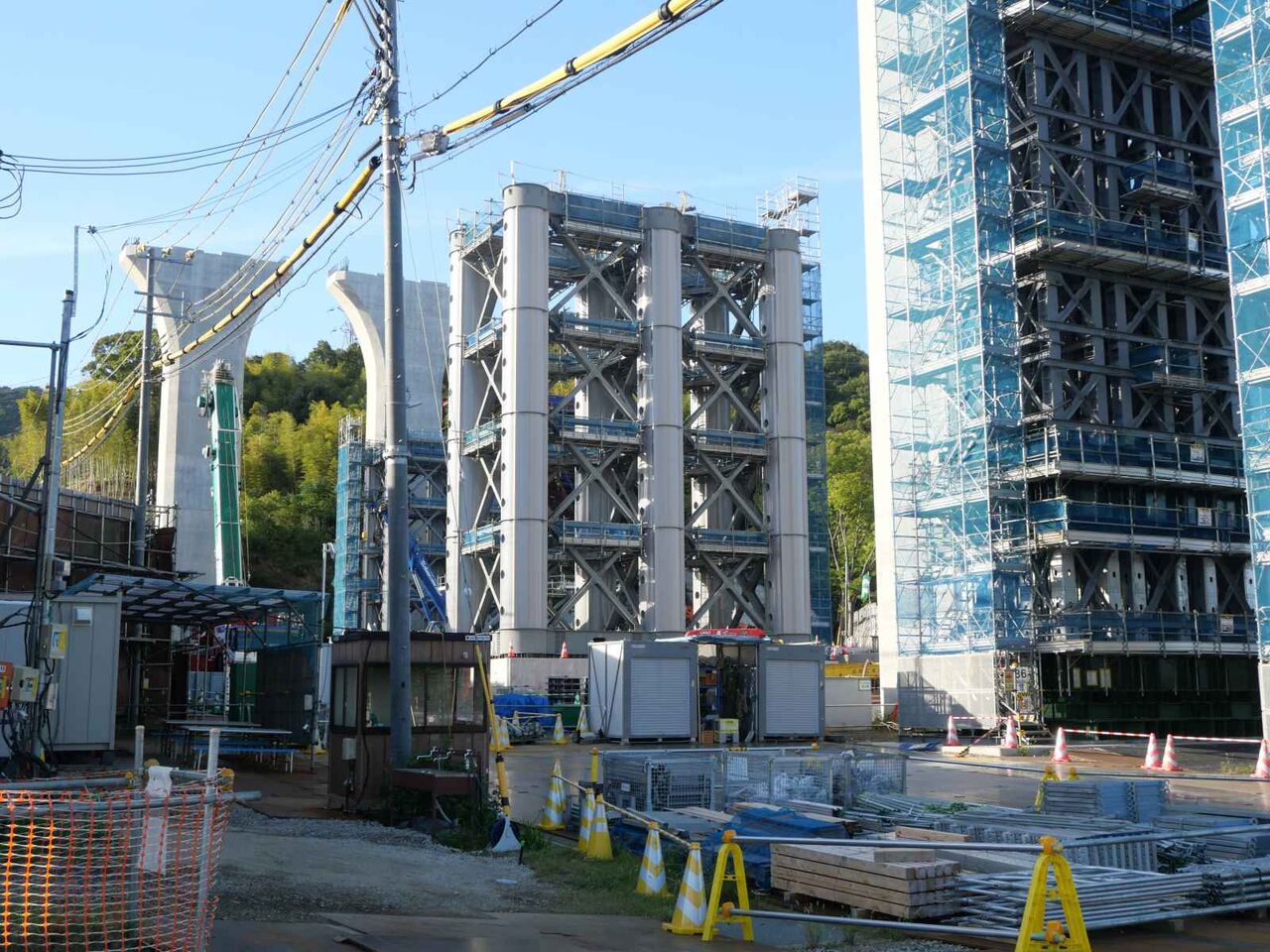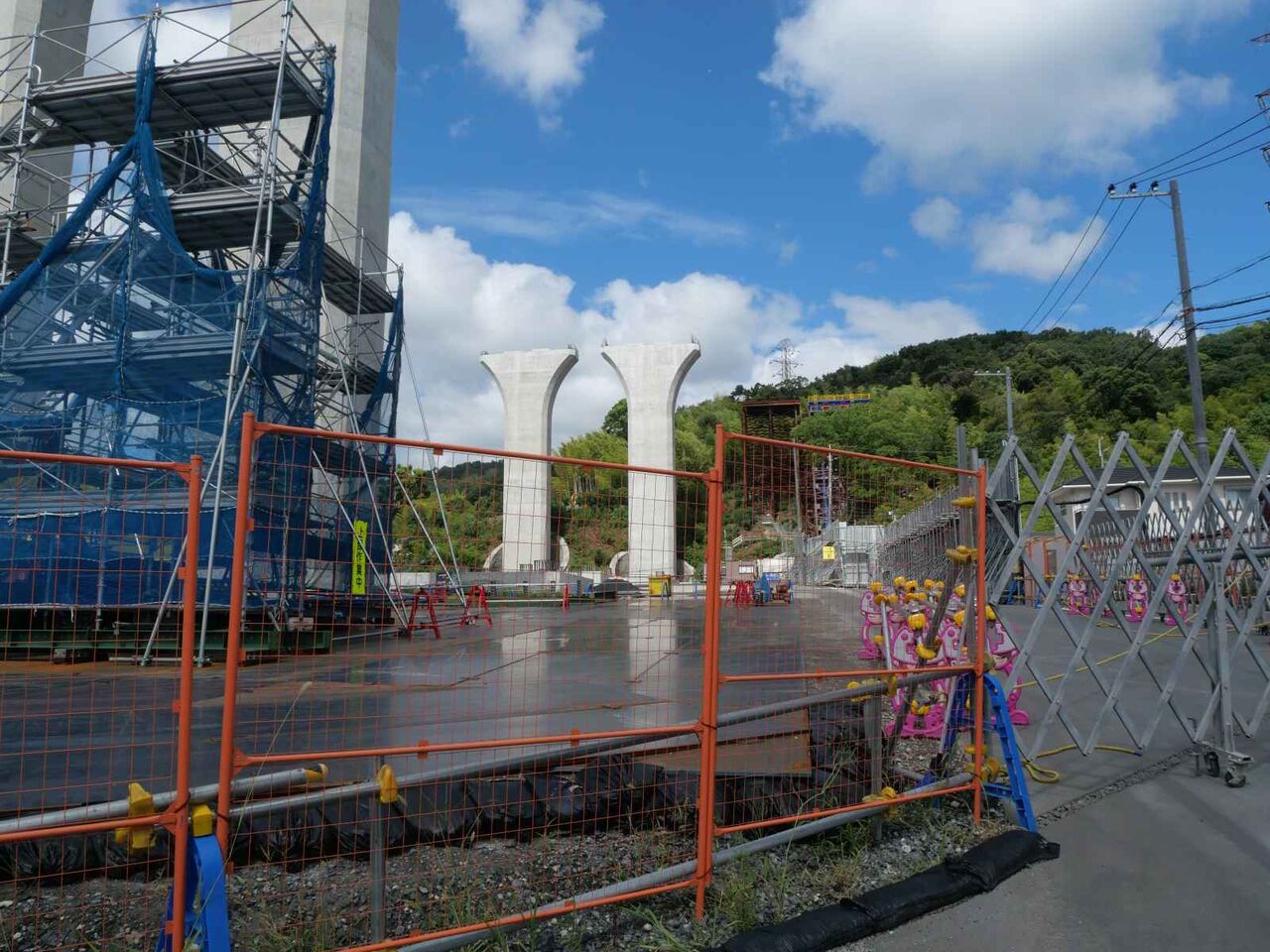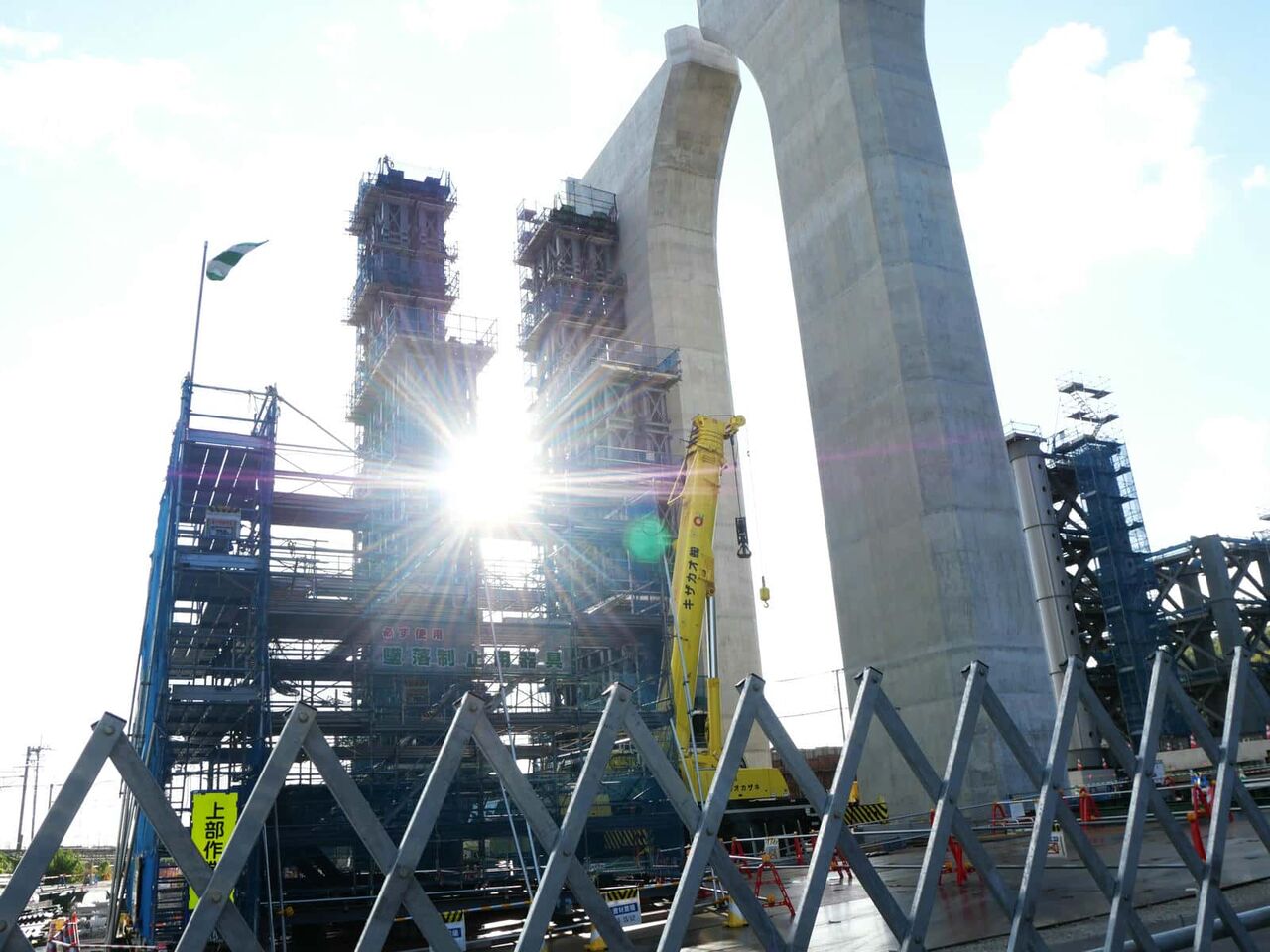 2列に櫓が組まれています。今後ここをベースに橋梁の組み立て+線路の部分のスライド方式をするのでしょうか?