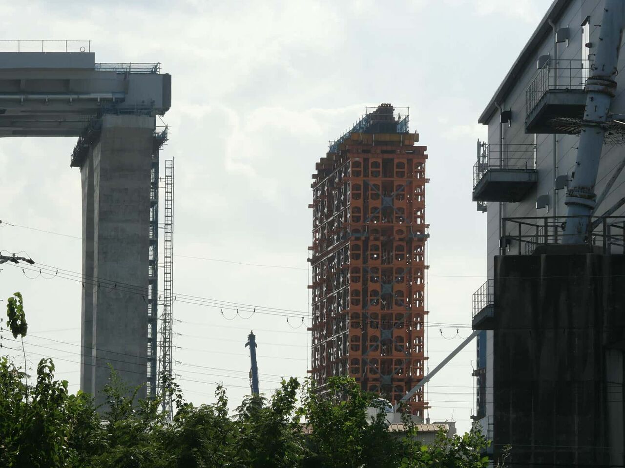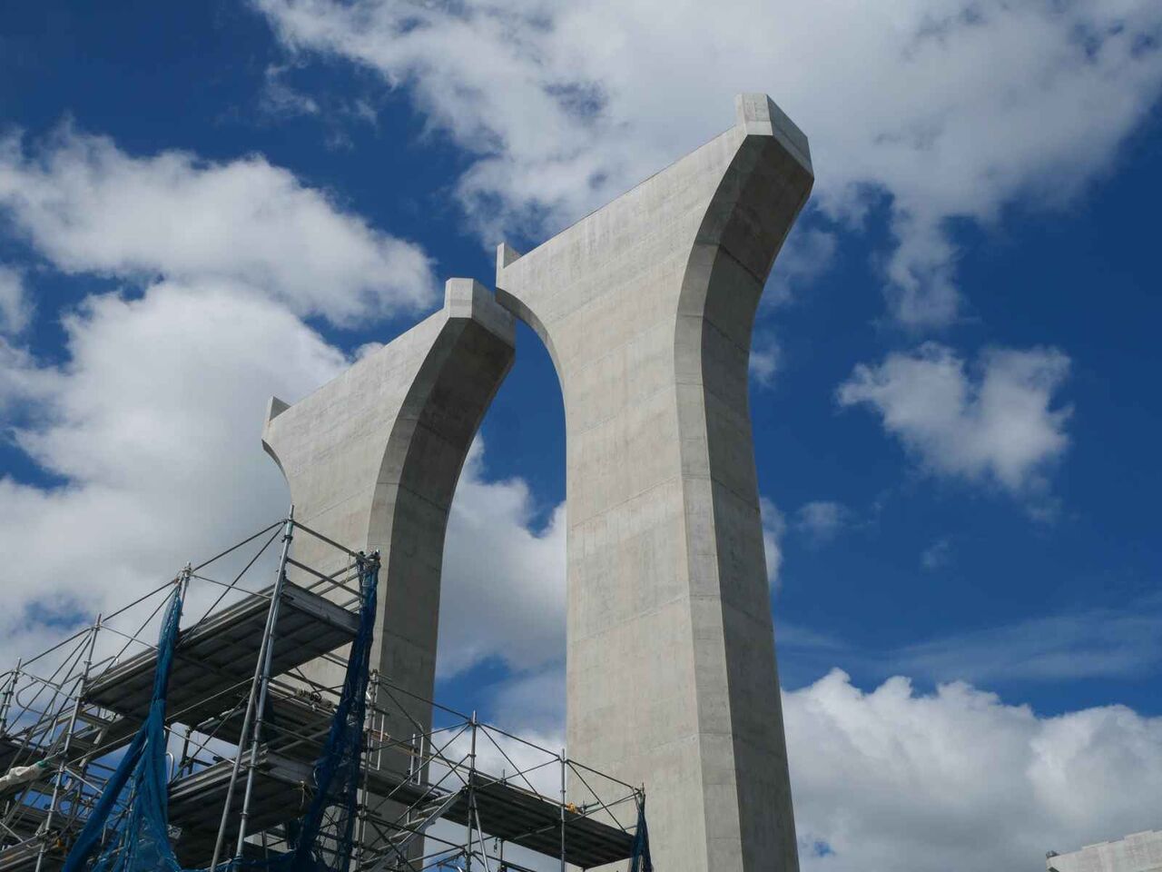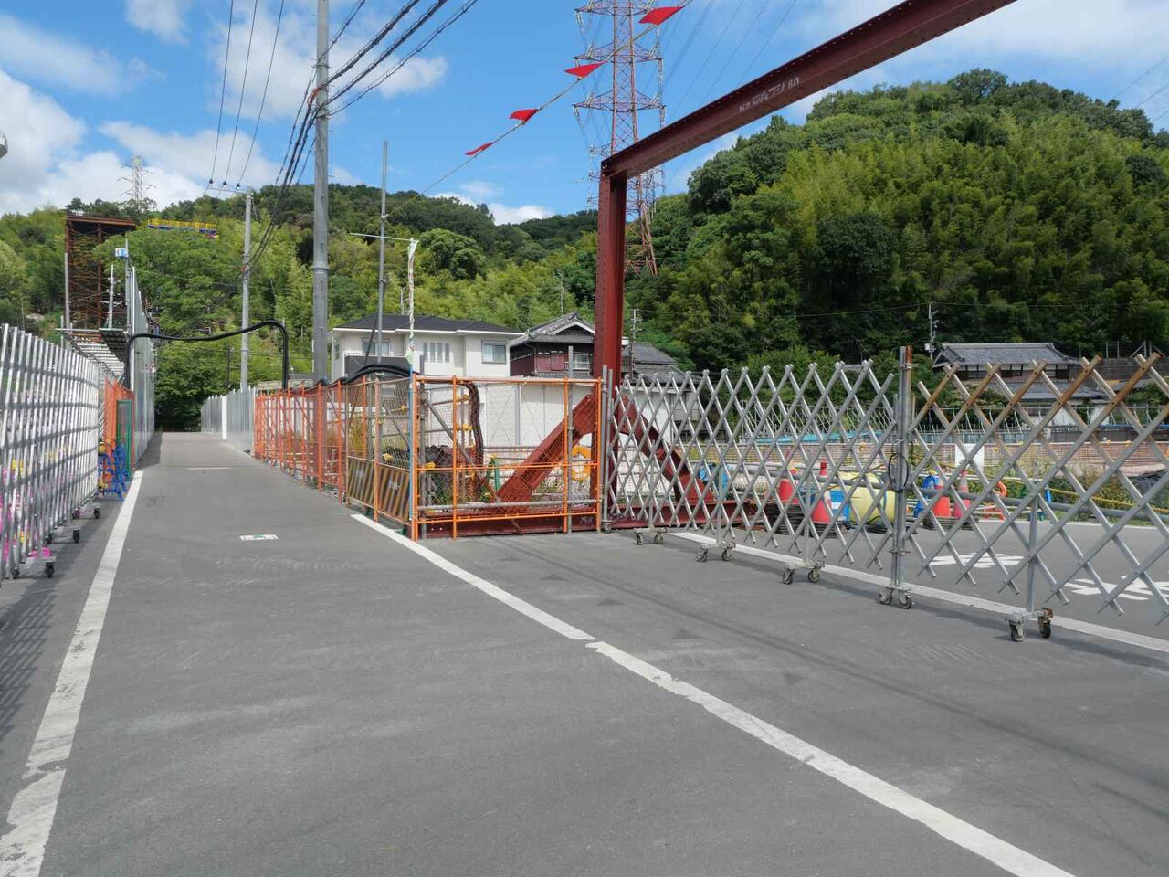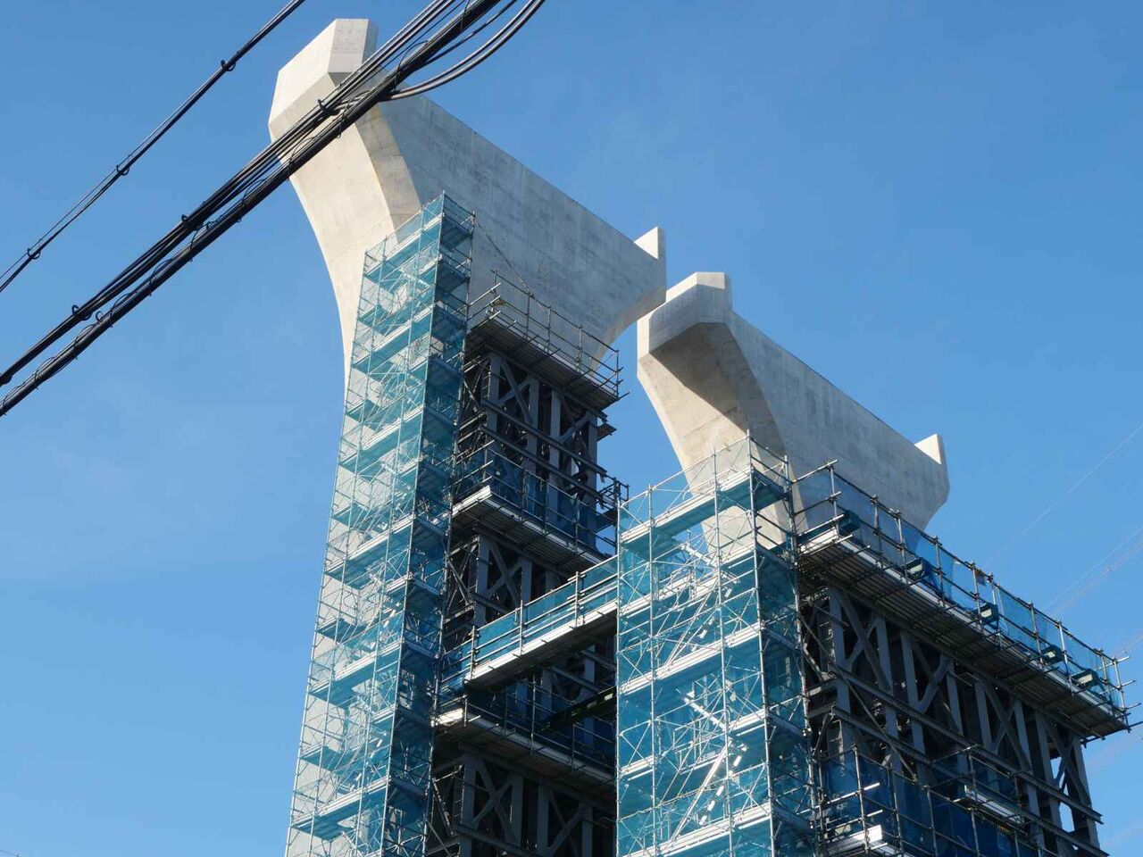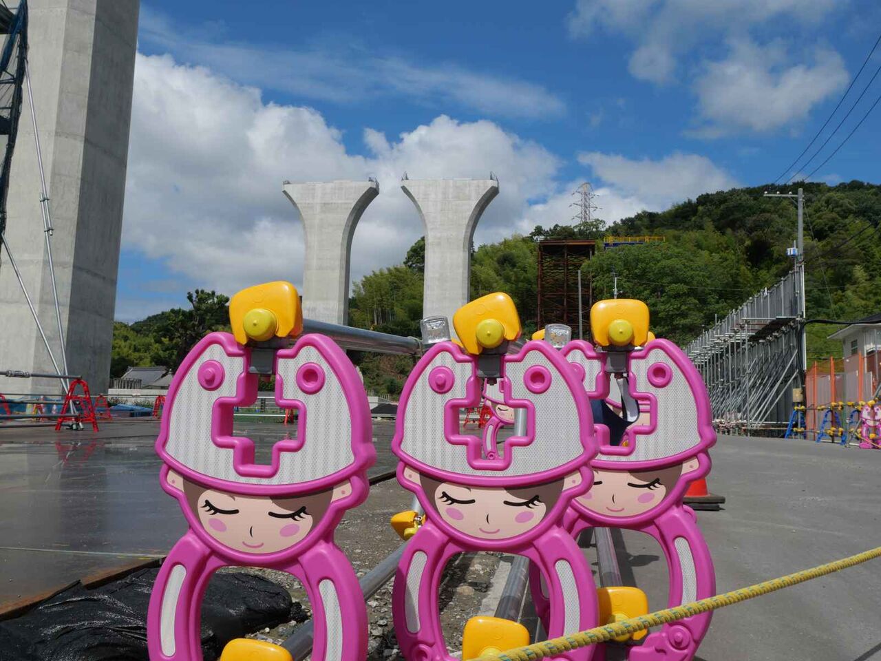 2列に櫓が組まれています。今後ここをベースに橋梁の組み立て+線路の部分のスライド方式をするのでしょうか?