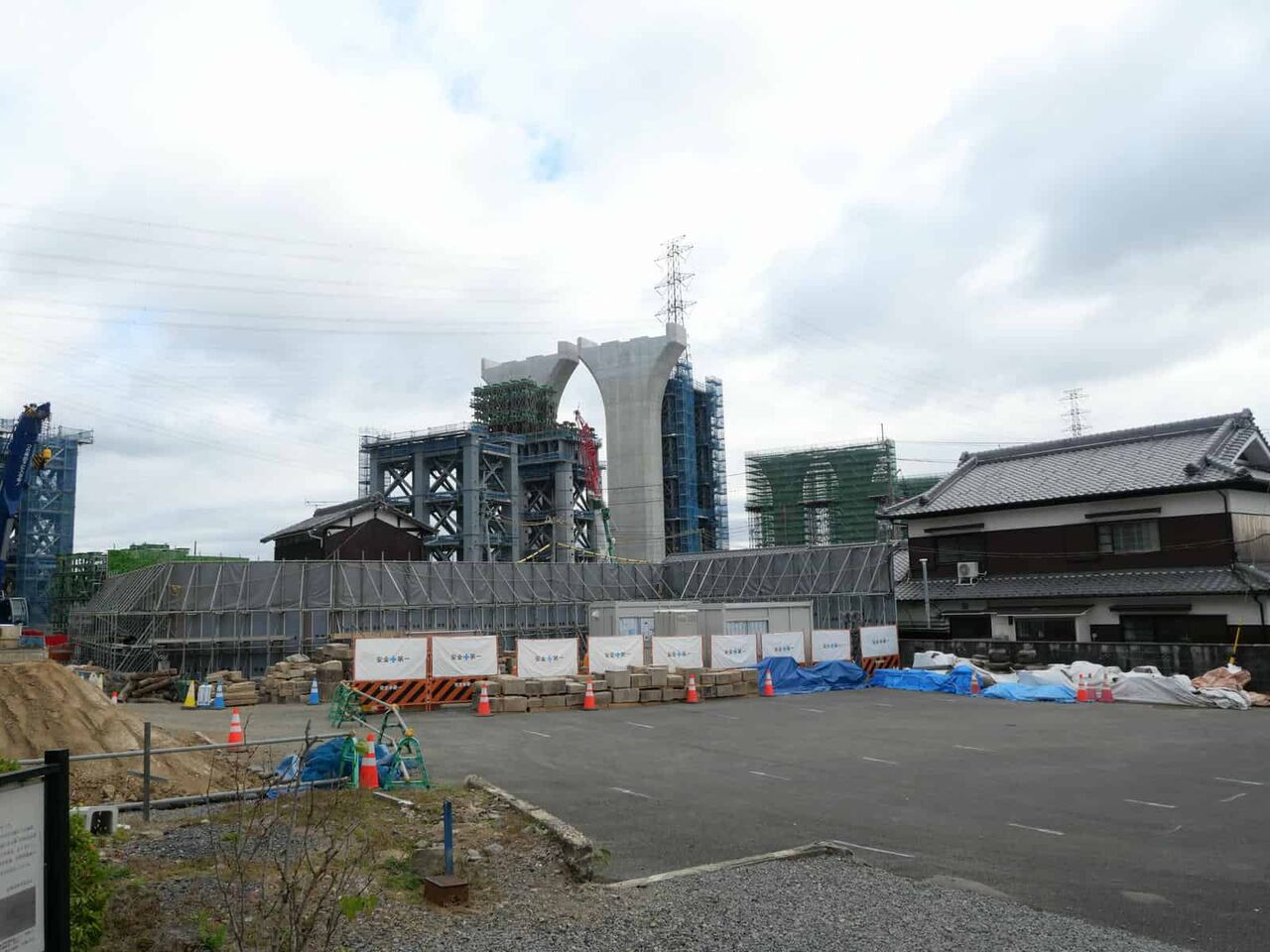 JRの北側の1本目の橋脚 すぐそばに青色の橋脚が建設中です。前回よりも少し高いところまで進んだよう。