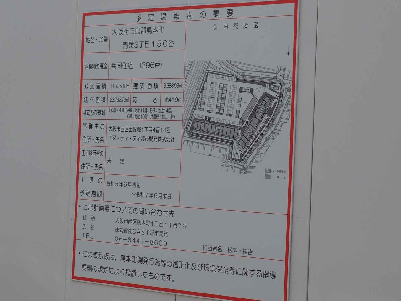 島本町の西国街道沿いですが、14階建て2棟、10階建て1棟、296戸の大きな共同住宅ができるみたいです。場所は西国街道沿い、上牧と島本町の間。NTT西日本島本寮の建物あとです。