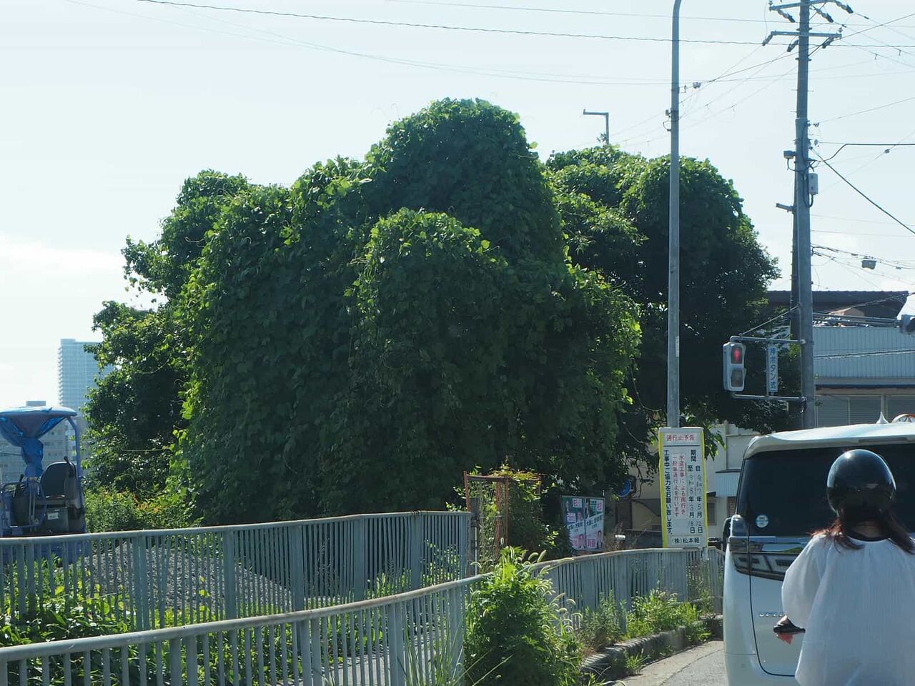 今回は、門前橋の街灯にクズの葉が迫っている様子を見かけました。その前の歩行者信号もクズに覆われようとしています。