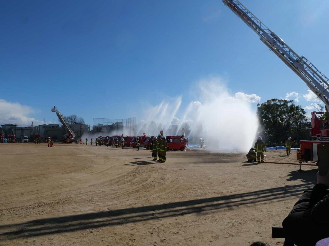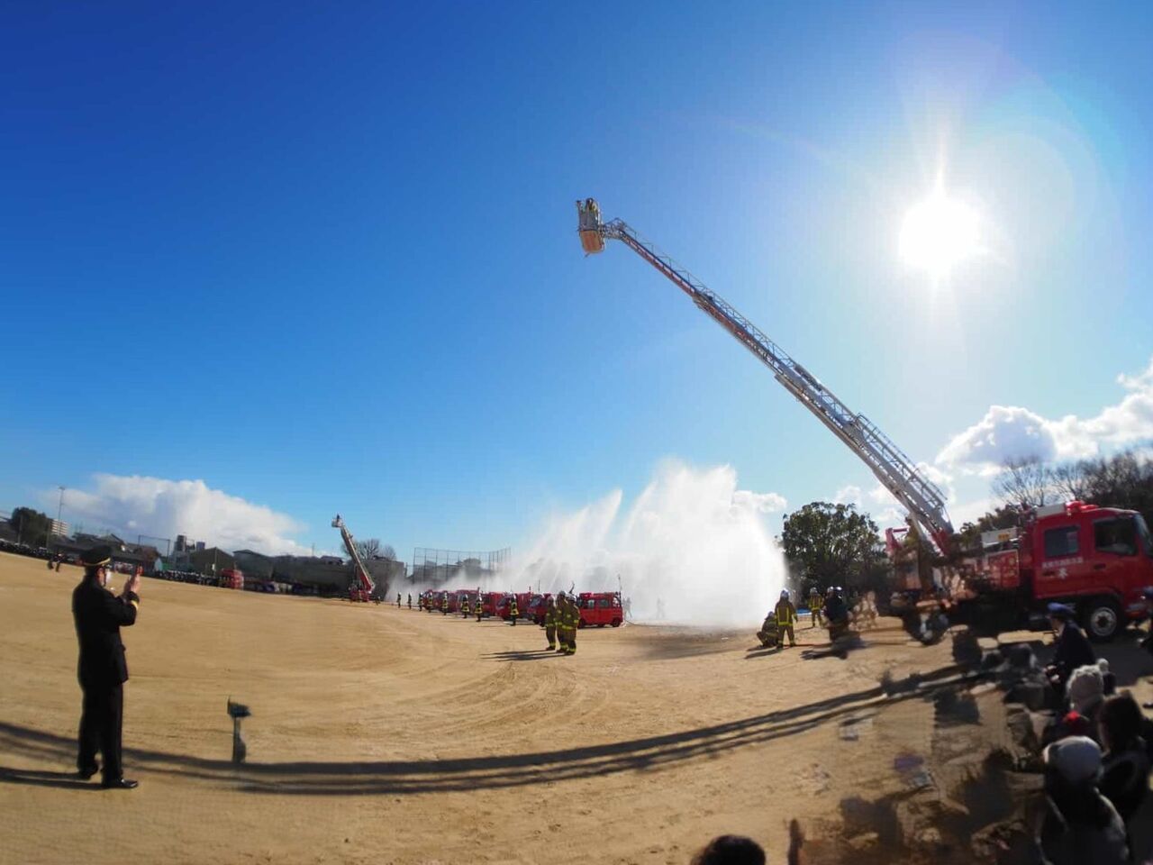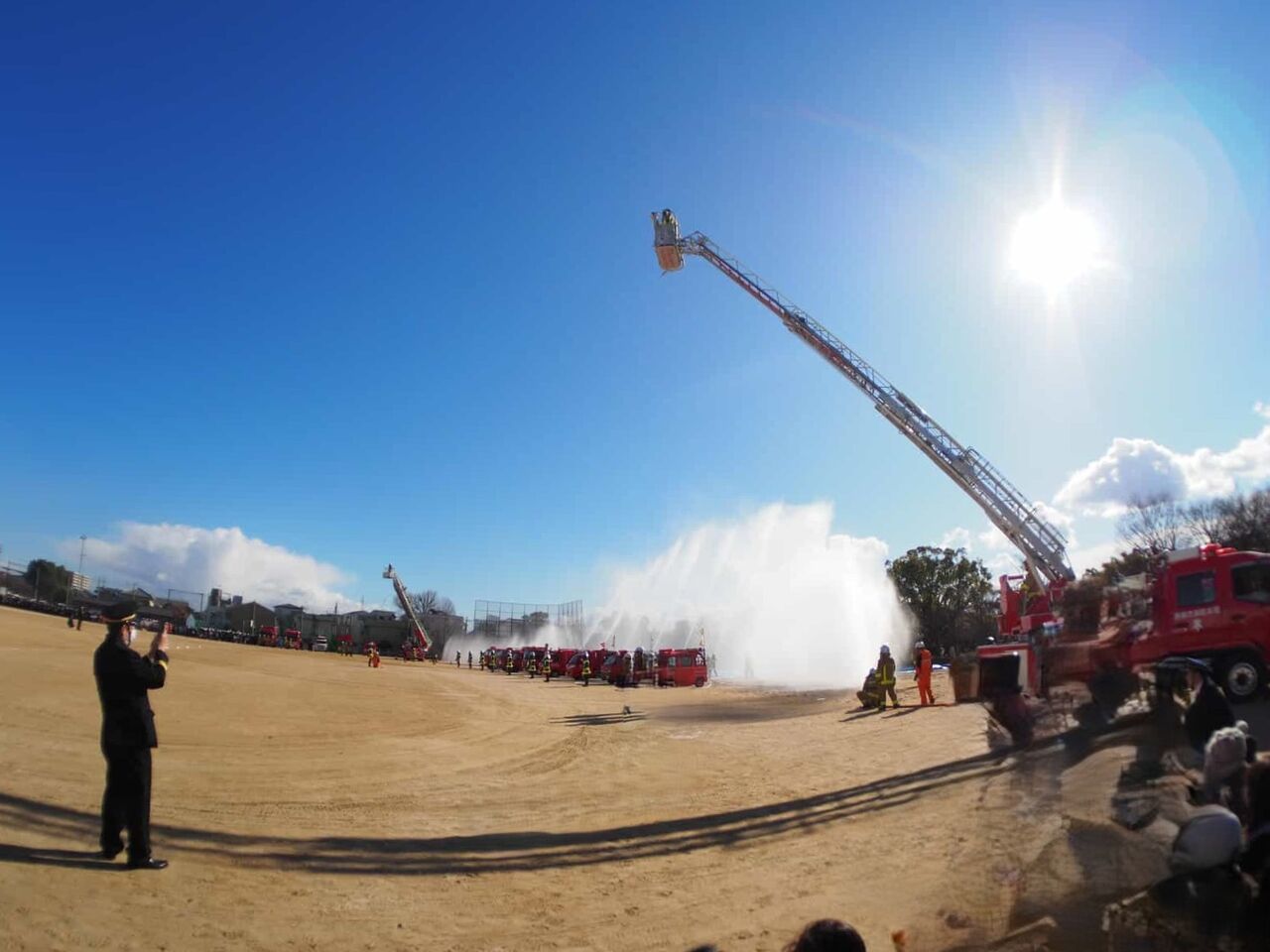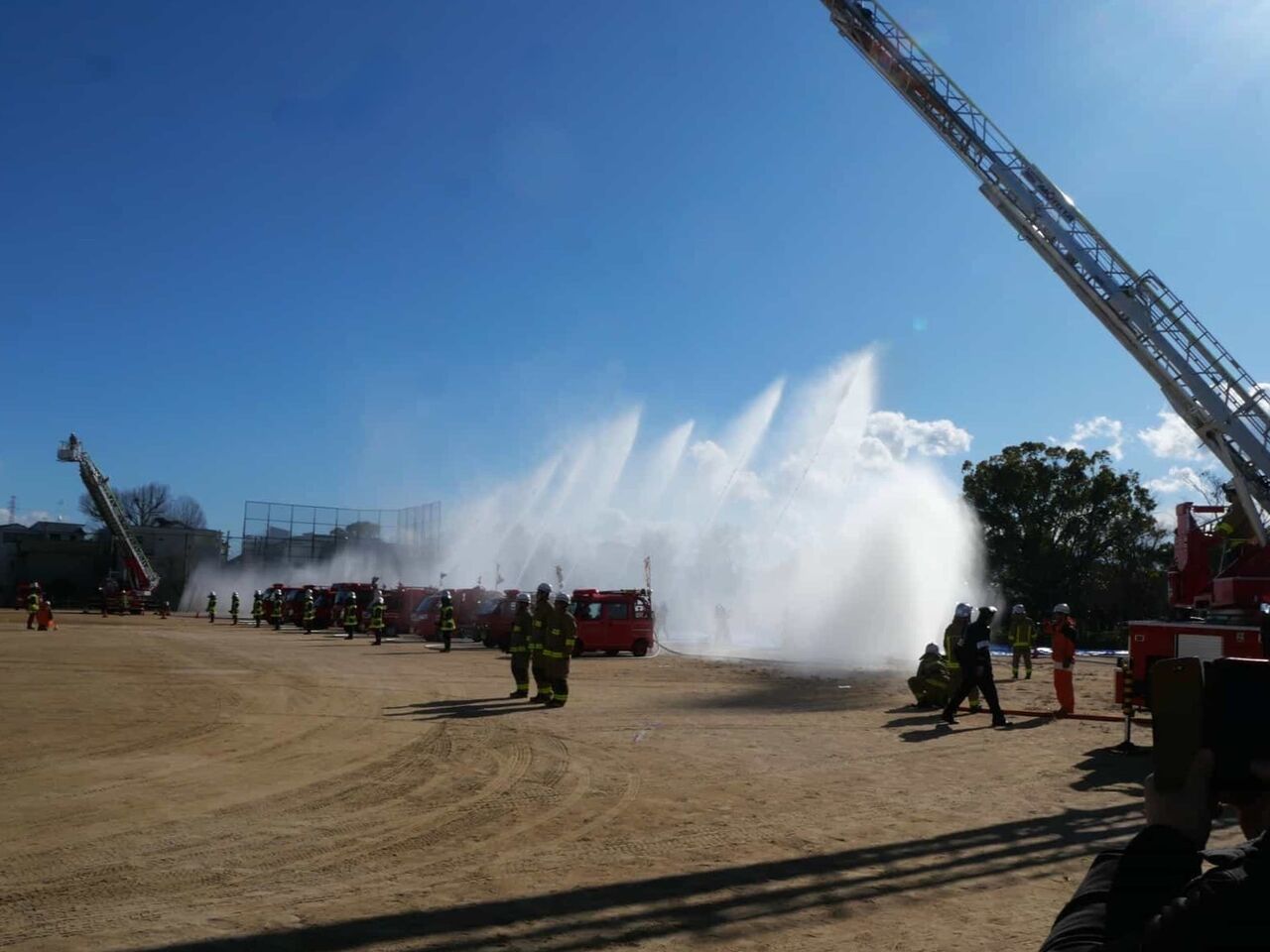 今回は、消防訓練のようすは省略されて、一斉放水については、近くで見られることに。
