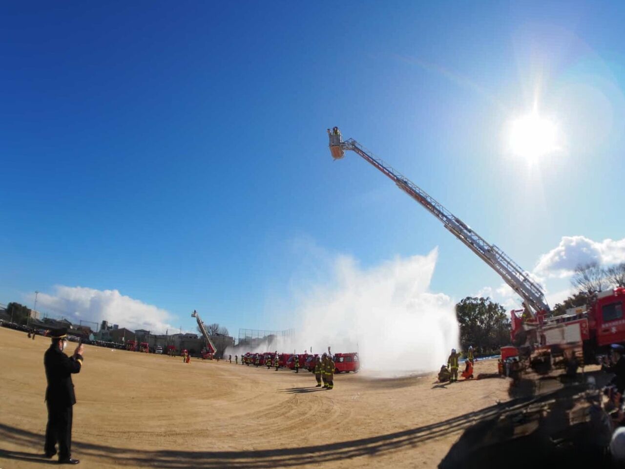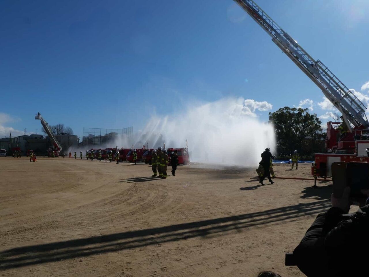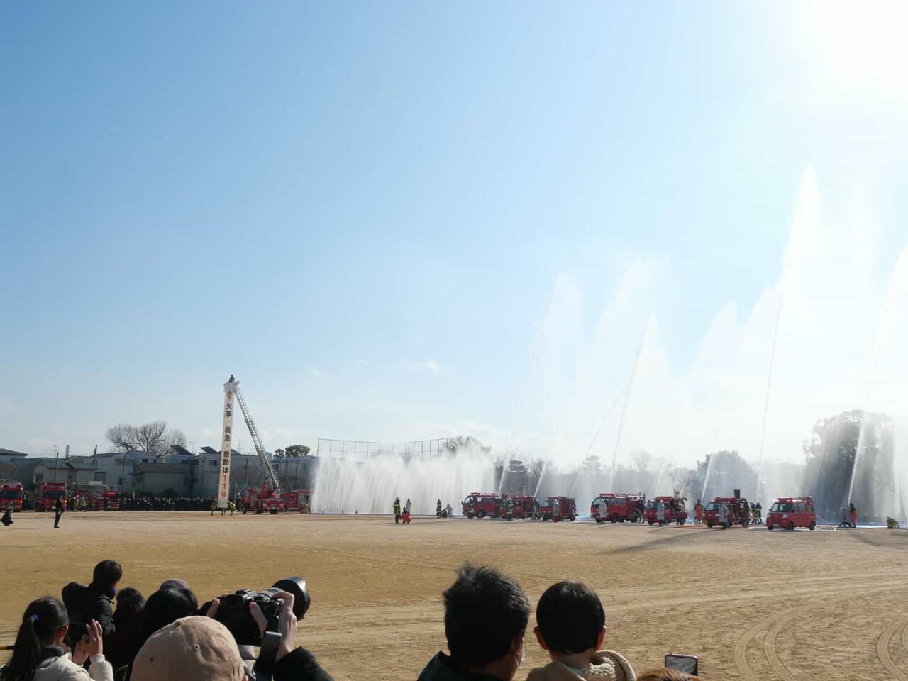 今回は、消防訓練のようすは省略されて、一斉放水については、近くで見られることに。
