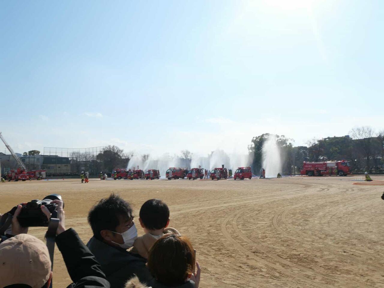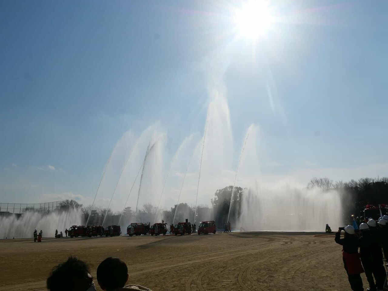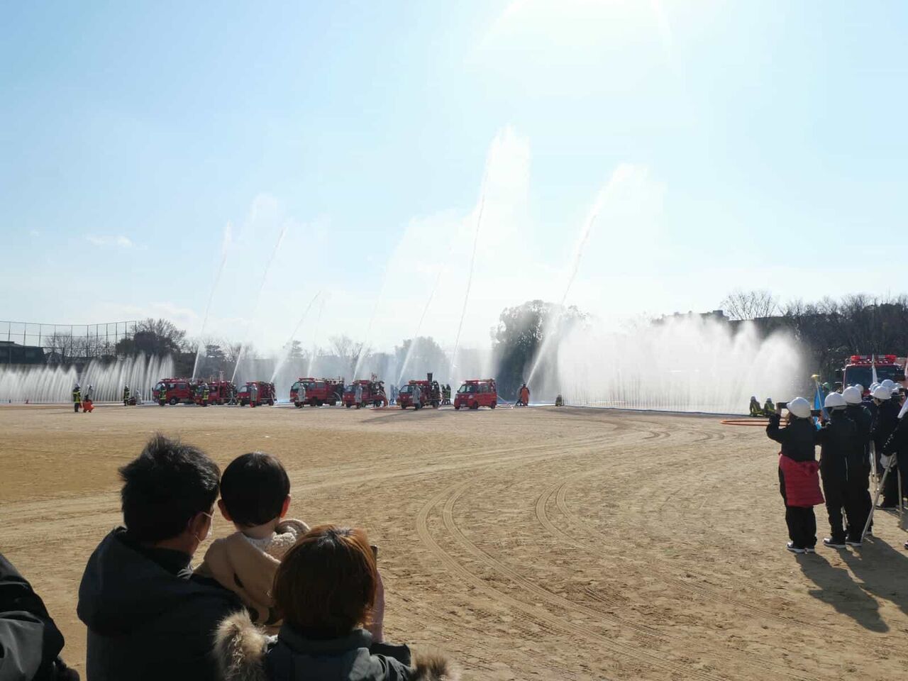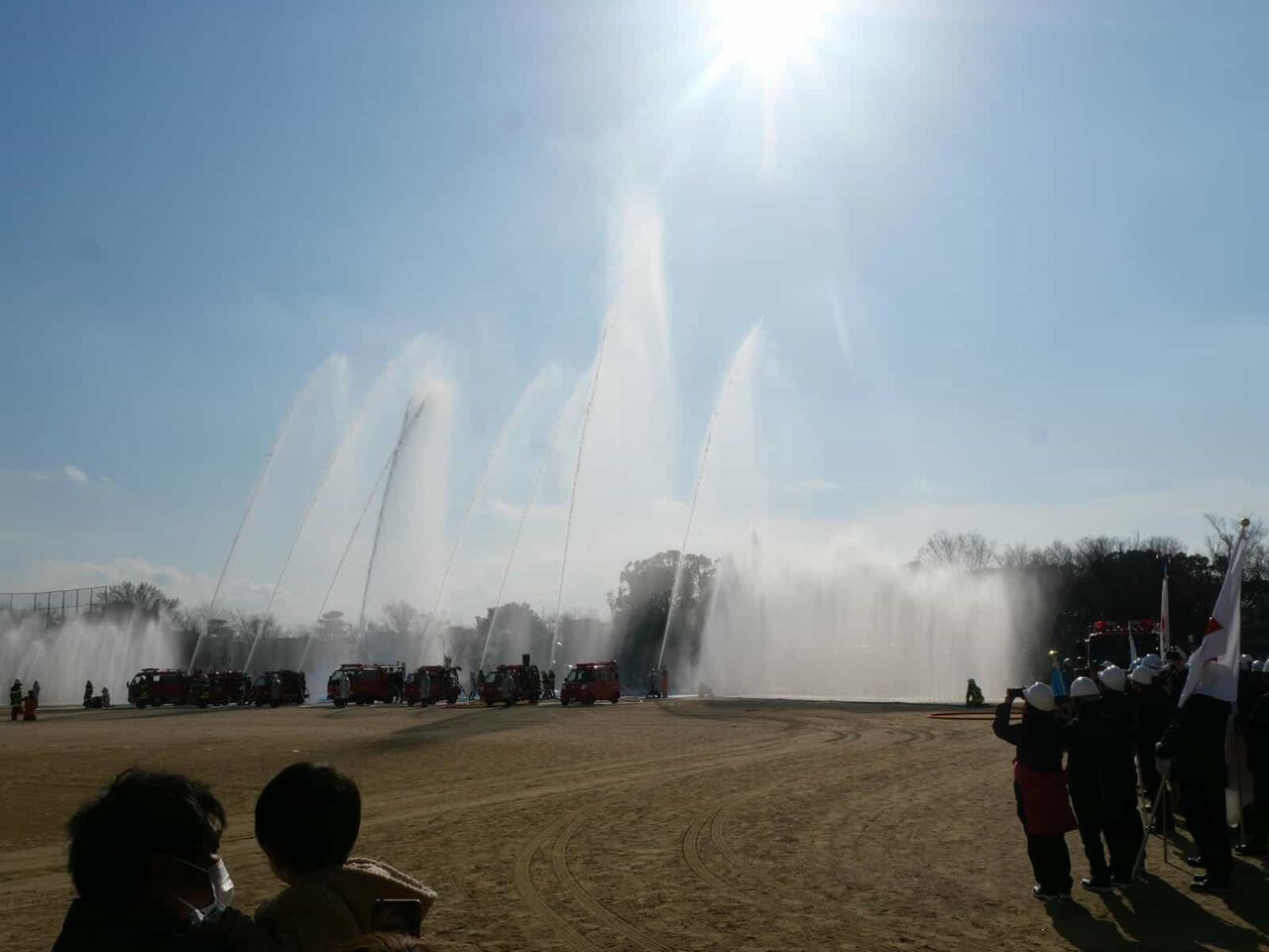 今回は、消防訓練のようすは省略されて、一斉放水については、近くで見られることに。