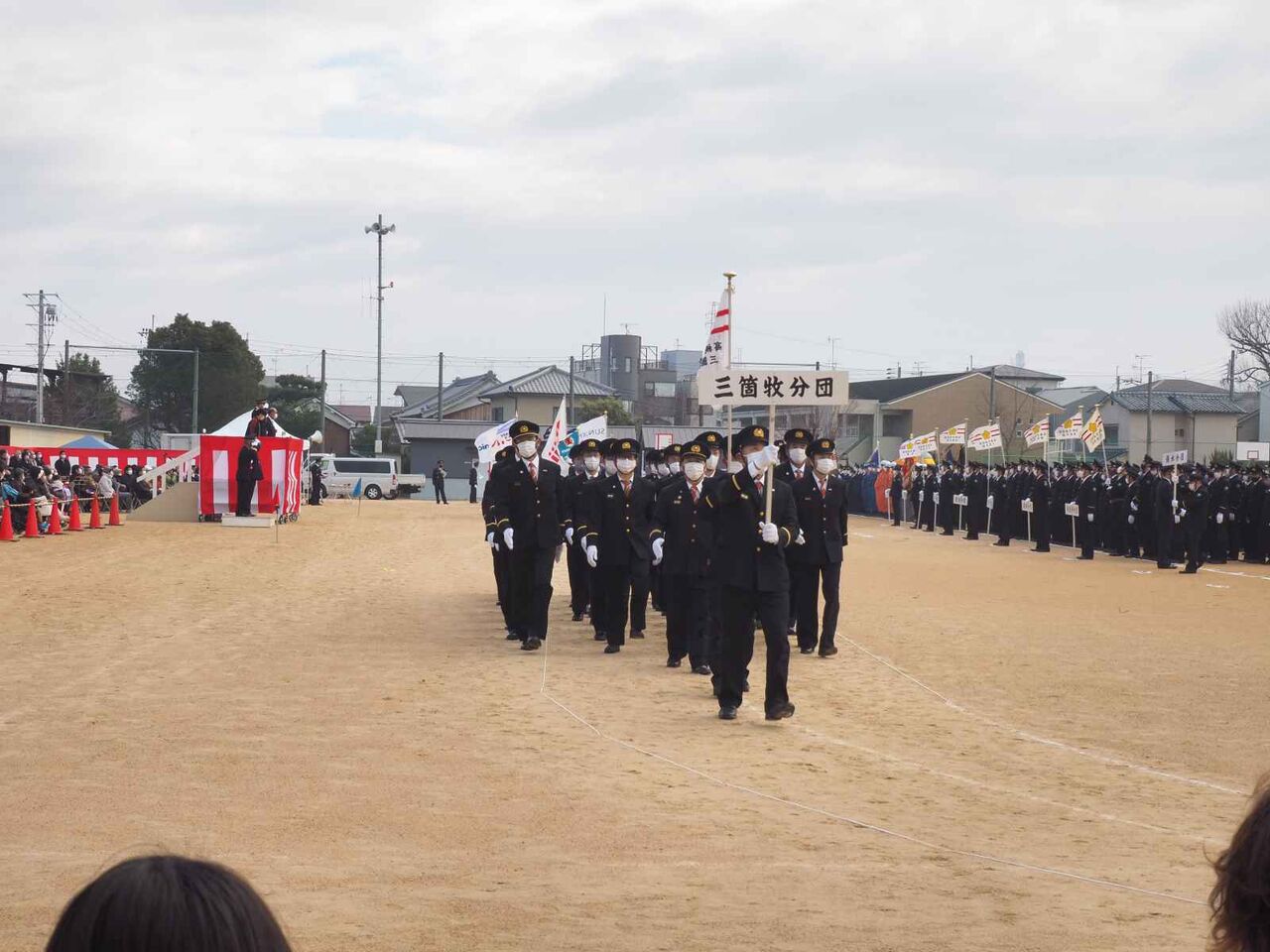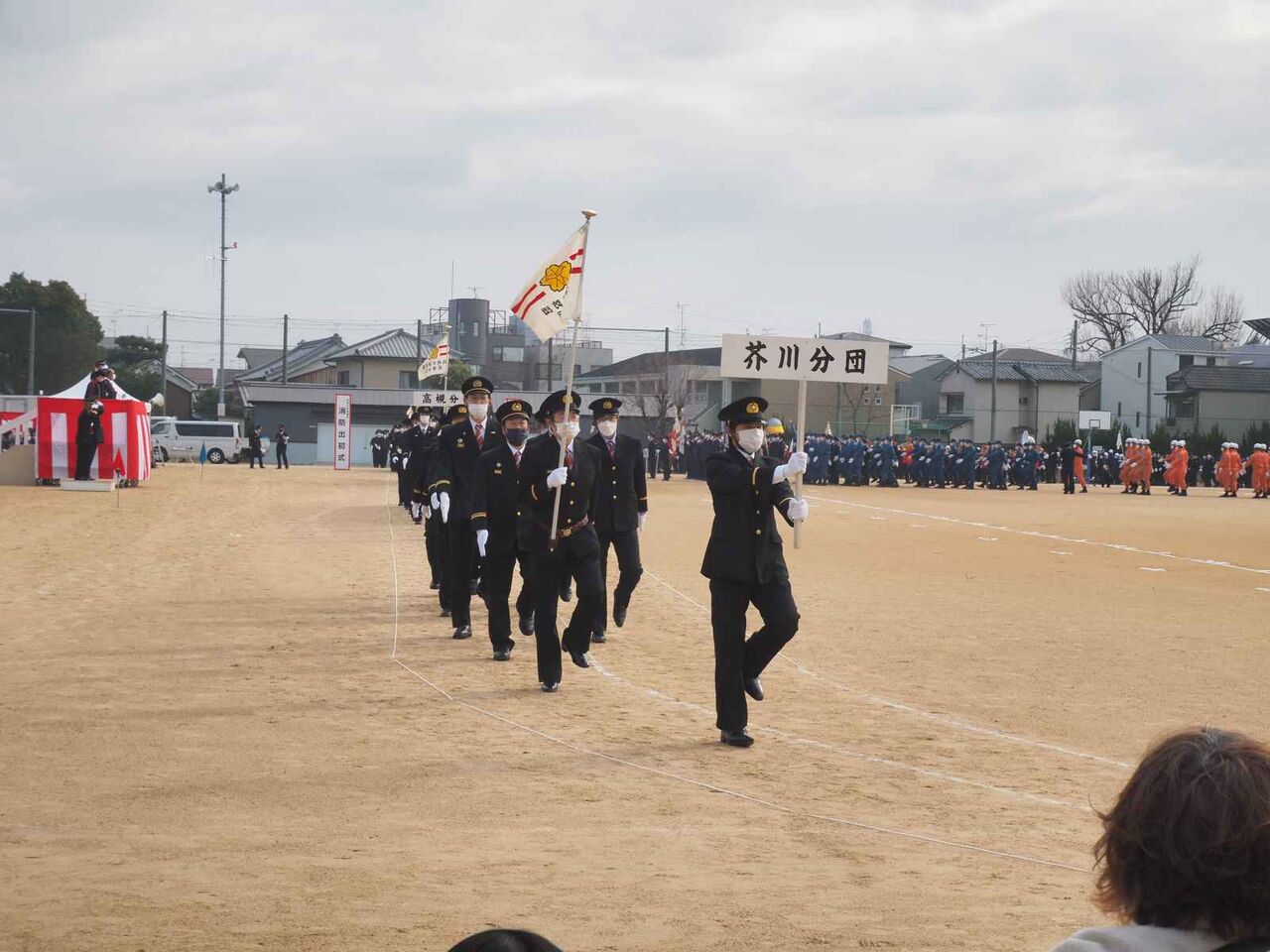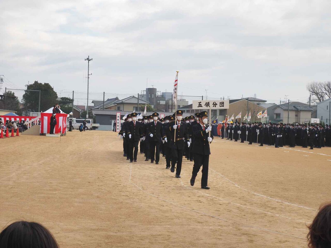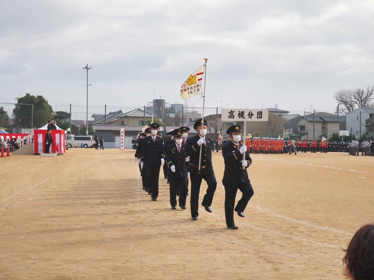 行進が終わった後、国旗掲揚、消防関係の物故者への黙とうがあり、
