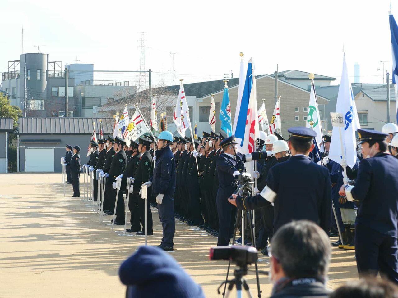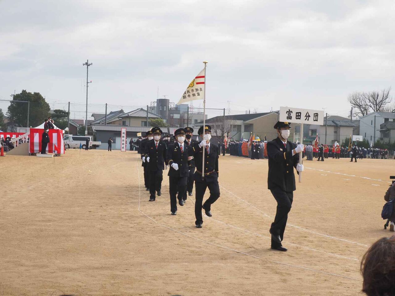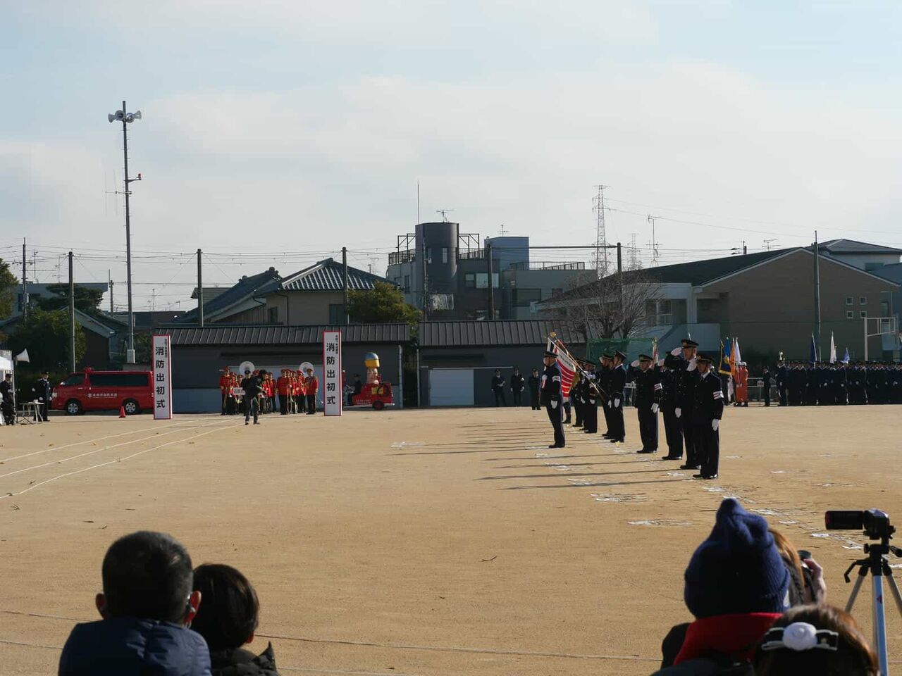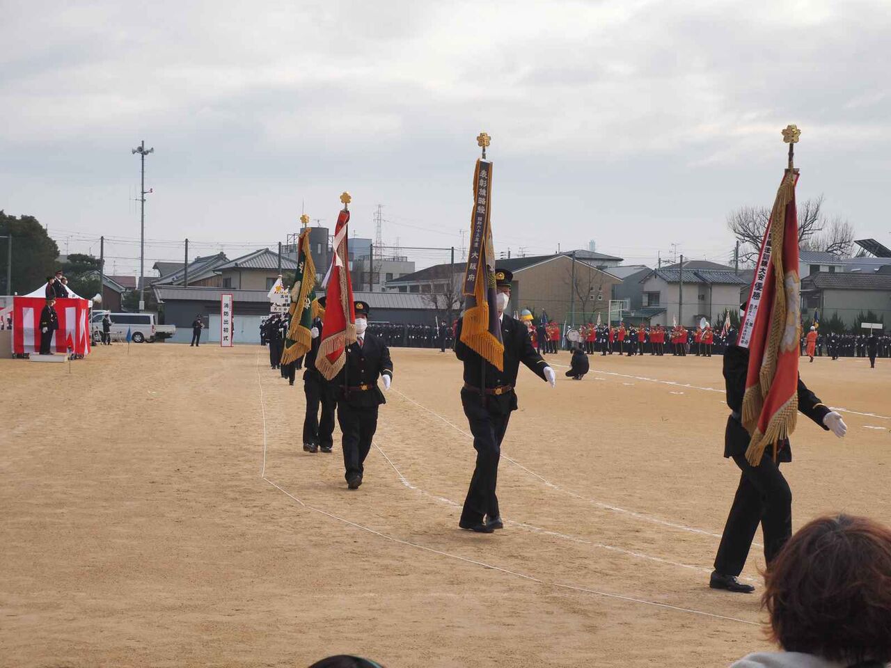 行進が終わった後、国旗掲揚、消防関係の物故者への黙とうがあり、