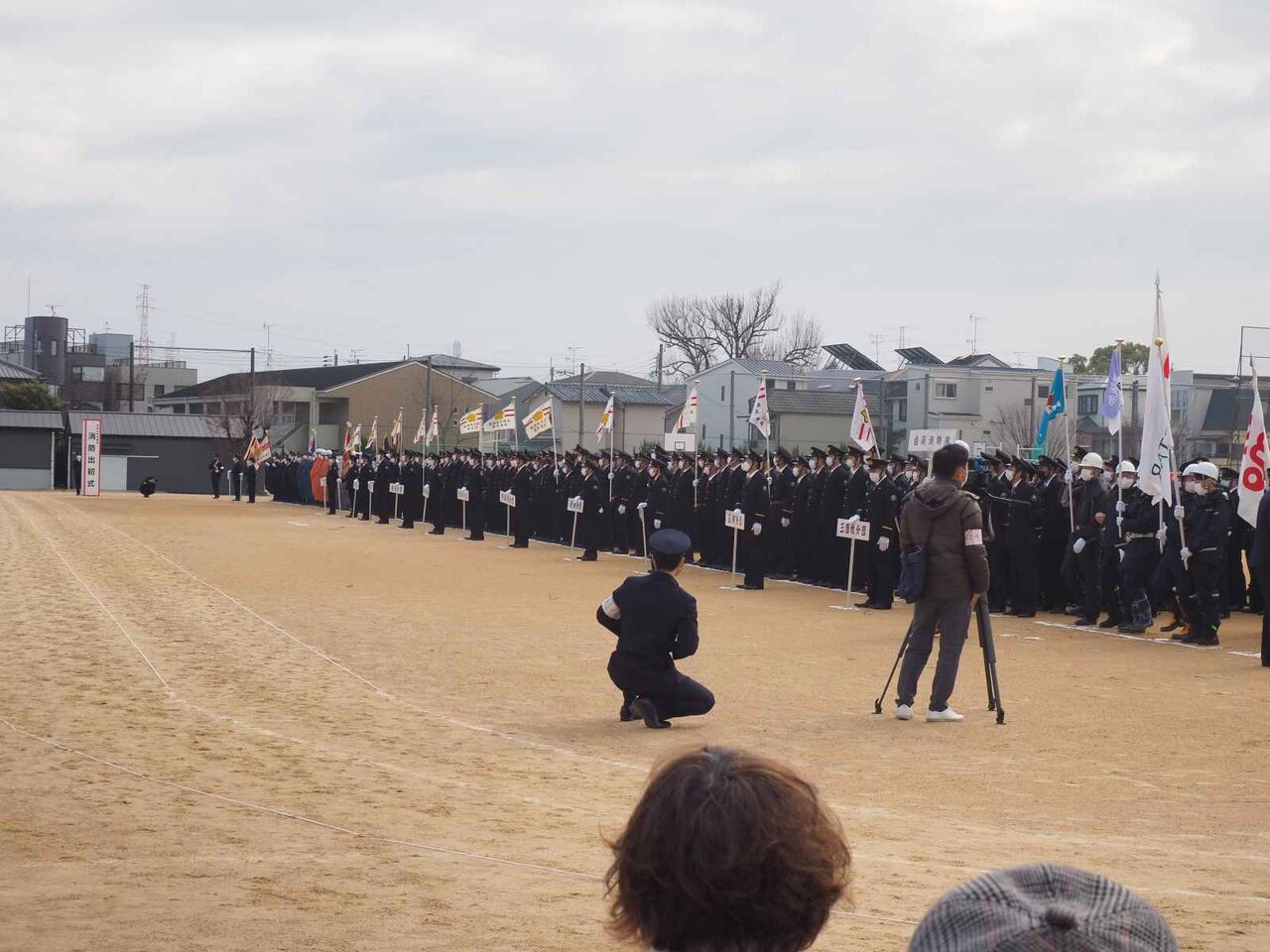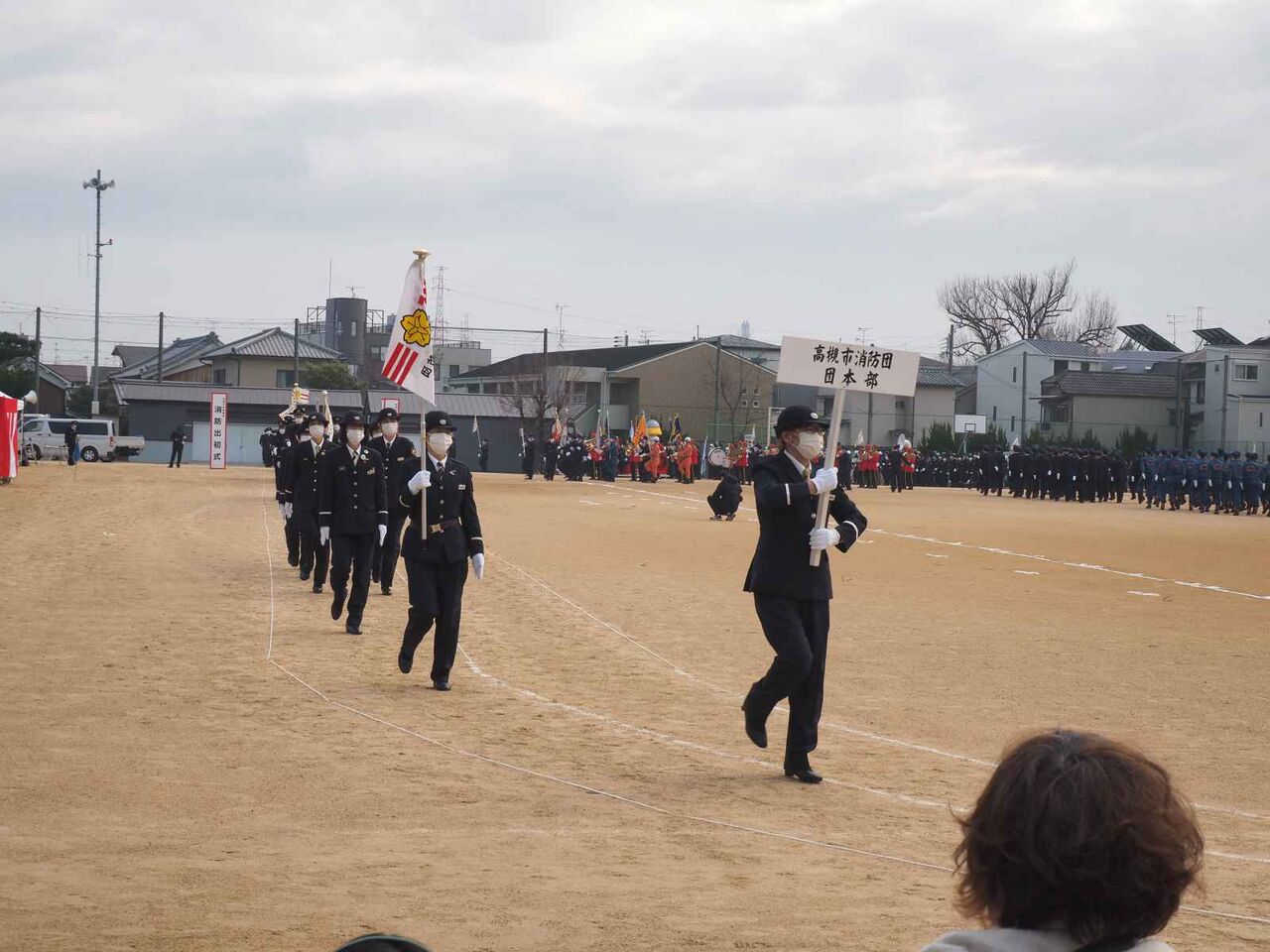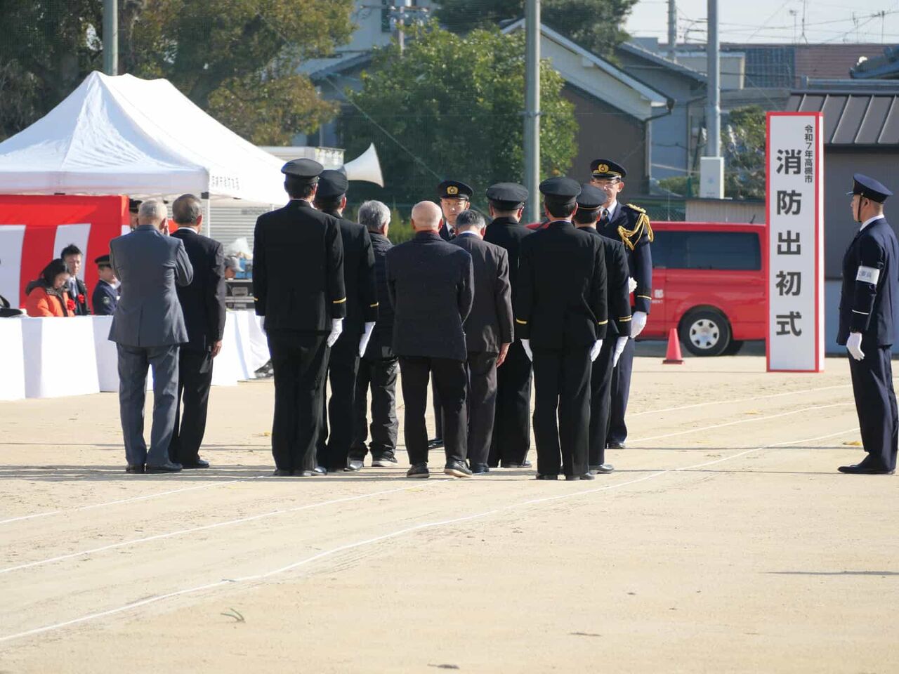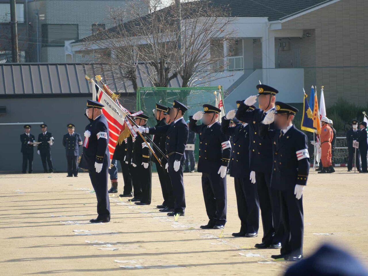 行進が終わった後、国旗掲揚、消防関係の物故者への黙とうがあり、