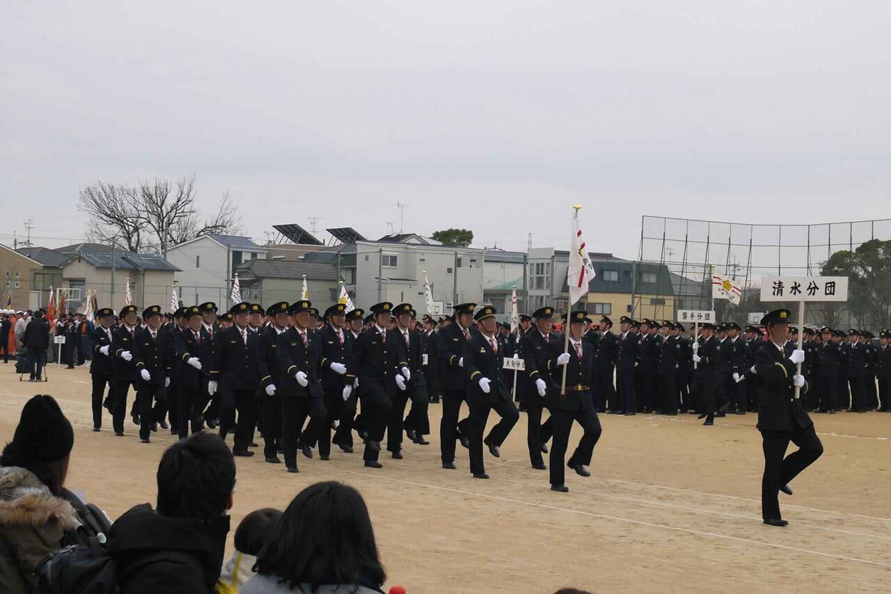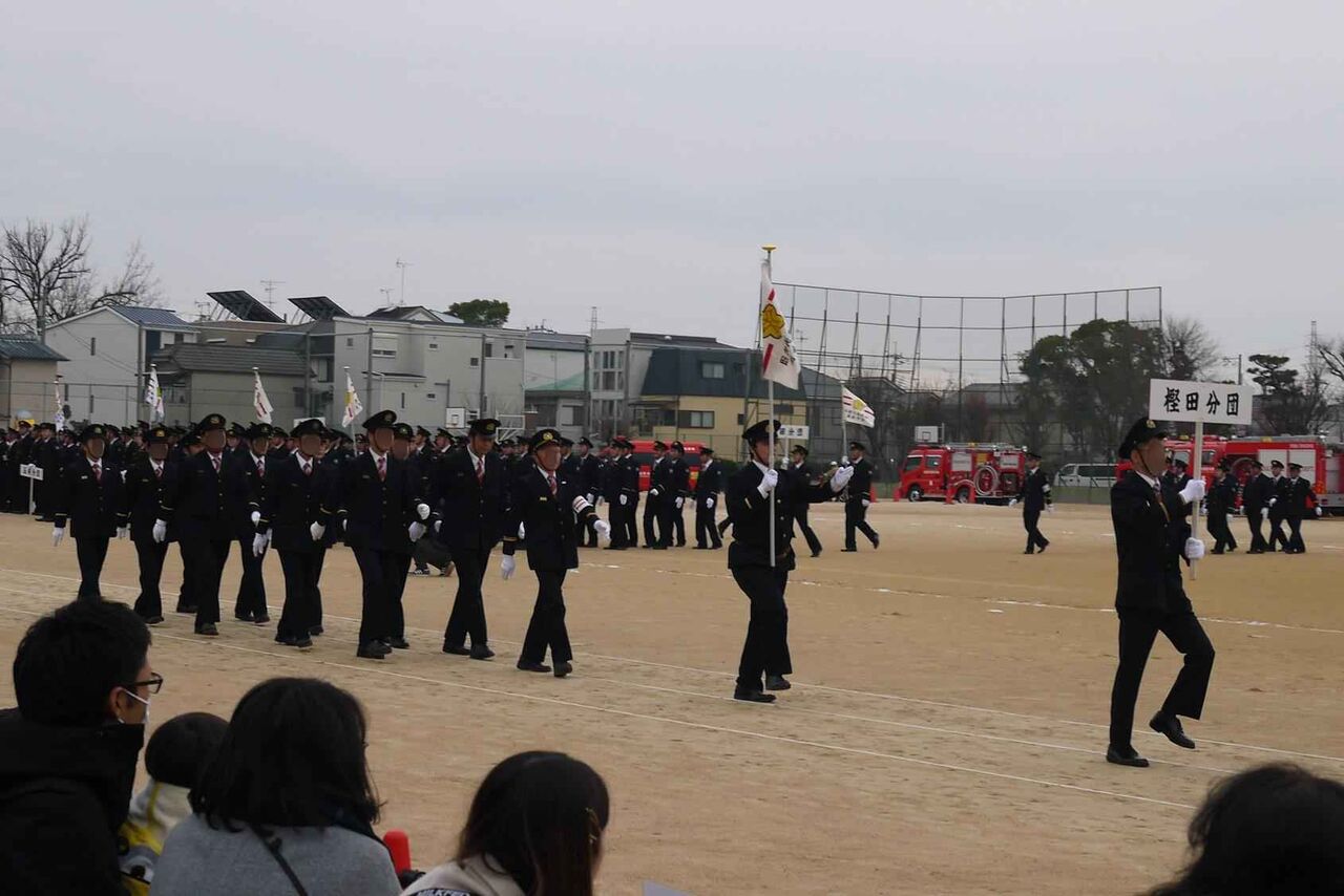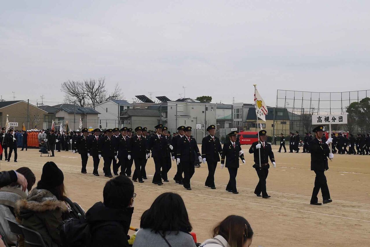 高槻市消防団の方々です 今年は、複数の分団の方々が同時に行進されて時間の短縮になったようです