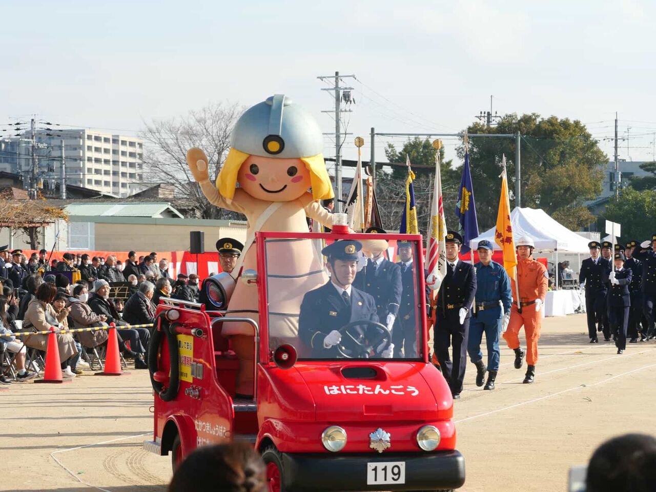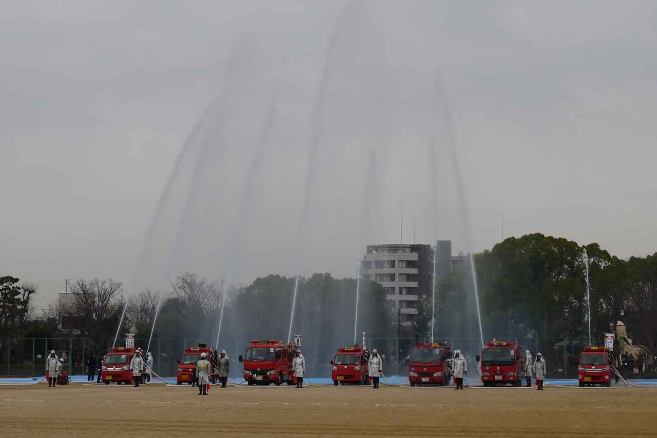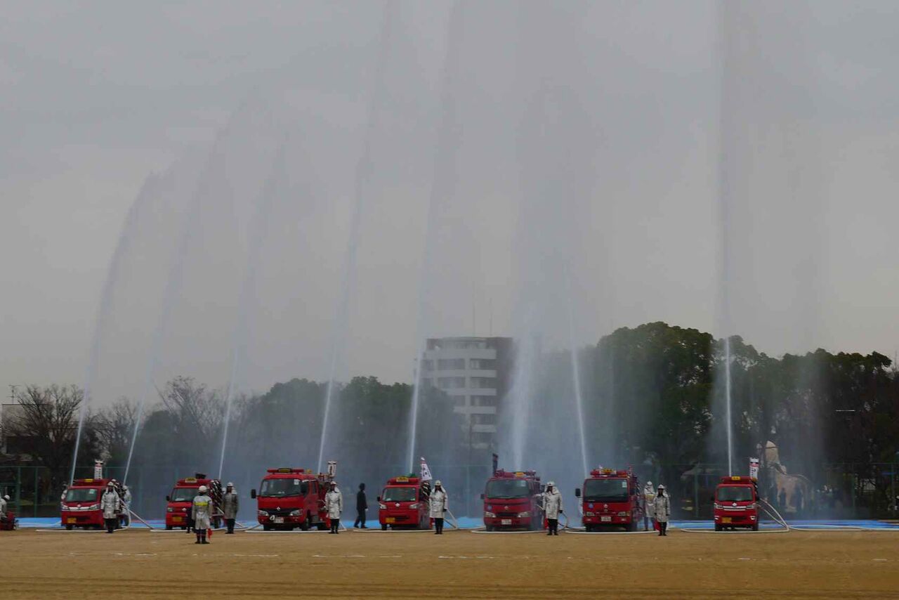 消防本部・消防団・自衛消防隊など総勢約500人と消防車両の分列行進や一斉放水、消防音楽隊による演奏などが行われて、さらに市のキャラクターはにたんが、はにたん号に乗って登場。