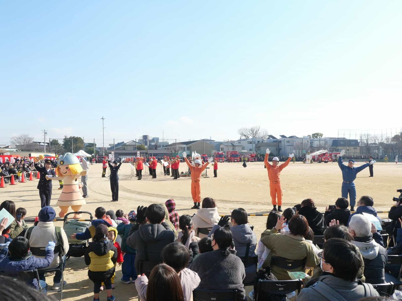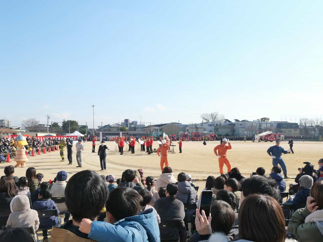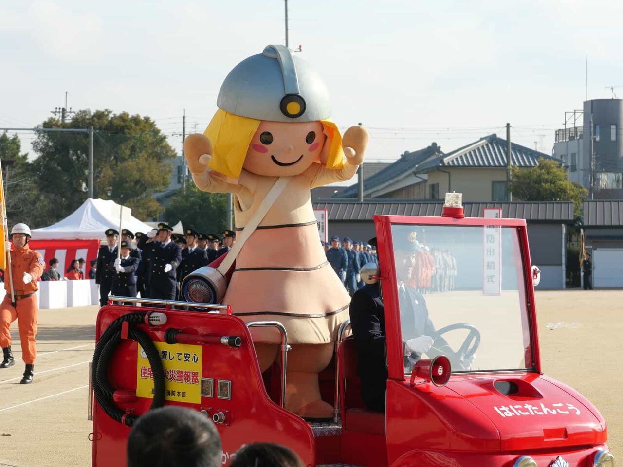 消防本部・消防団・自衛消防隊など総勢約500人と消防車両の分列行進や一斉放水、消防音楽隊による演奏などが行われて、さらに市のキャラクターはにたんが、はにたん号に乗って登場。