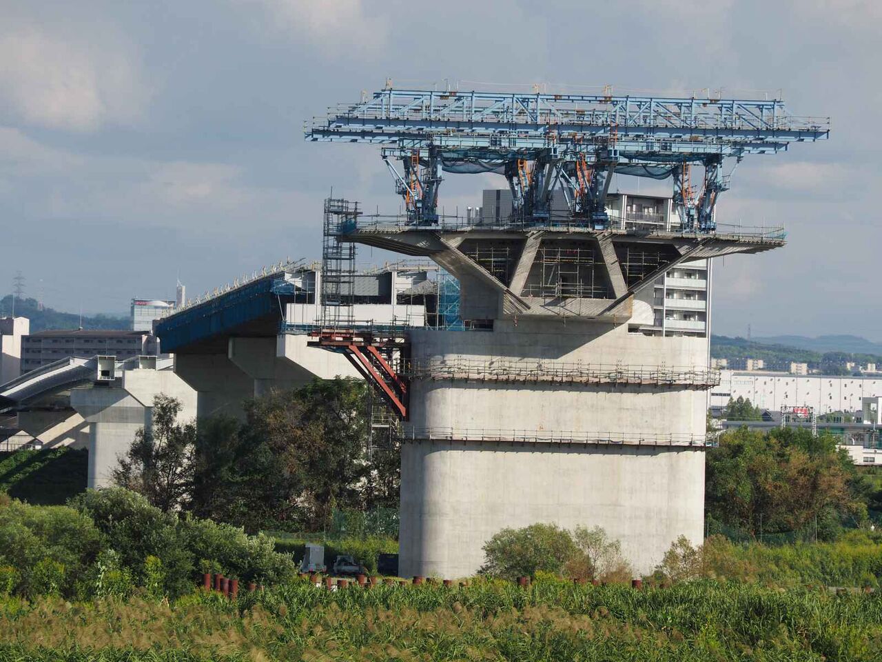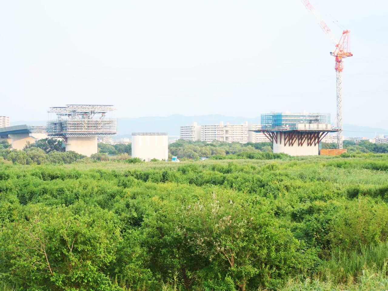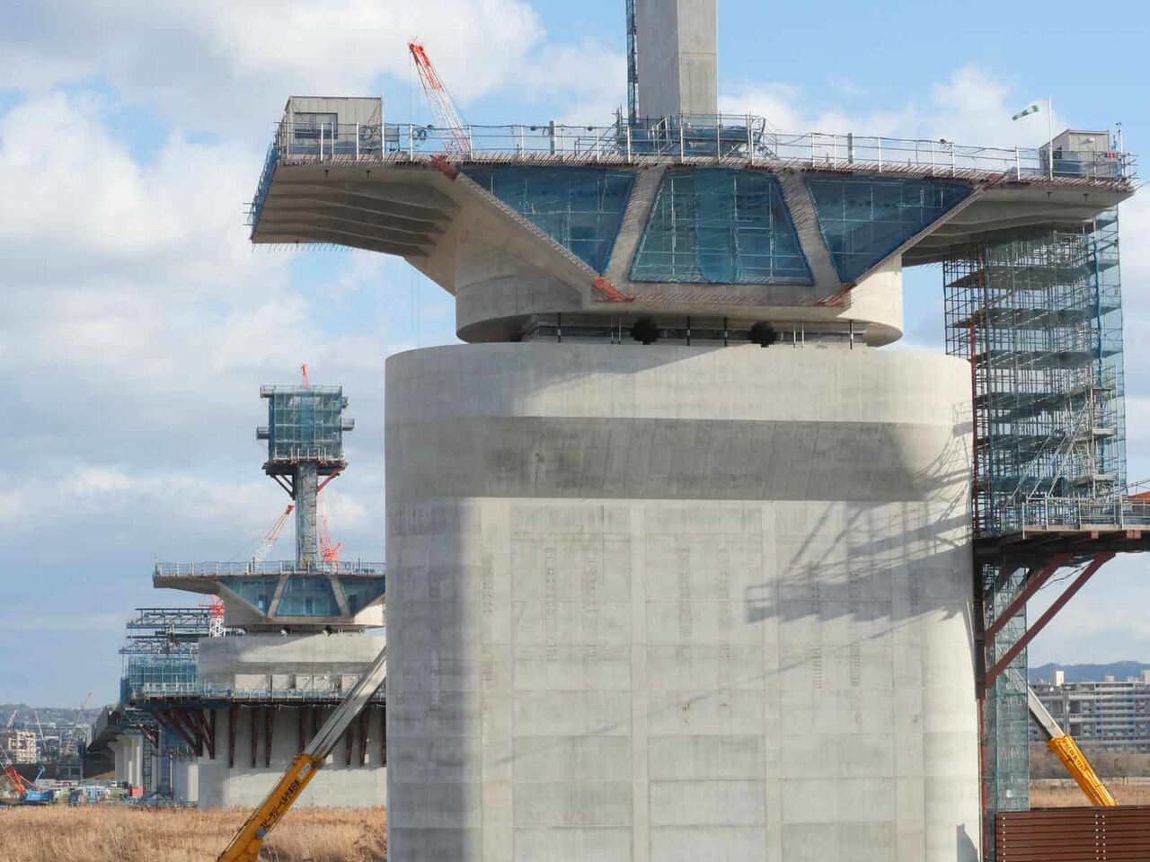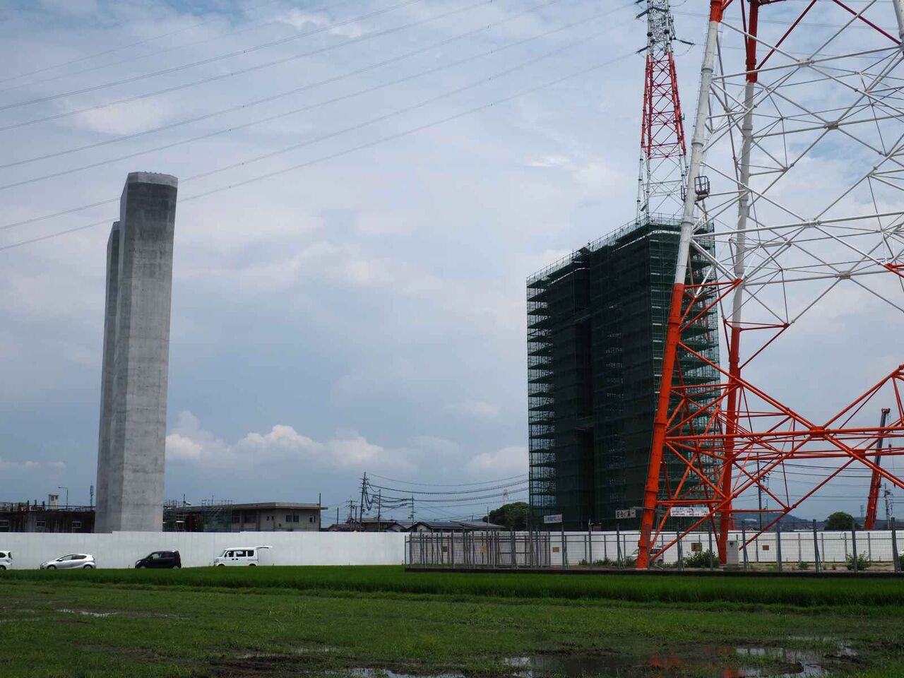 ただ、よーく見ると奥に橋脚に新たな梯子のようなものが組み立てられている橋脚があります。これは橋梁の工事の準備の始まりのようです。これだけの高さに今後橋梁を乗せる工法はどうするのかとても気になります。今回は淀川付近は見ることができなかったので今後も引き続き変化を見ていきたいと思います。