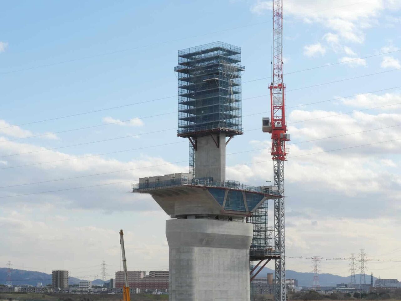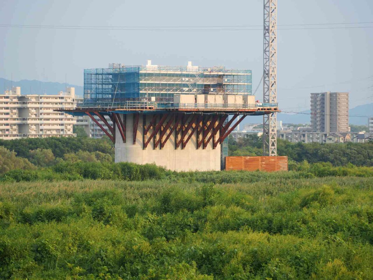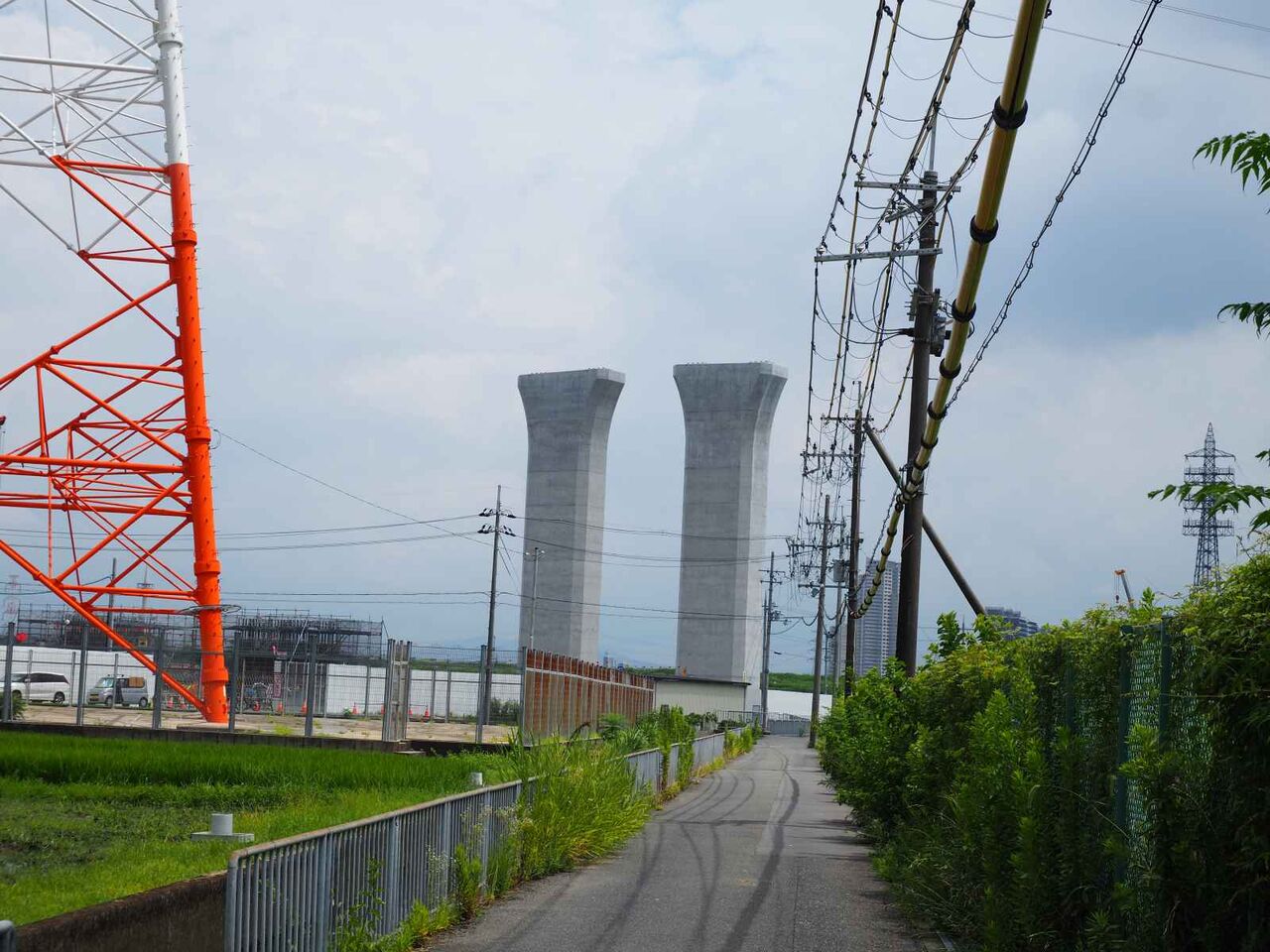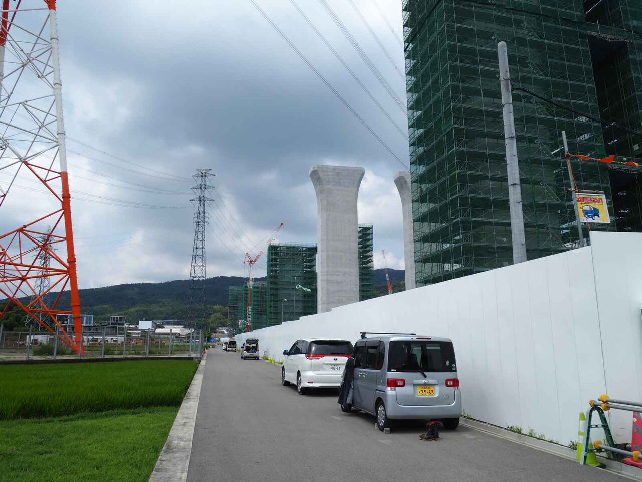 ただ、よーく見ると奥に橋脚に新たな梯子のようなものが組み立てられている橋脚があります。これは橋梁の工事の準備の始まりのようです。これだけの高さに今後橋梁を乗せる工法はどうするのかとても気になります。今回は淀川付近は見ることができなかったので今後も引き続き変化を見ていきたいと思います。