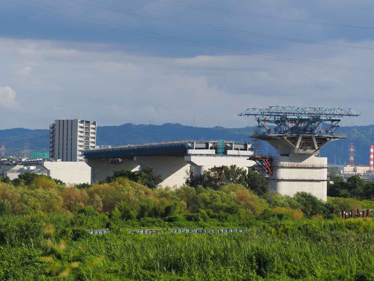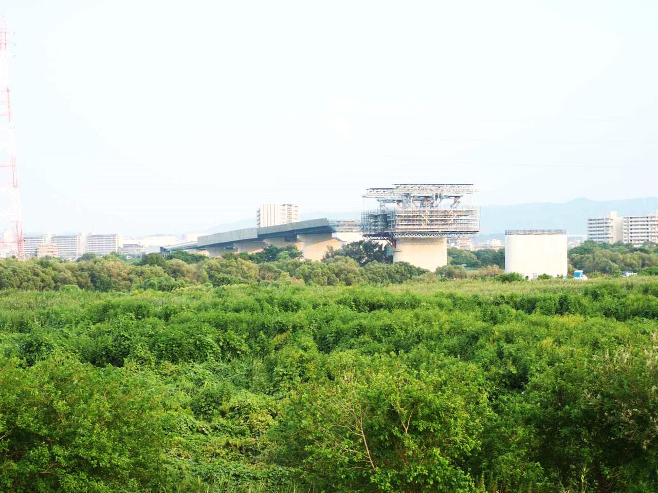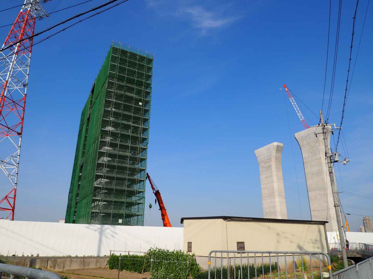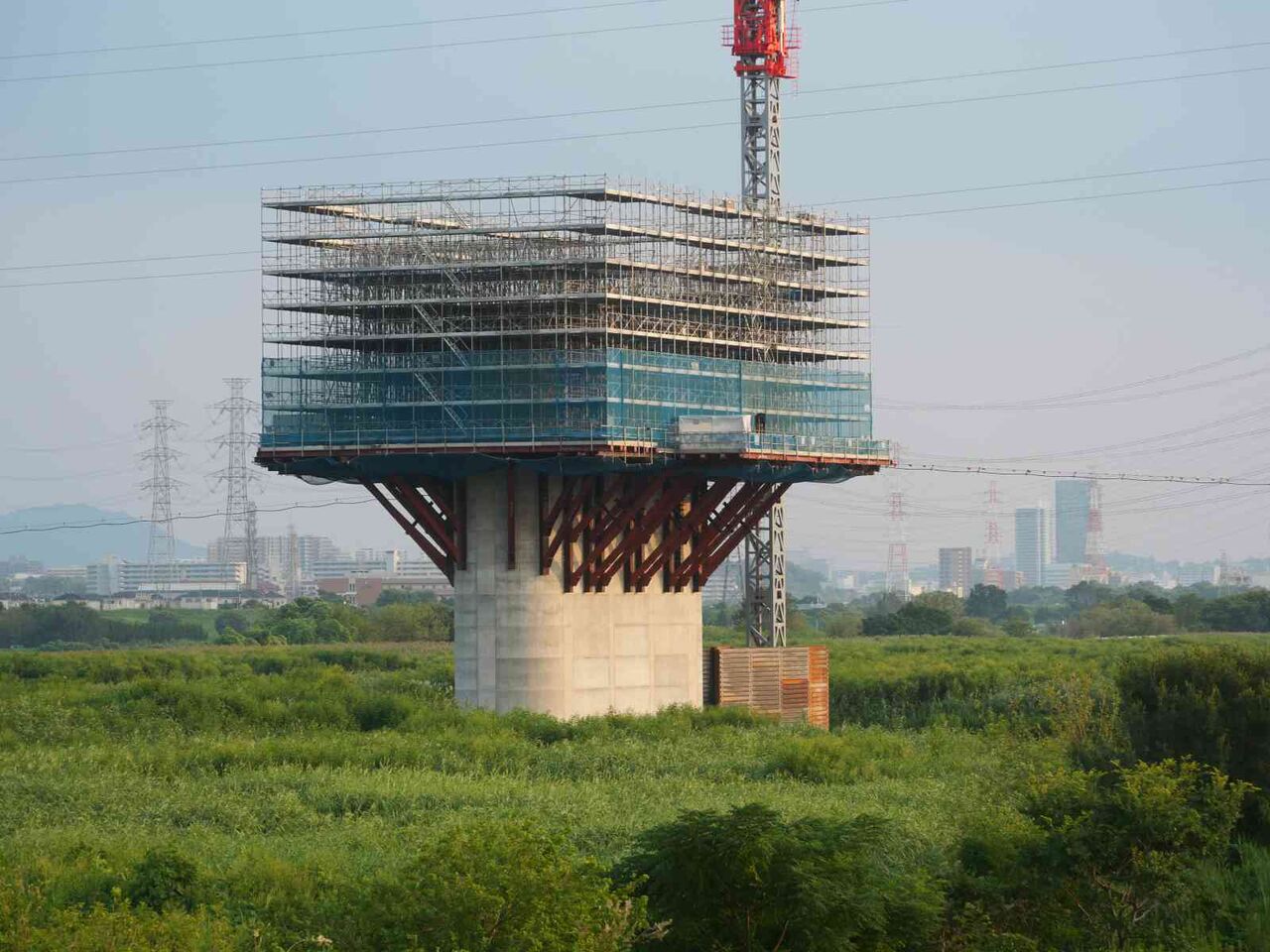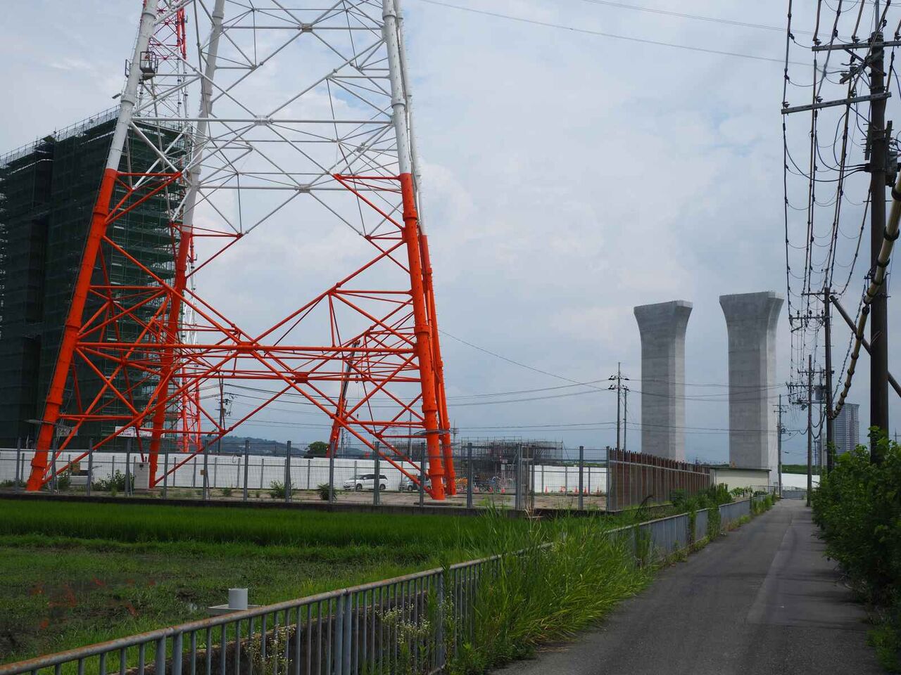 ただ、よーく見ると奥に橋脚に新たな梯子のようなものが組み立てられている橋脚があります。これは橋梁の工事の準備の始まりのようです。これだけの高さに今後橋梁を乗せる工法はどうするのかとても気になります。今回は淀川付近は見ることができなかったので今後も引き続き変化を見ていきたいと思います。