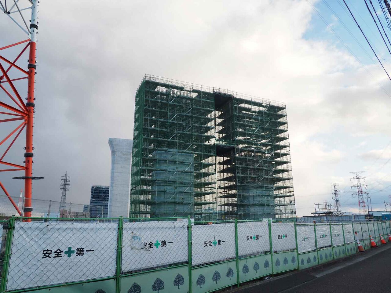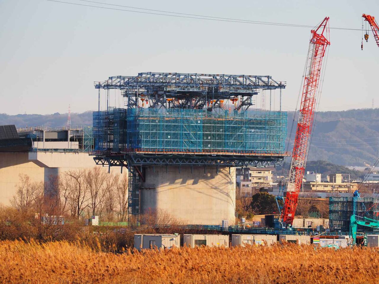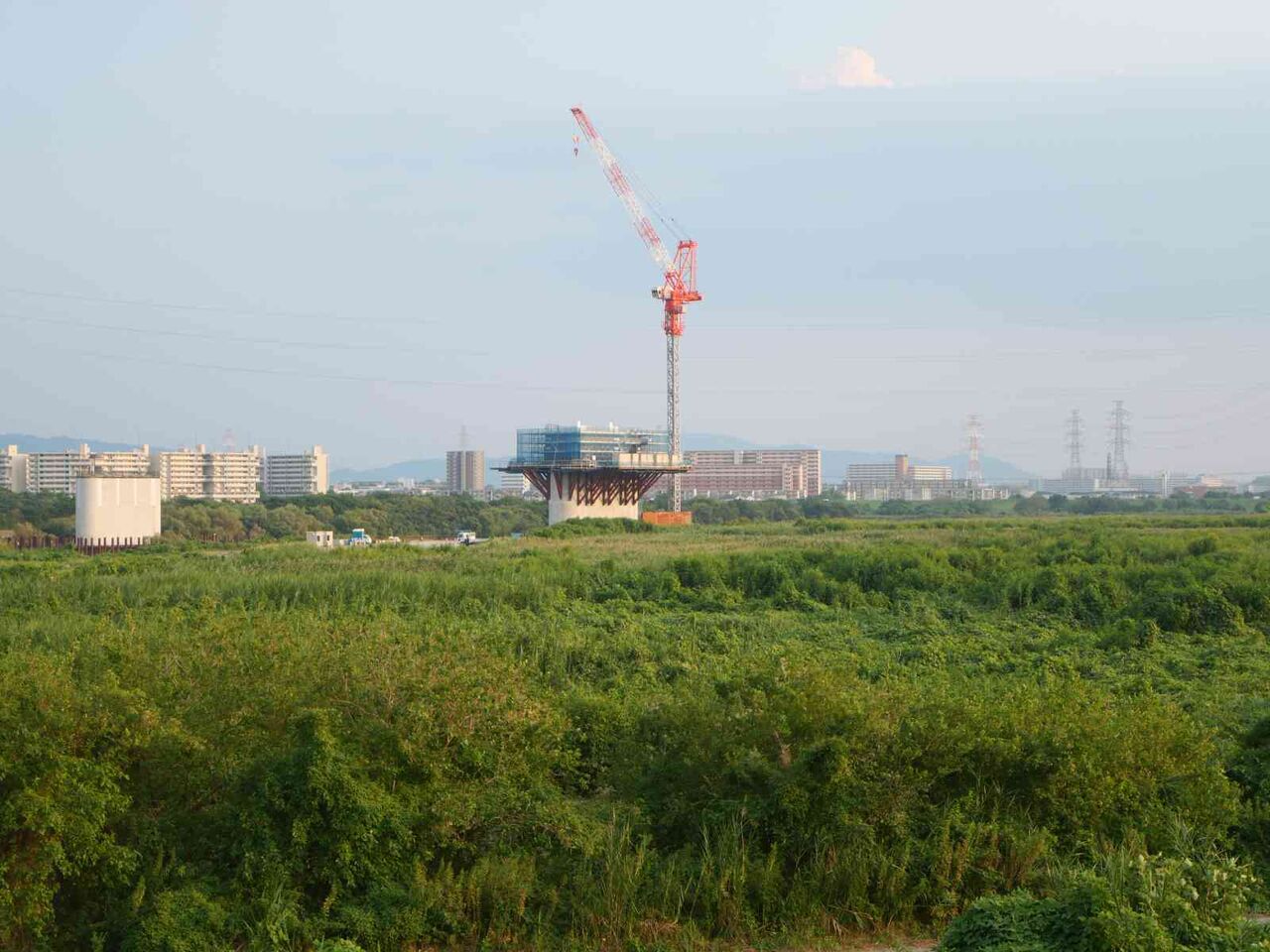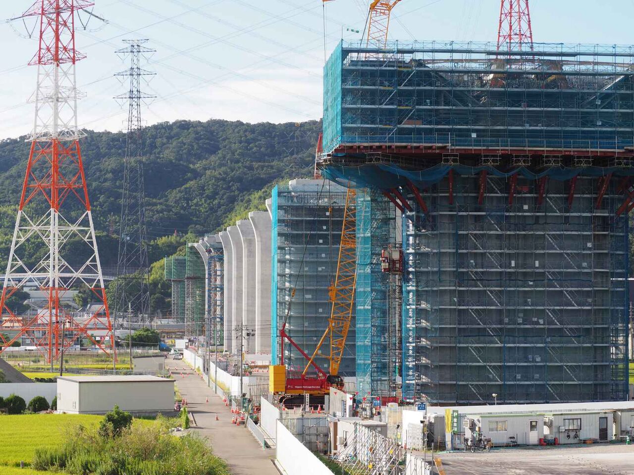 ただ、よーく見ると奥に橋脚に新たな梯子のようなものが組み立てられている橋脚があります。これは橋梁の工事の準備の始まりのようです。これだけの高さに今後橋梁を乗せる工法はどうするのかとても気になります。今回は淀川付近は見ることができなかったので今後も引き続き変化を見ていきたいと思います。