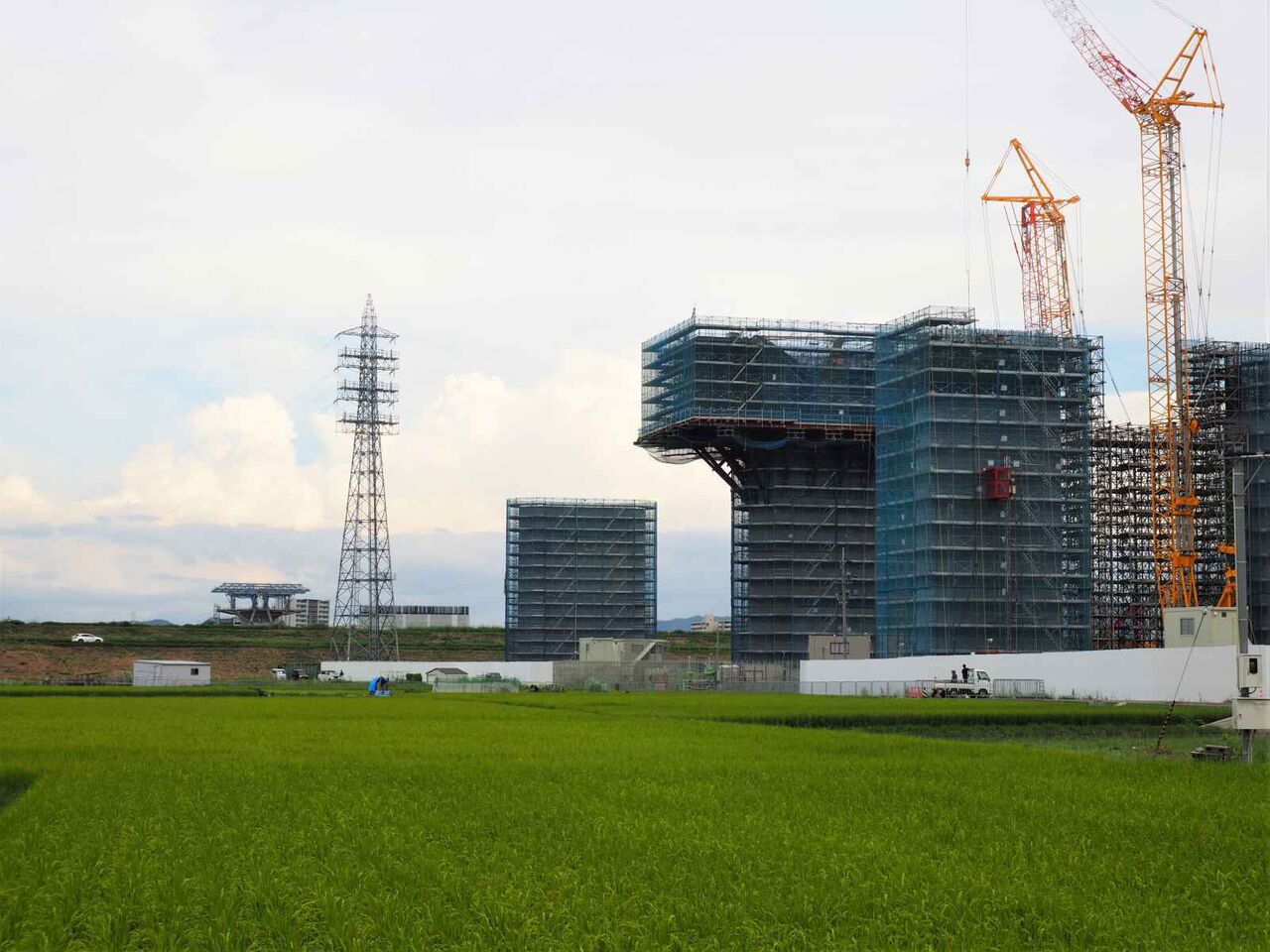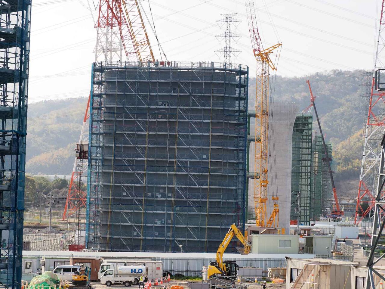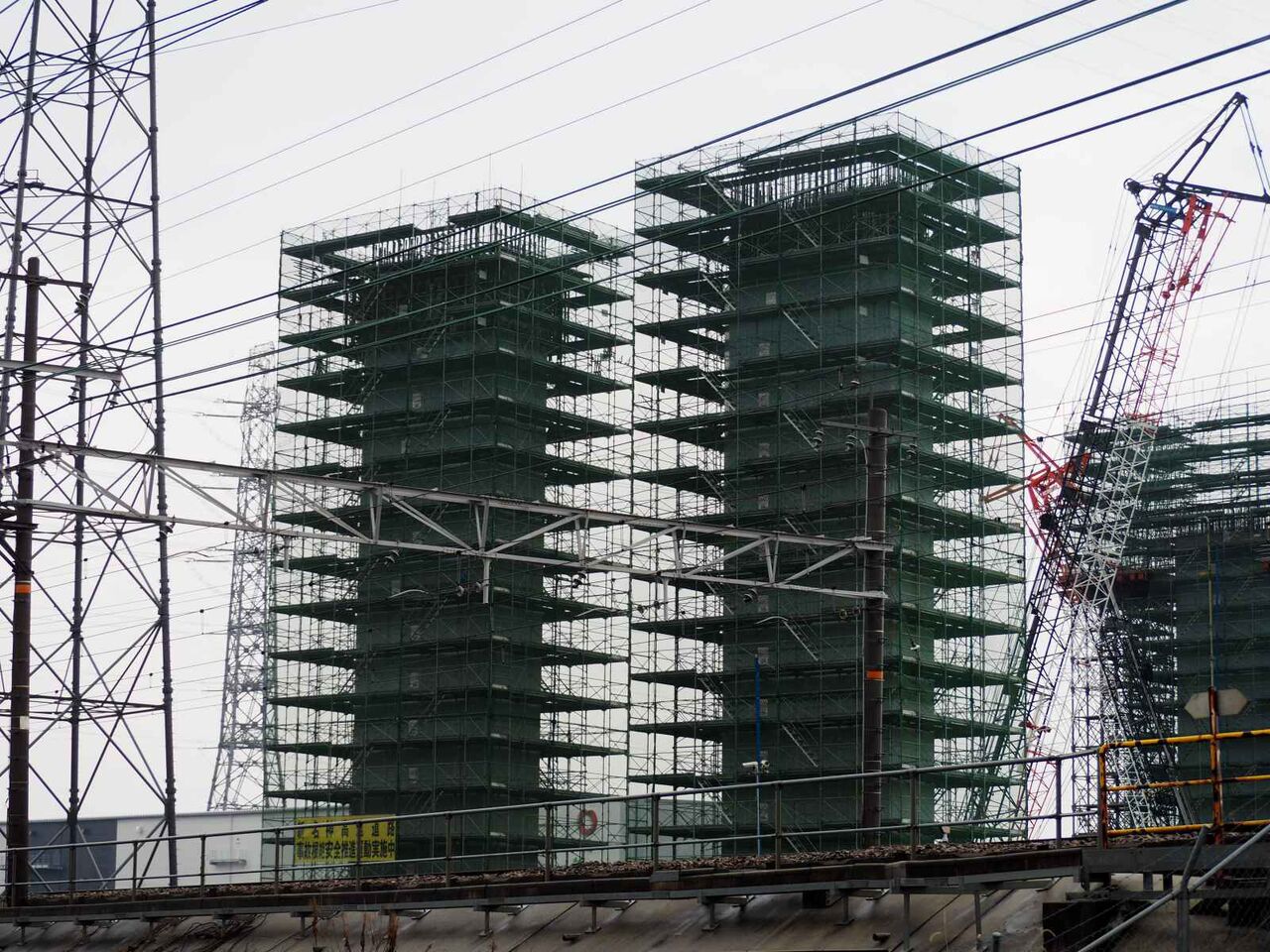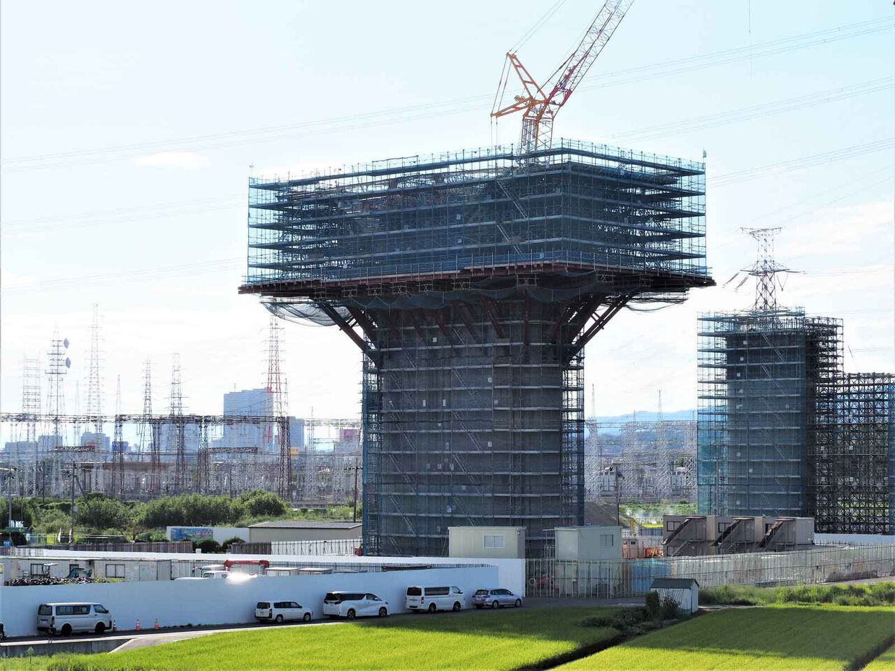 ただ、よーく見ると奥に橋脚に新たな梯子のようなものが組み立てられている橋脚があります。これは橋梁の工事の準備の始まりのようです。これだけの高さに今後橋梁を乗せる工法はどうするのかとても気になります。今回は淀川付近は見ることができなかったので今後も引き続き変化を見ていきたいと思います。