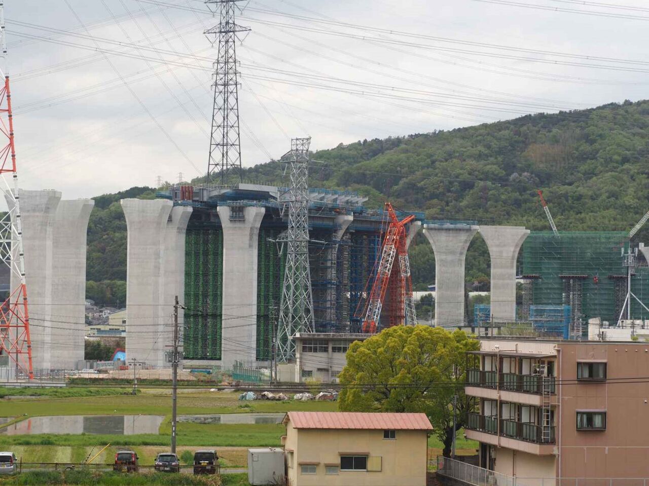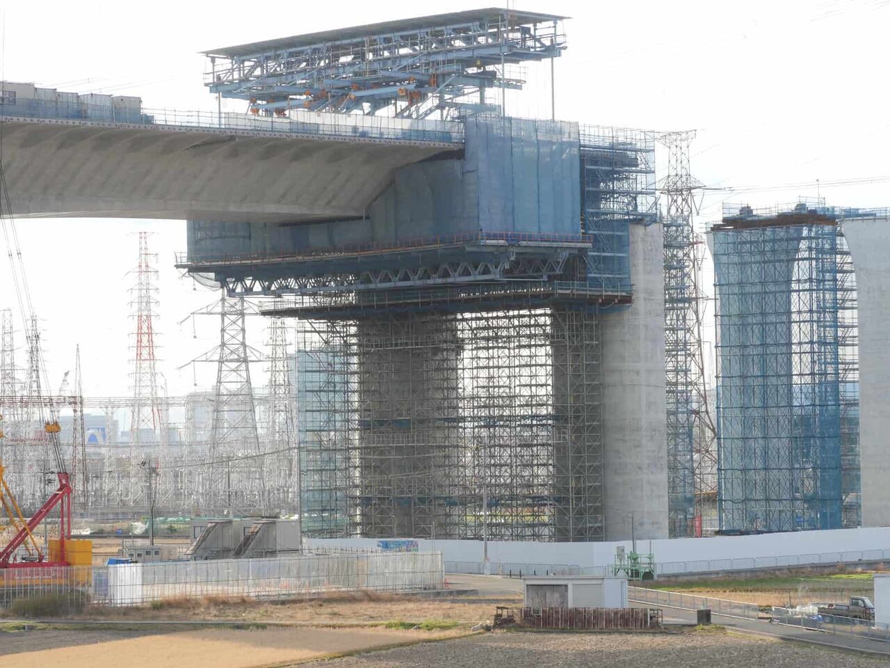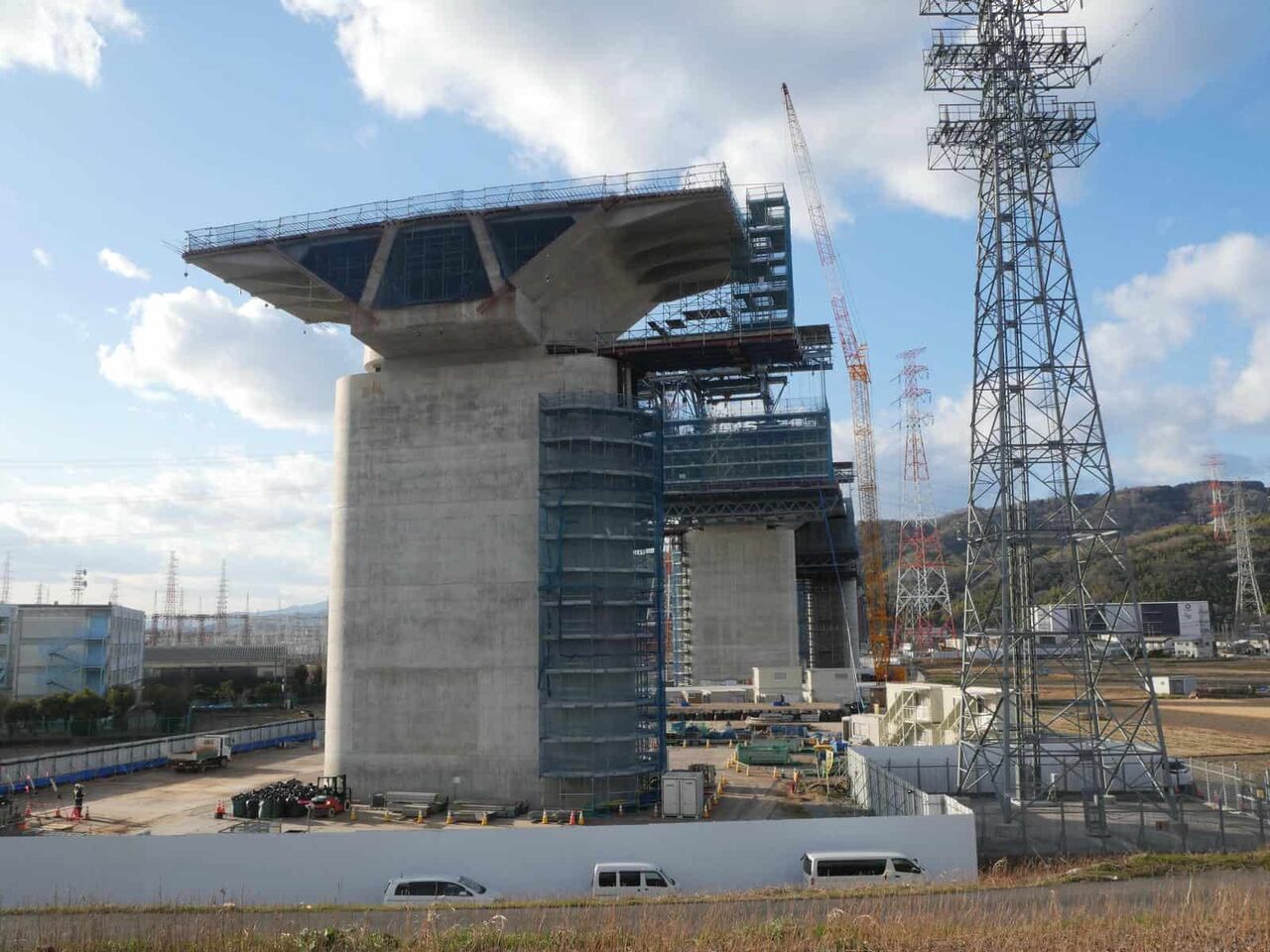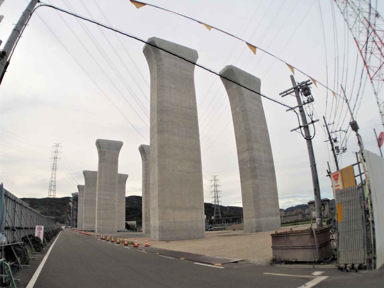 この高さの上に橋梁はどのようにして乗せるのか??気になります。一気に乗せるか、名神インターみたいに、箱型のものをつないでいくのでしょうか。
