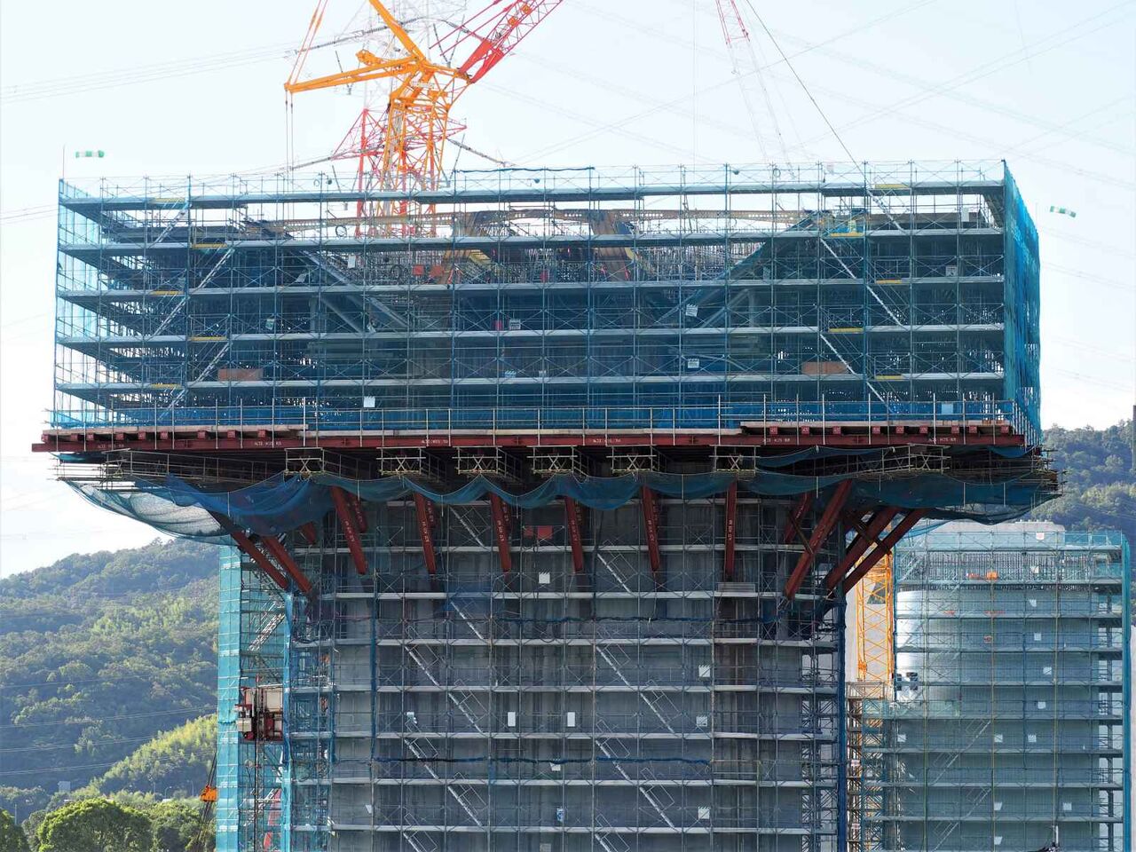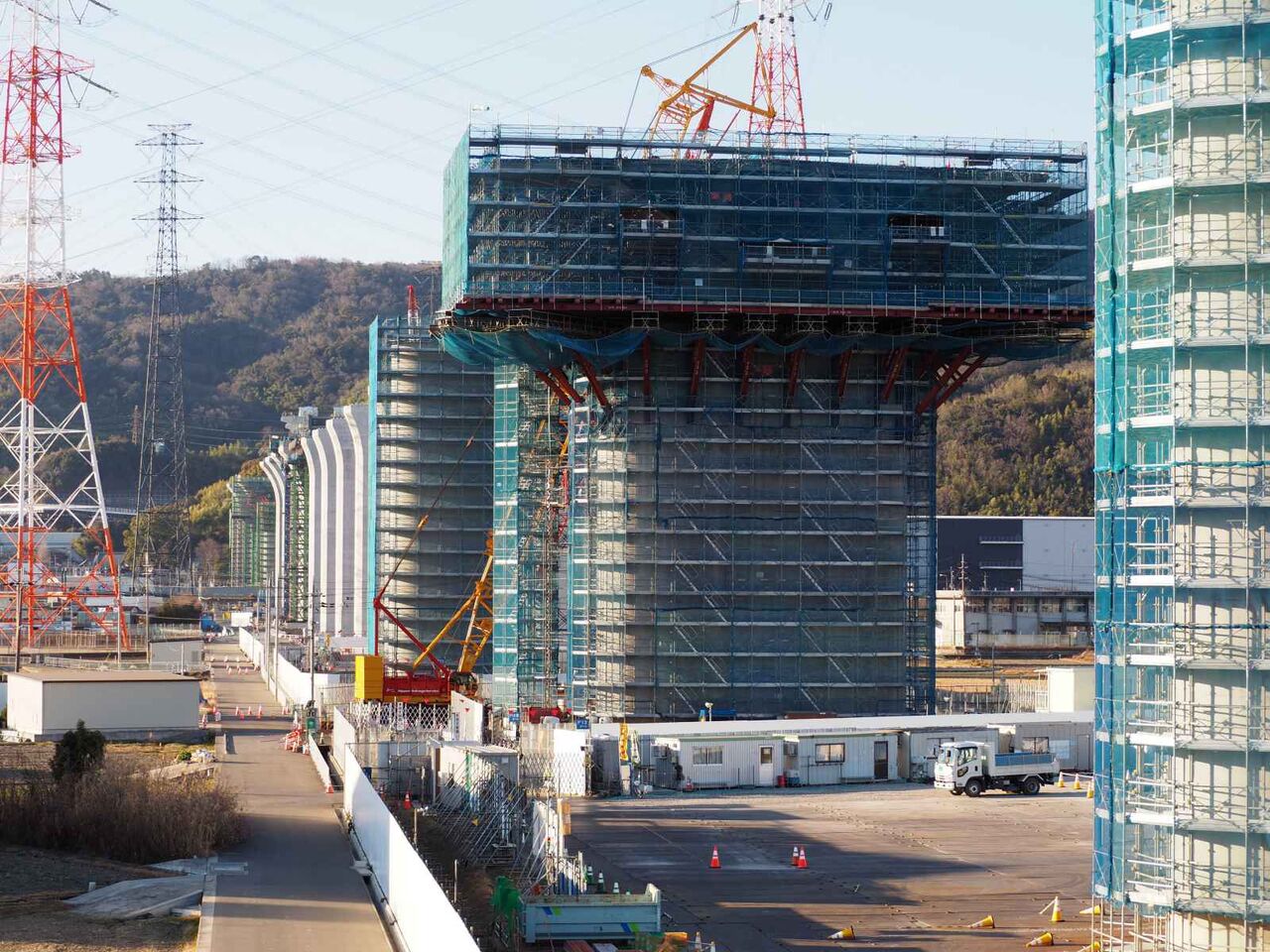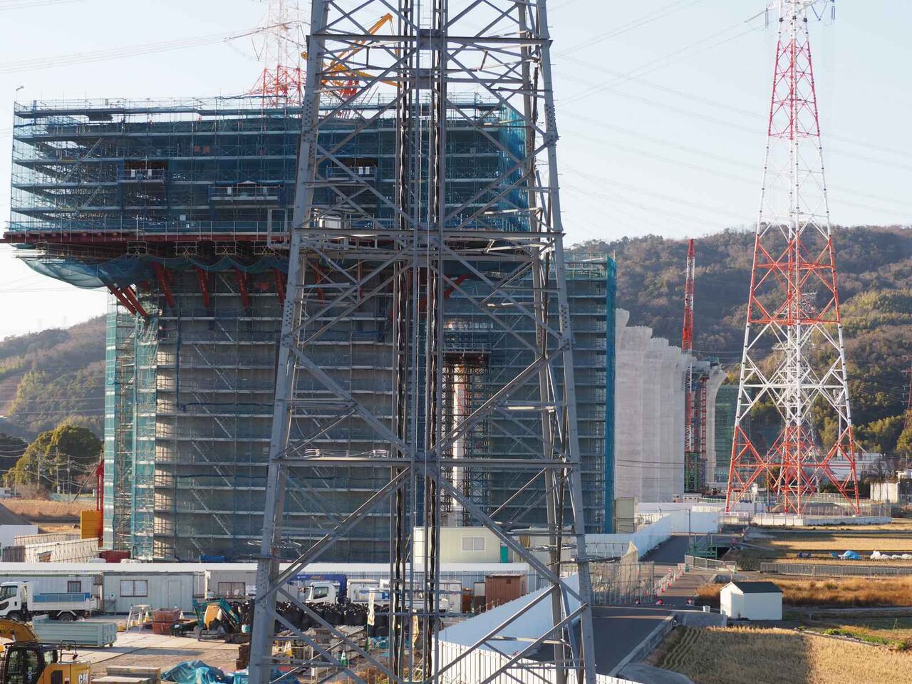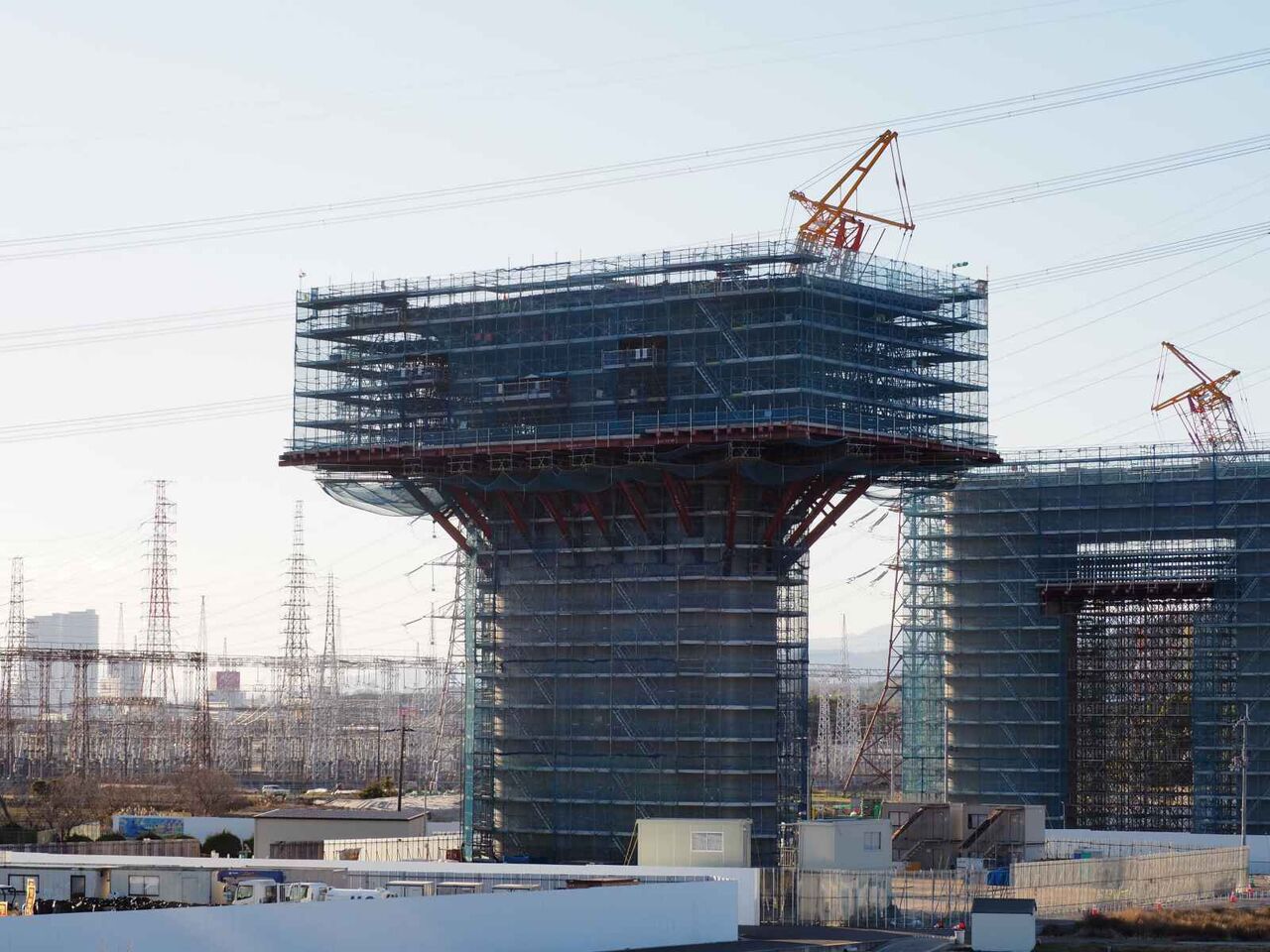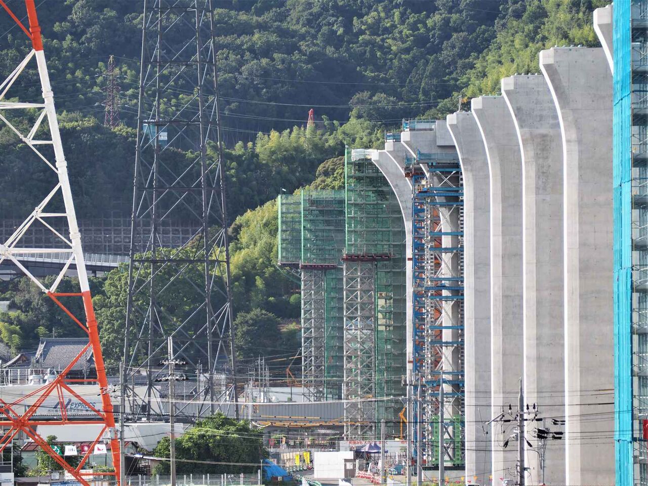 この高さの上に橋梁はどのようにして乗せるのか??気になります。一気に乗せるか、名神インターみたいに、箱型のものをつないでいくのでしょうか。