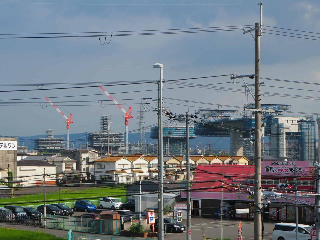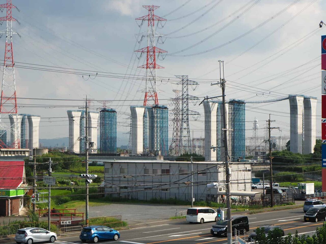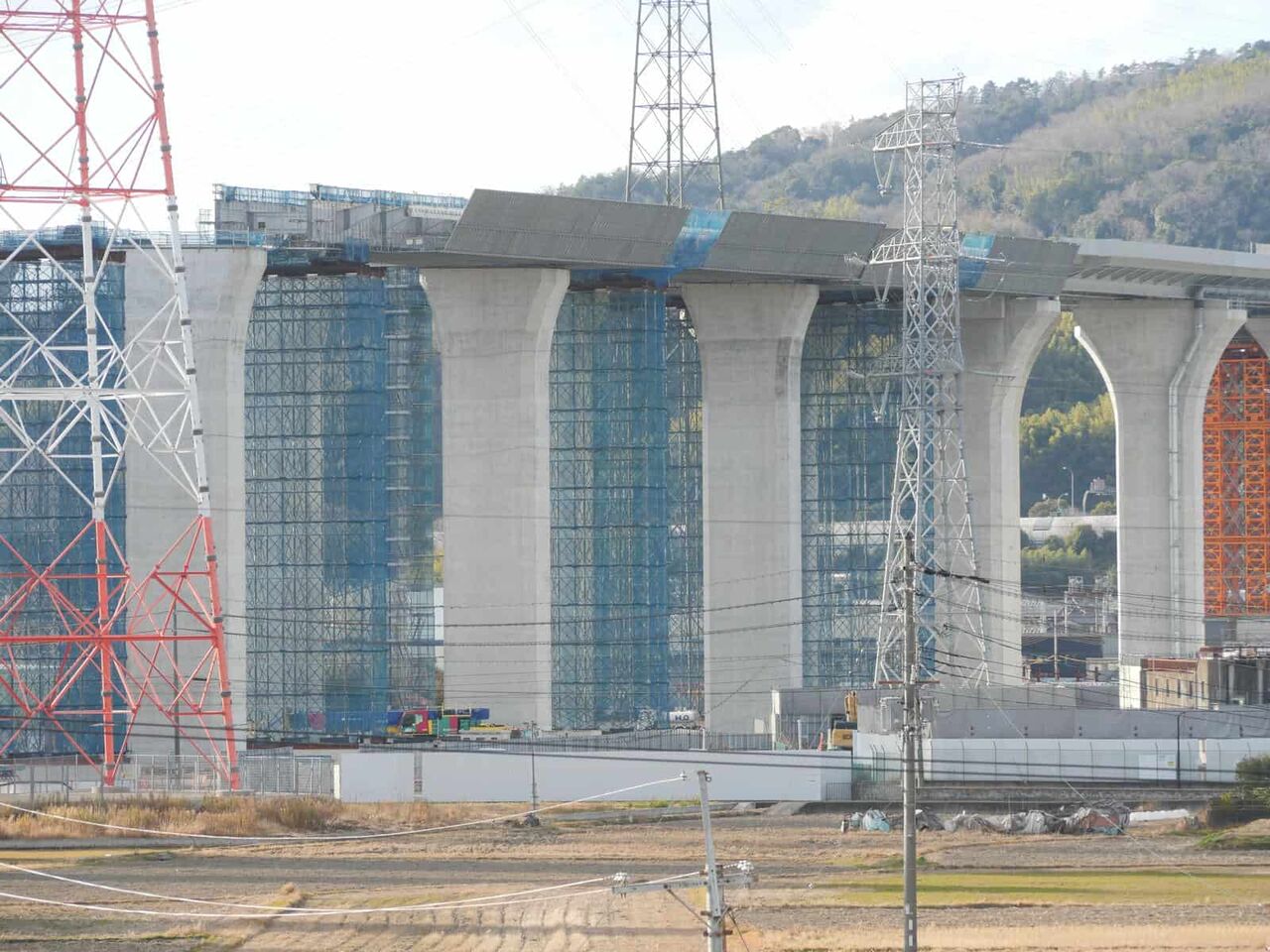 鉄塔と電線の間を通る、新名神淀川橋。といっても、ここを通すために鉄塔を移動しています。(確か7本)