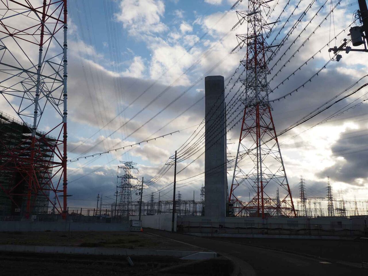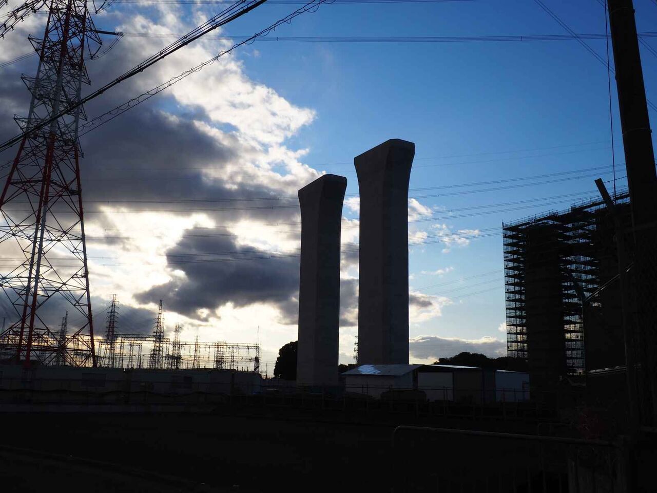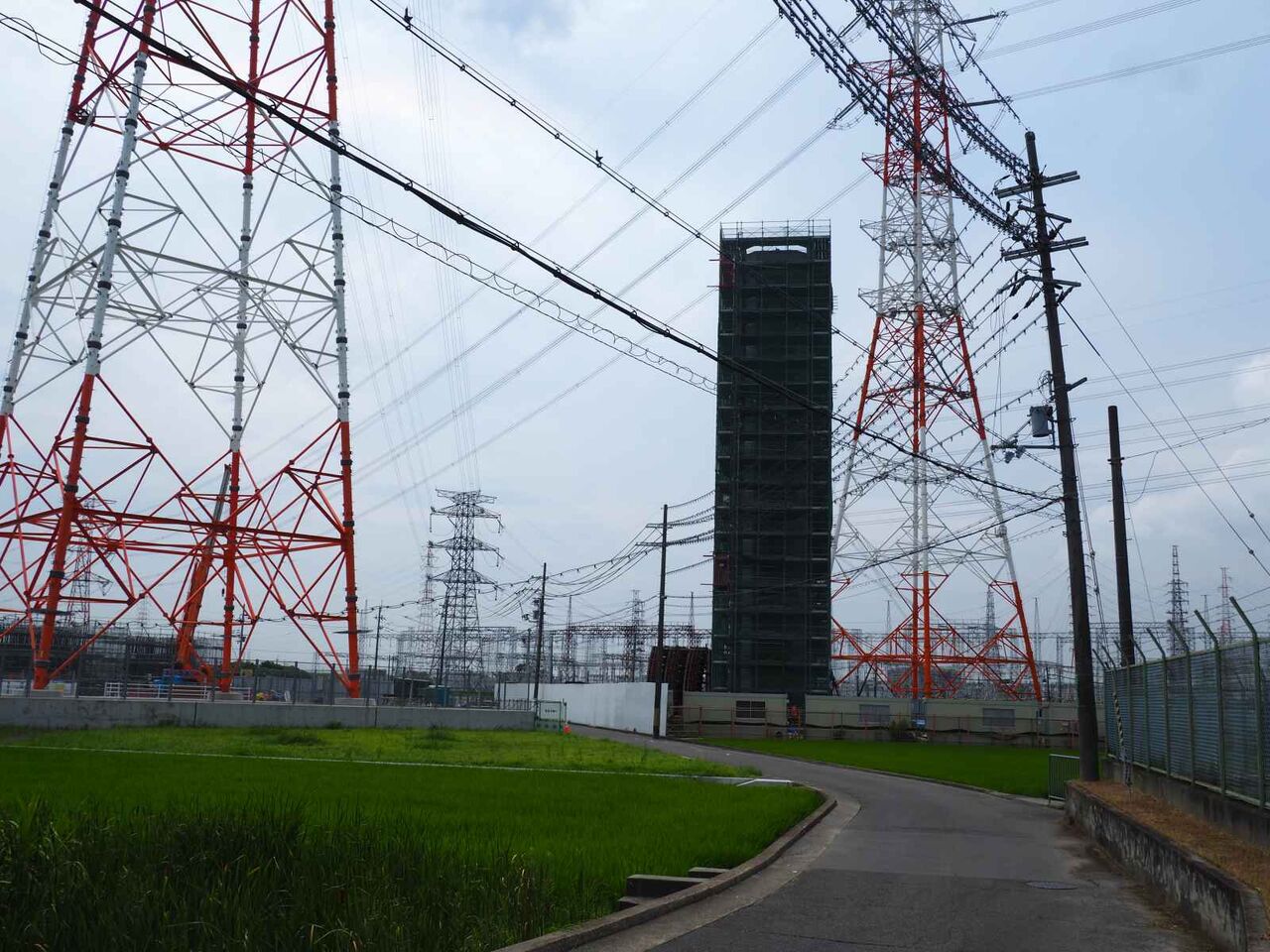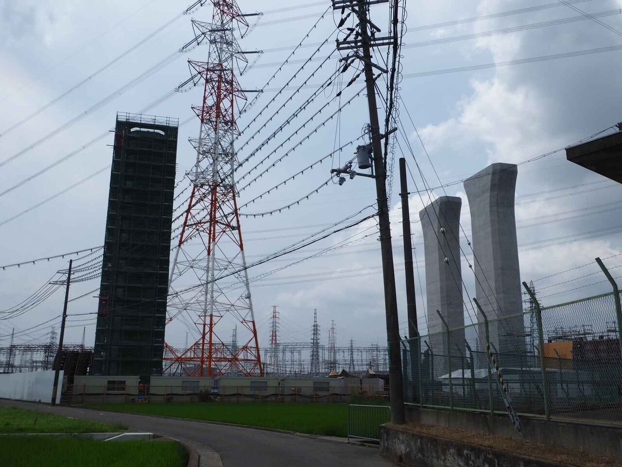 鉄塔と電線の間を通る、新名神淀川橋。といっても、ここを通すために鉄塔を移動しています。(確か7本)