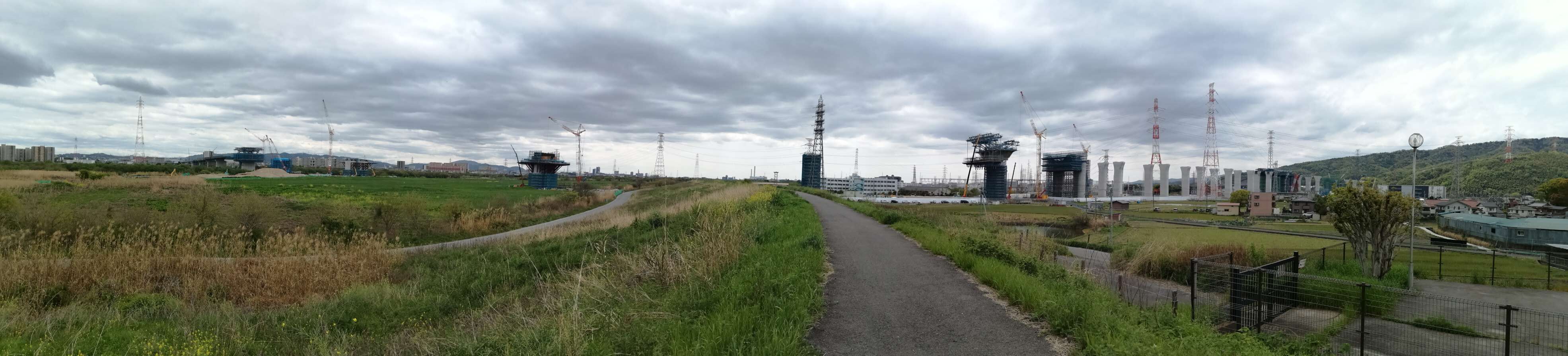 この1枚でパノラマのようになっています。いよいよ橋桁の完成が近づいてきました。他の場所の進捗も時々観察したいと思います。なお、このときの西国街道沿いのようすは別途投稿します。