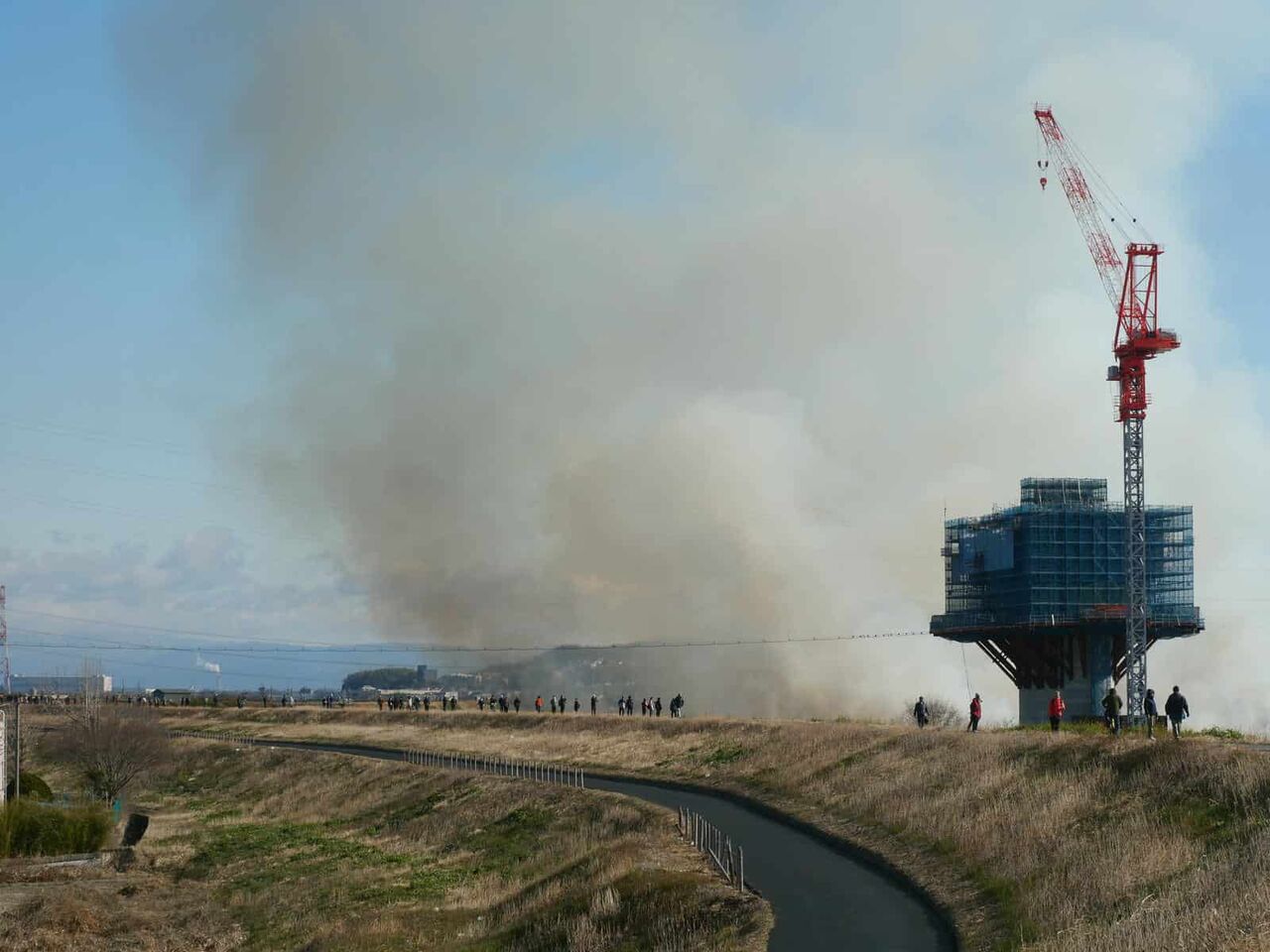 淀川の堤防沿いでは、ヨシ焼きの煙が