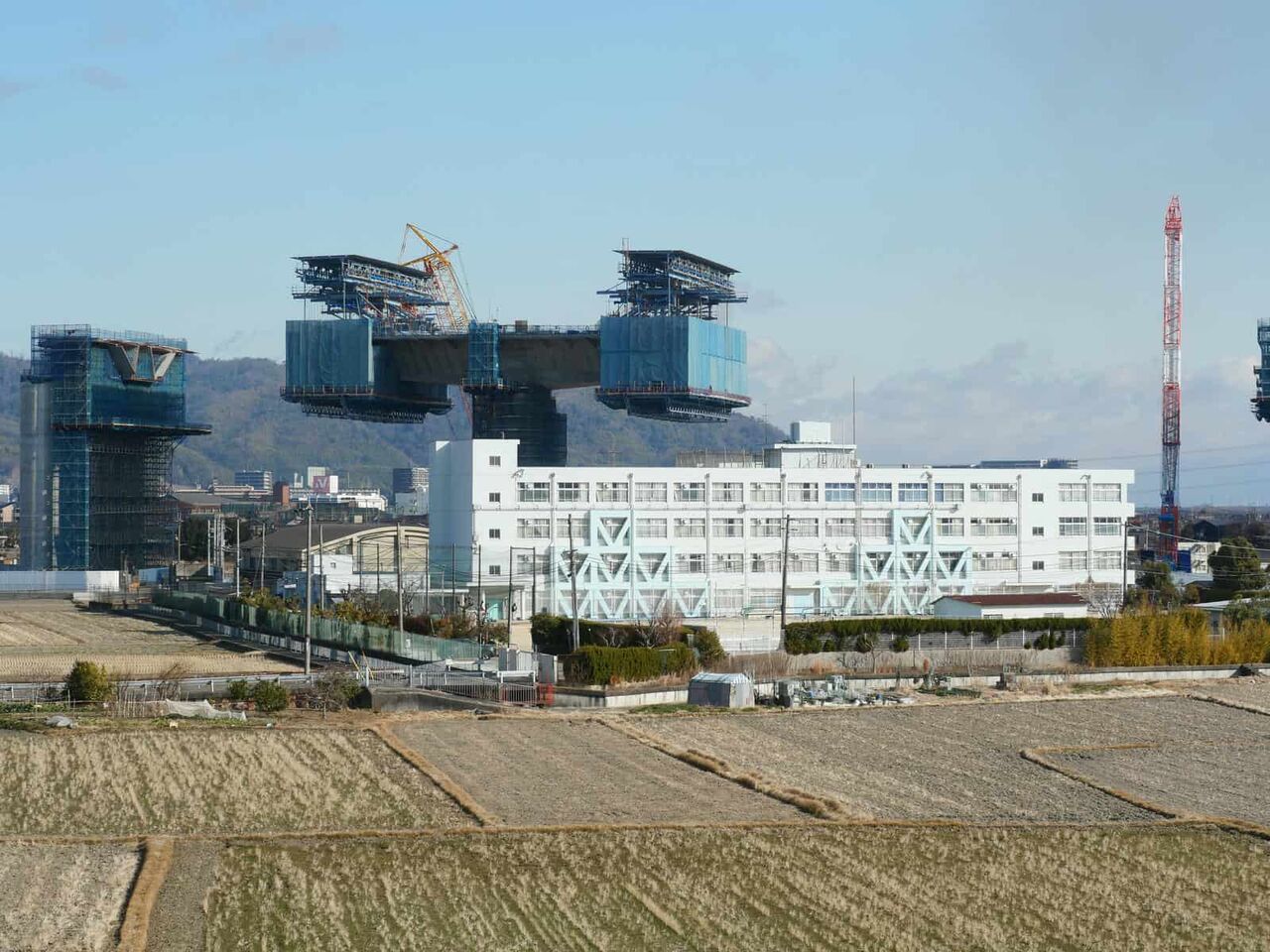 上牧小学校の近くには橋脚から、やじろべいのような工法での橋梁工事が始まってきました。