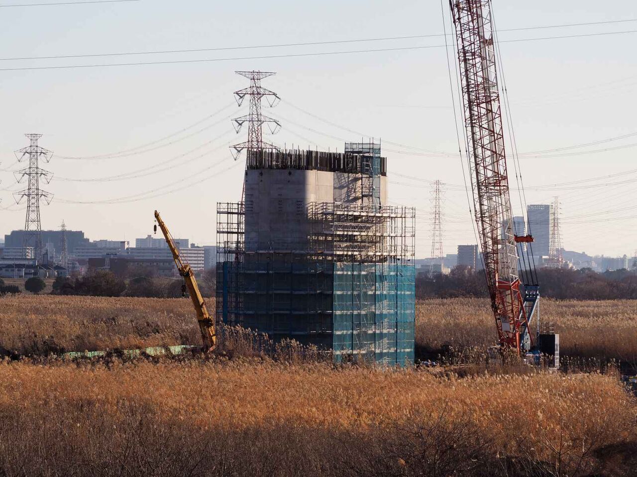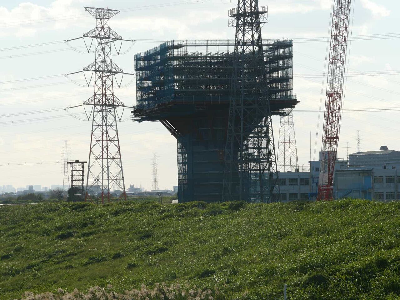 いままで見られなかった、堤防の橋脚に、何やら「塔」のようなものの建設が始まっているようです。