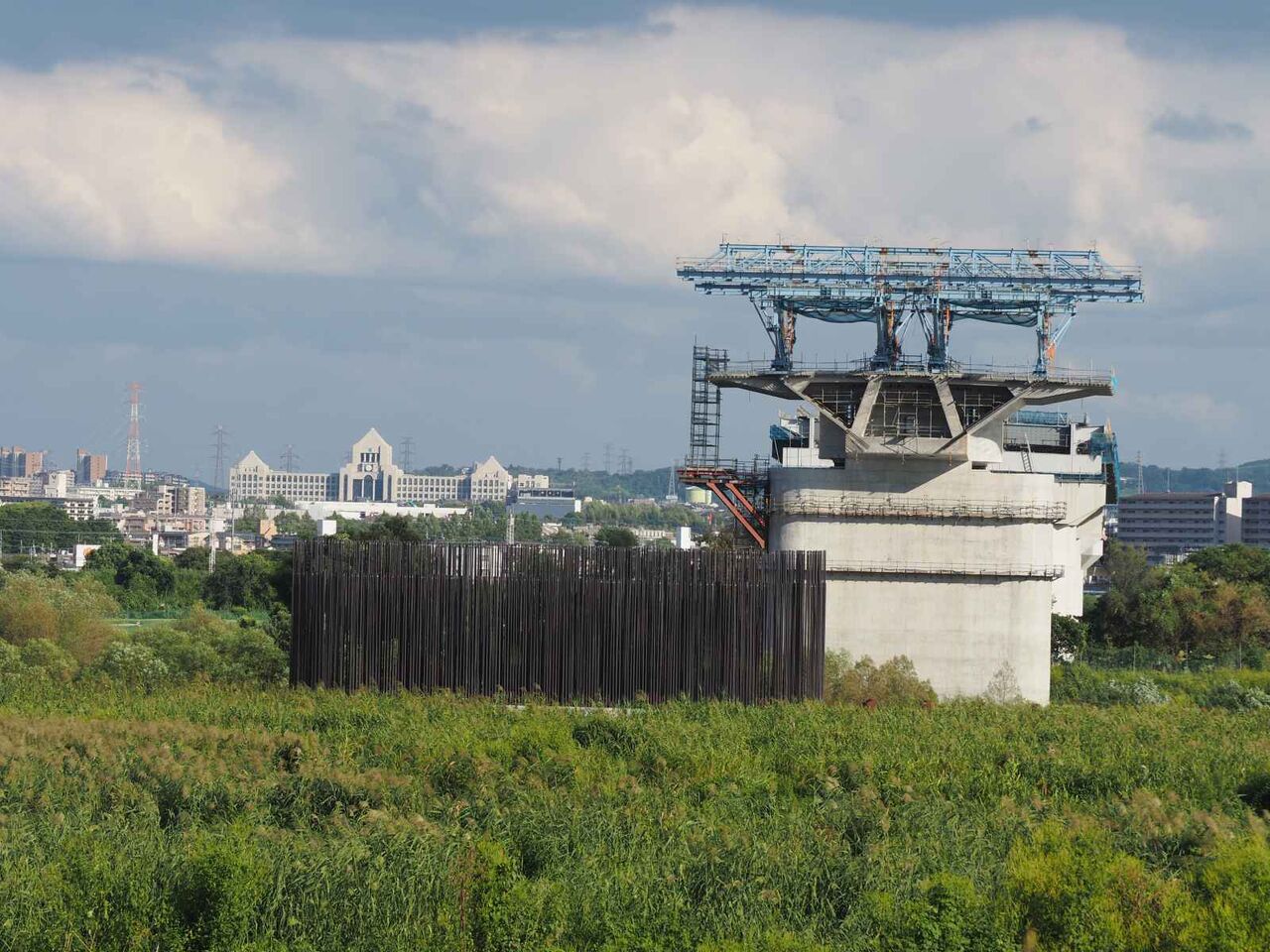 ◆新名神淀川橋工事ですが、上牧の淀川堤防の橋梁工事を観察しますと、淀川橋のヨシ原を通る橋脚に「塔」の建設が始まってるようすがみられました 2025年8月