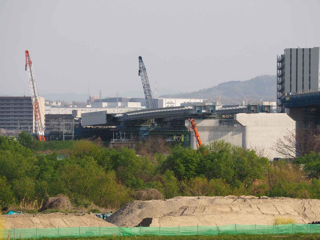 枚方側は高さが低くて市内は地下に入ります。橋桁に橋梁がのせられてきました。
