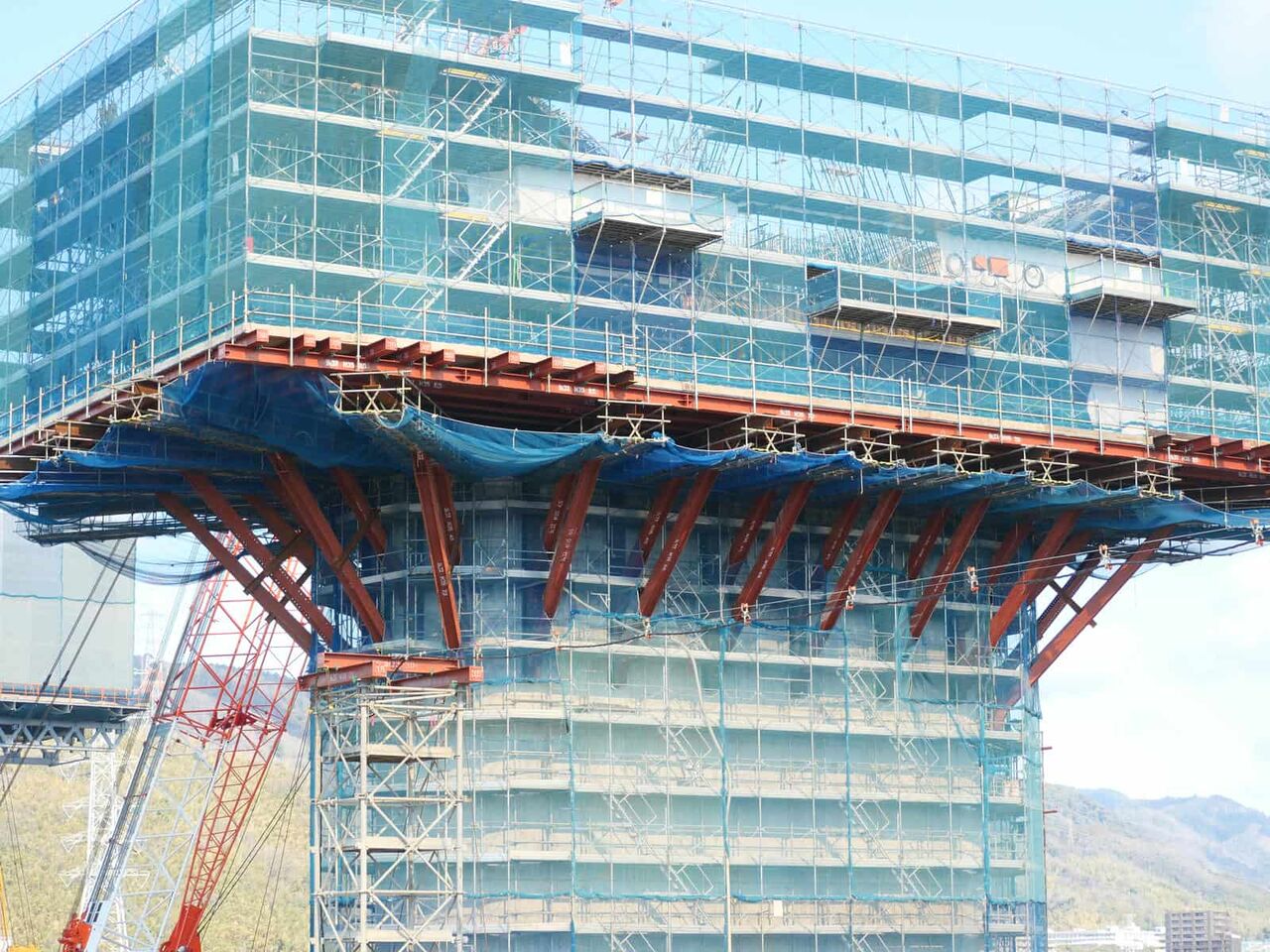 また国道との間の橋脚の間にも青色の仮の橋脚が組み立てられています。