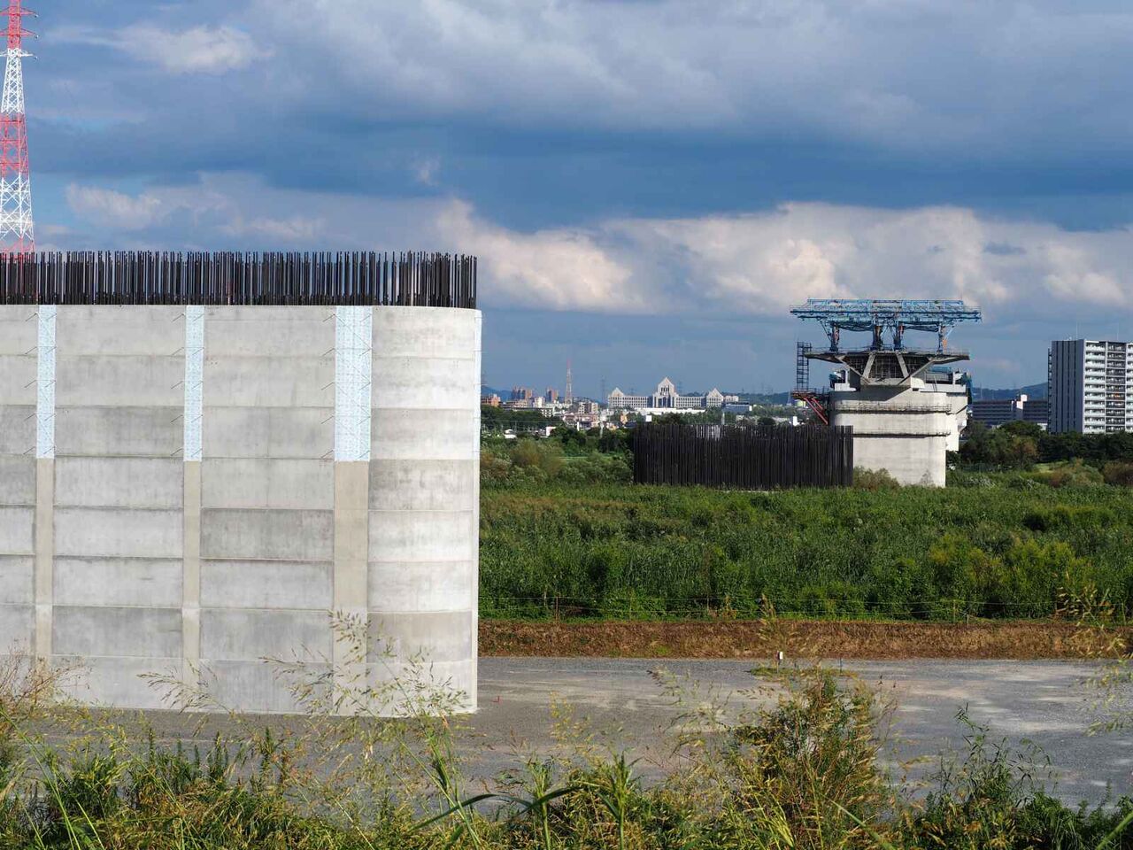 新名神淀川橋工事、上牧付近の橋脚工事近くのようすです。(2022年8月)いままで、この付近のようすを一度も投稿していませんでした。上牧の堤防沿いからも多くの橋脚が見えてきたので、近くまで行ってようすを見てみます。この場所も、ここだけの記事を追加更新します。