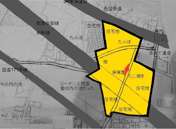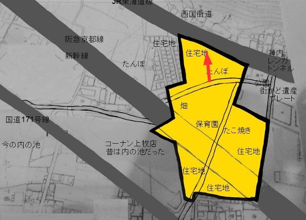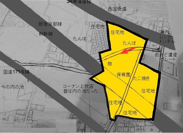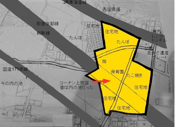 台場跡の中央は西国街道の神内のレンガトンネルと、171号線のコーナン東側間の道です、、ガードをくくると保育園(現在は移転)があり、つぎにおそらく多くの方が立ち寄られたことがあると思う、たこ焼き屋さんがありますね。めっちゃ安くておいしいです、、