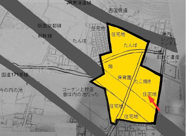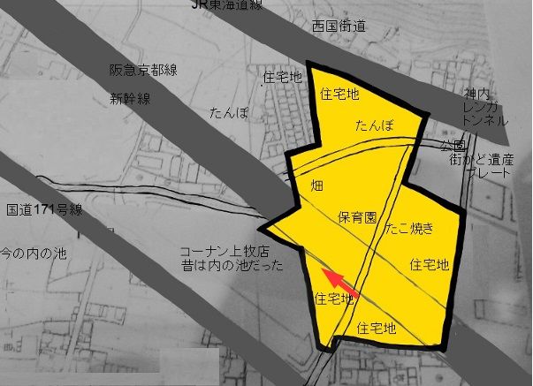 まず南側、上牧のコーナンは昔「内の池」という池がのびていて新幹線沿いに台場の南端があったみたいです。コーナンの建物の形が台場の形に沿っている感じですね