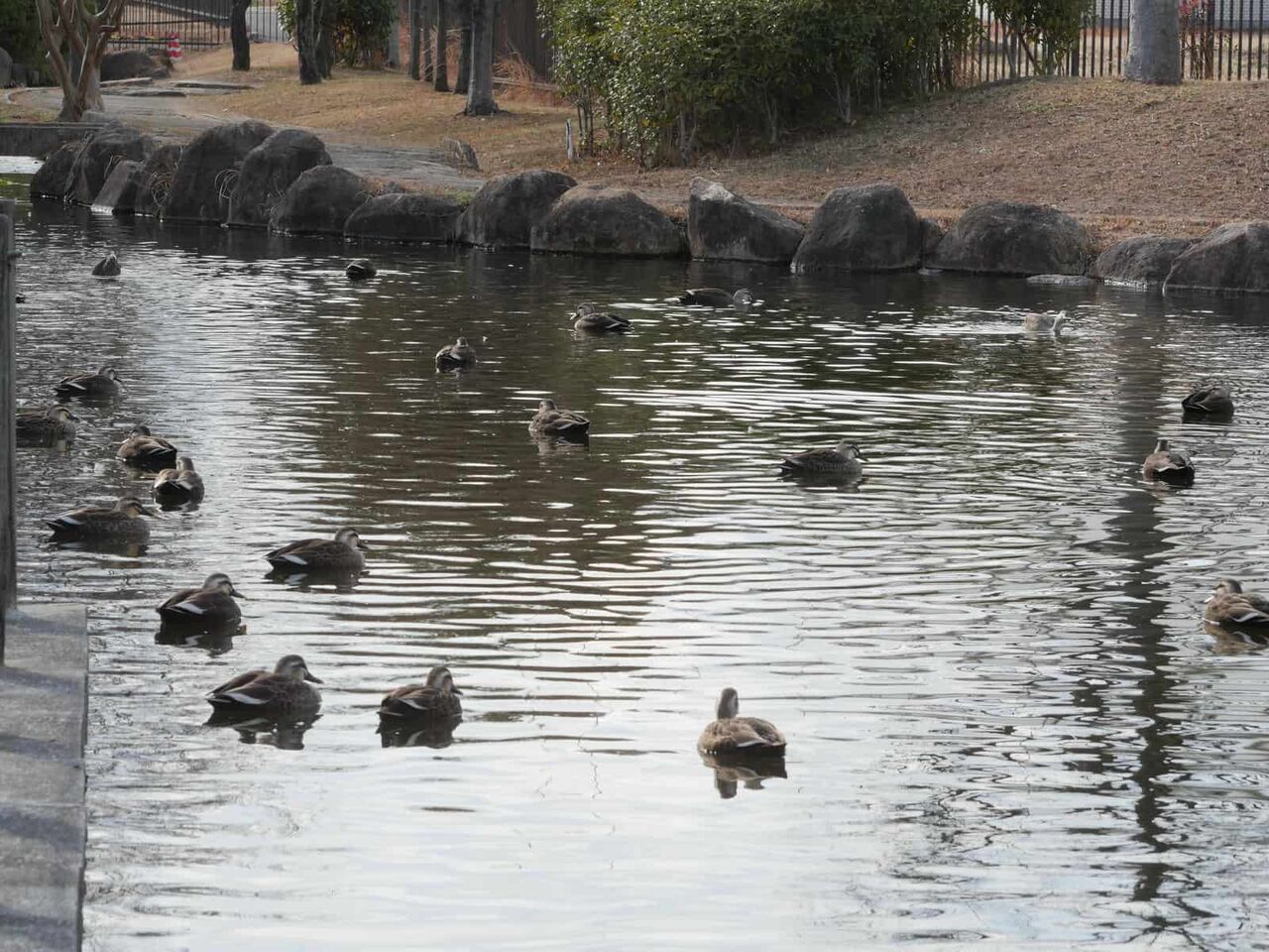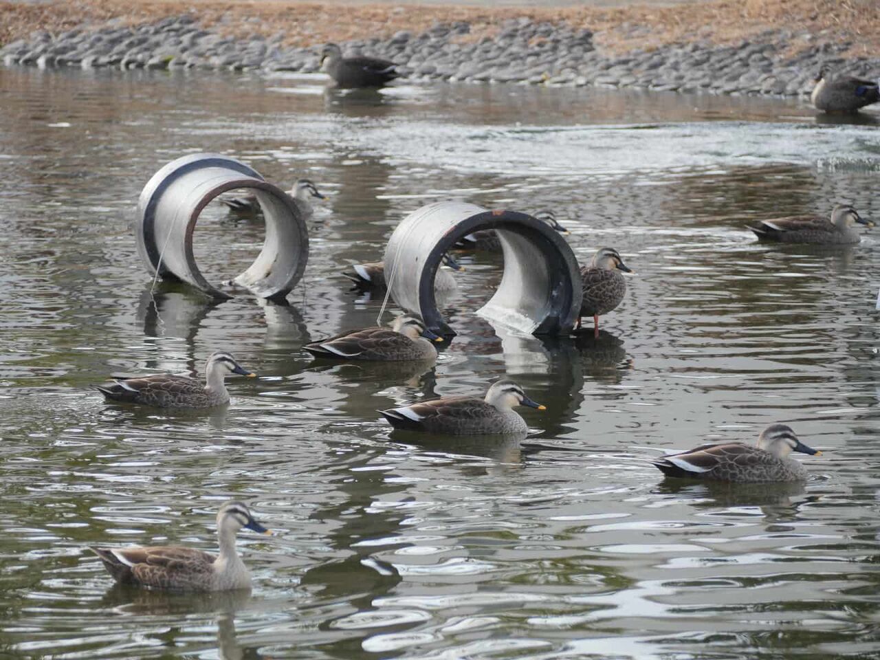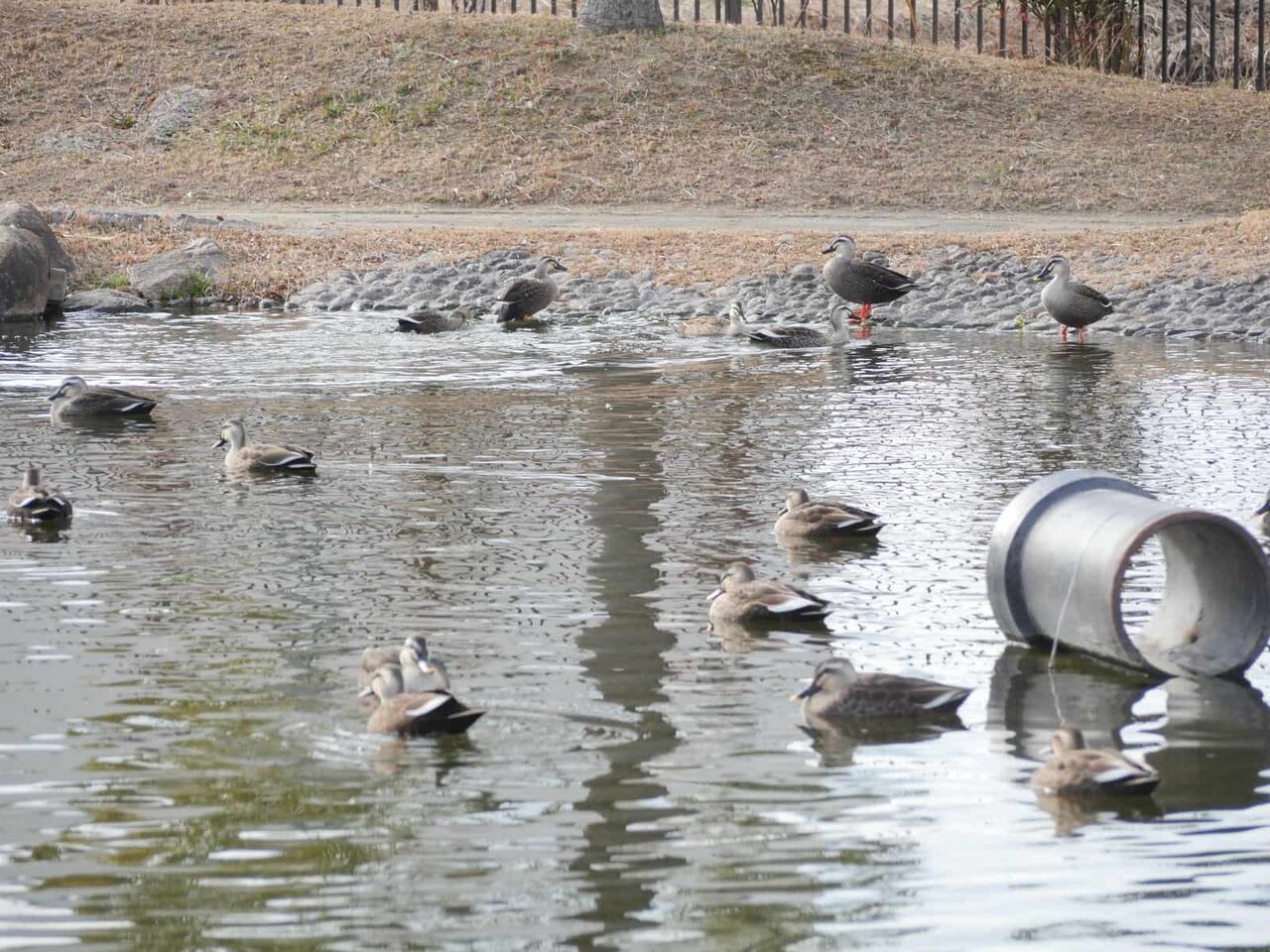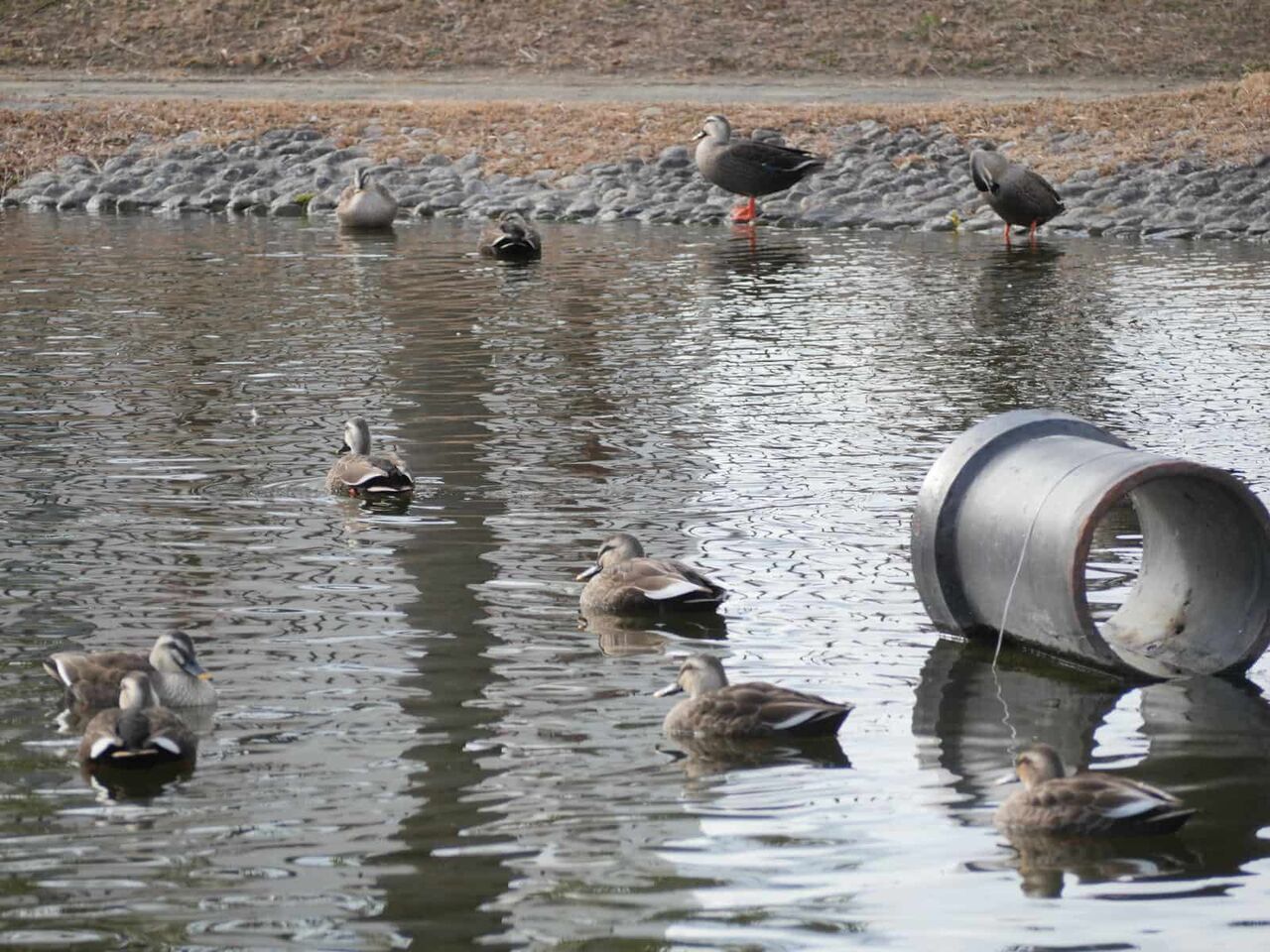 カモくんたちもちょっと大変です。ひなたぼっこは水路の中央にある仕切りの壁か、水路のり面で。