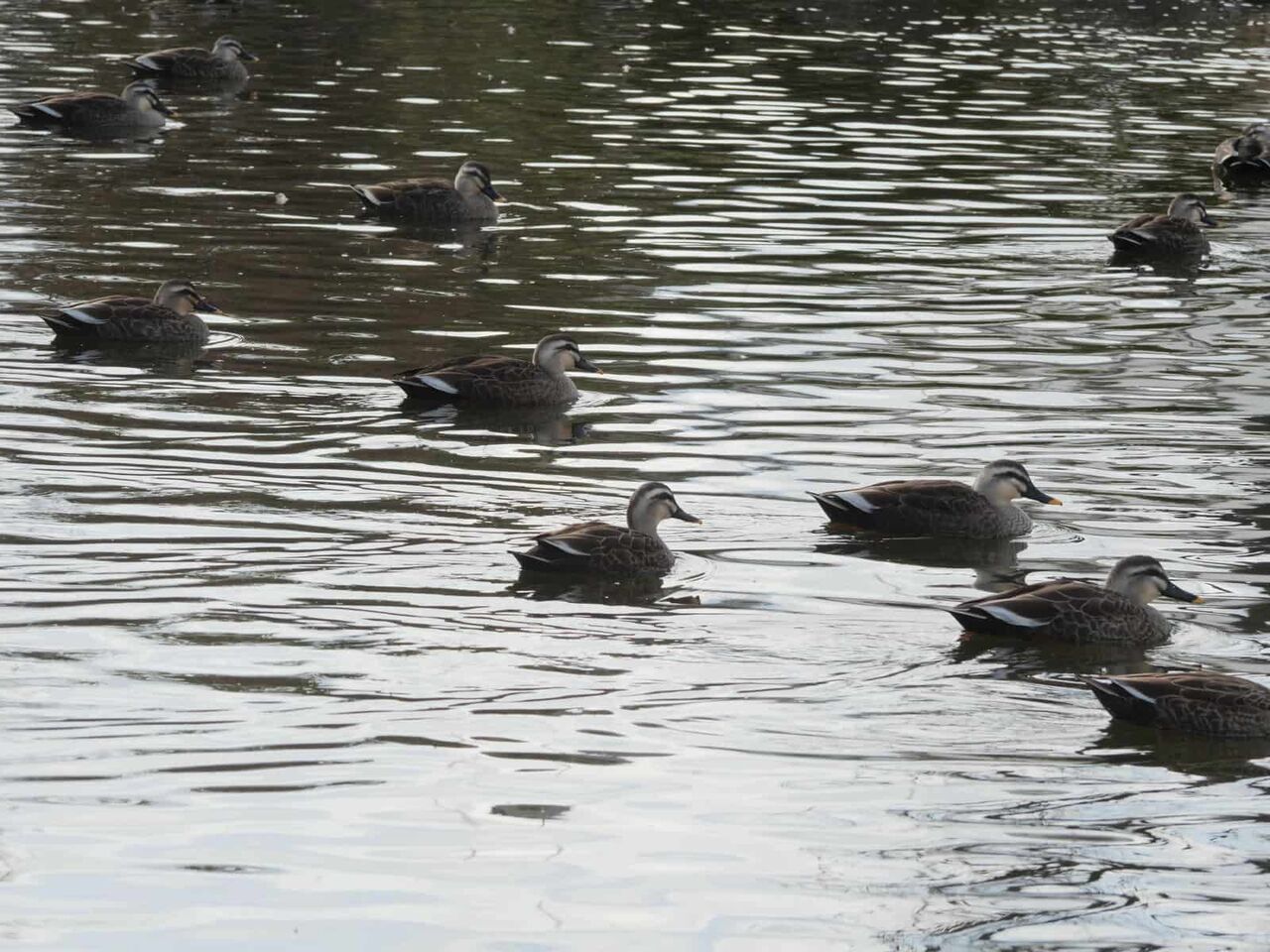 堤防から見るとこのようなようす。合わせるとかなりの数のカモ君たちが帰っているのではないでしょうか。