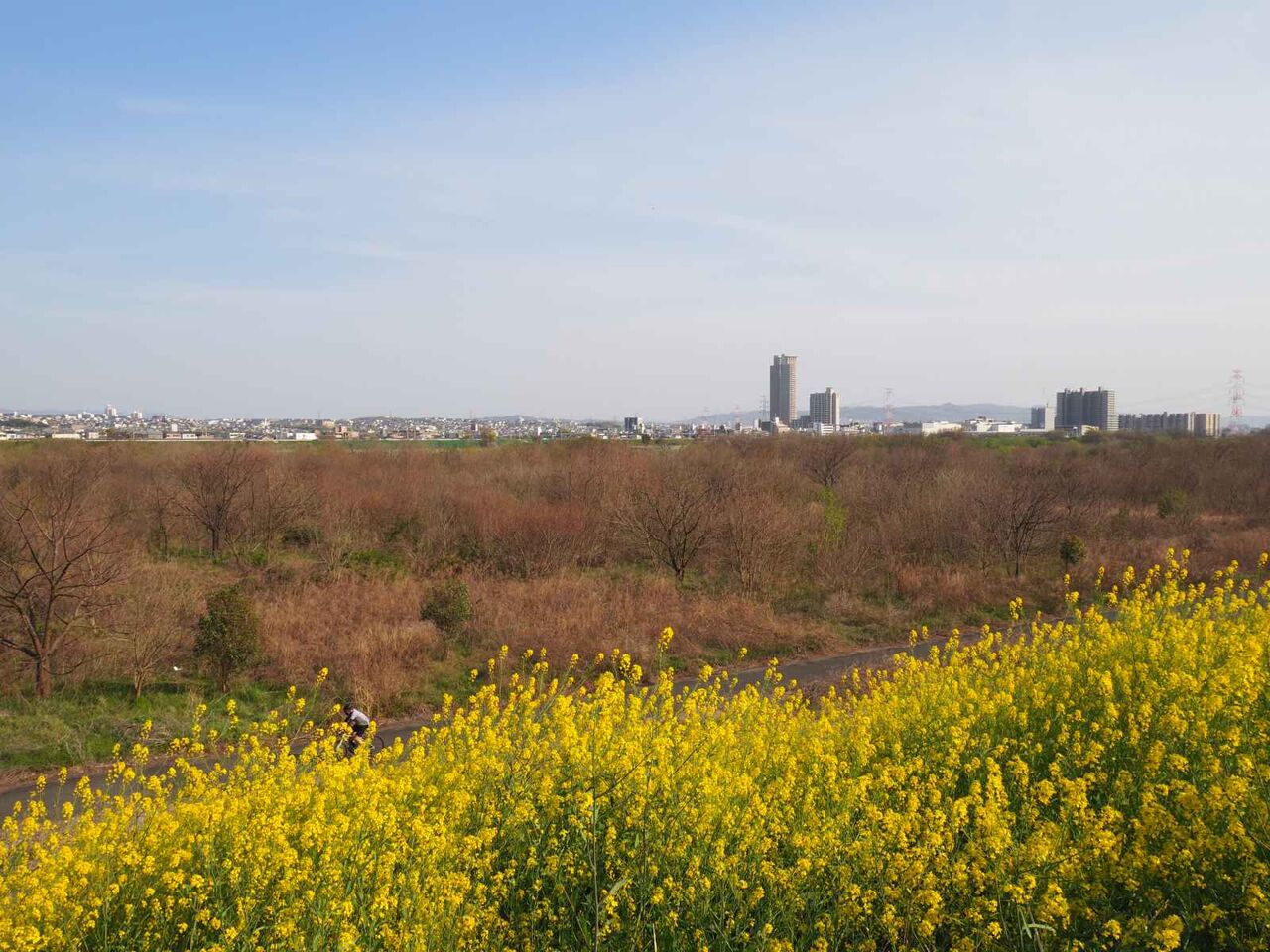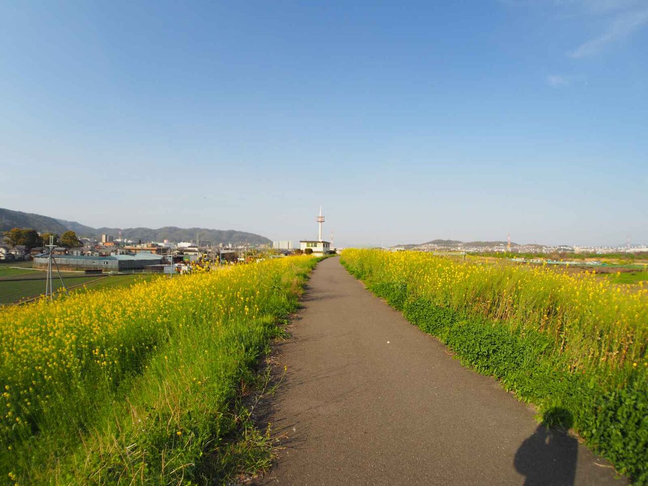 高槻の上牧から島本町の淀川堤防沿いですが、セイヨウカラシナのお花畑になっていて、満開になっているようです。(2023年4月1日)