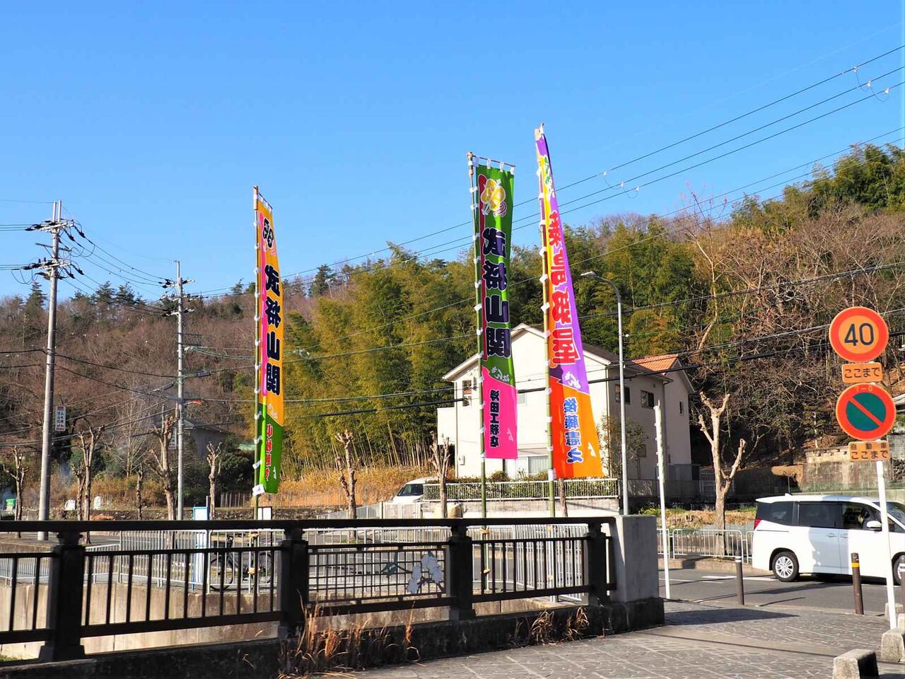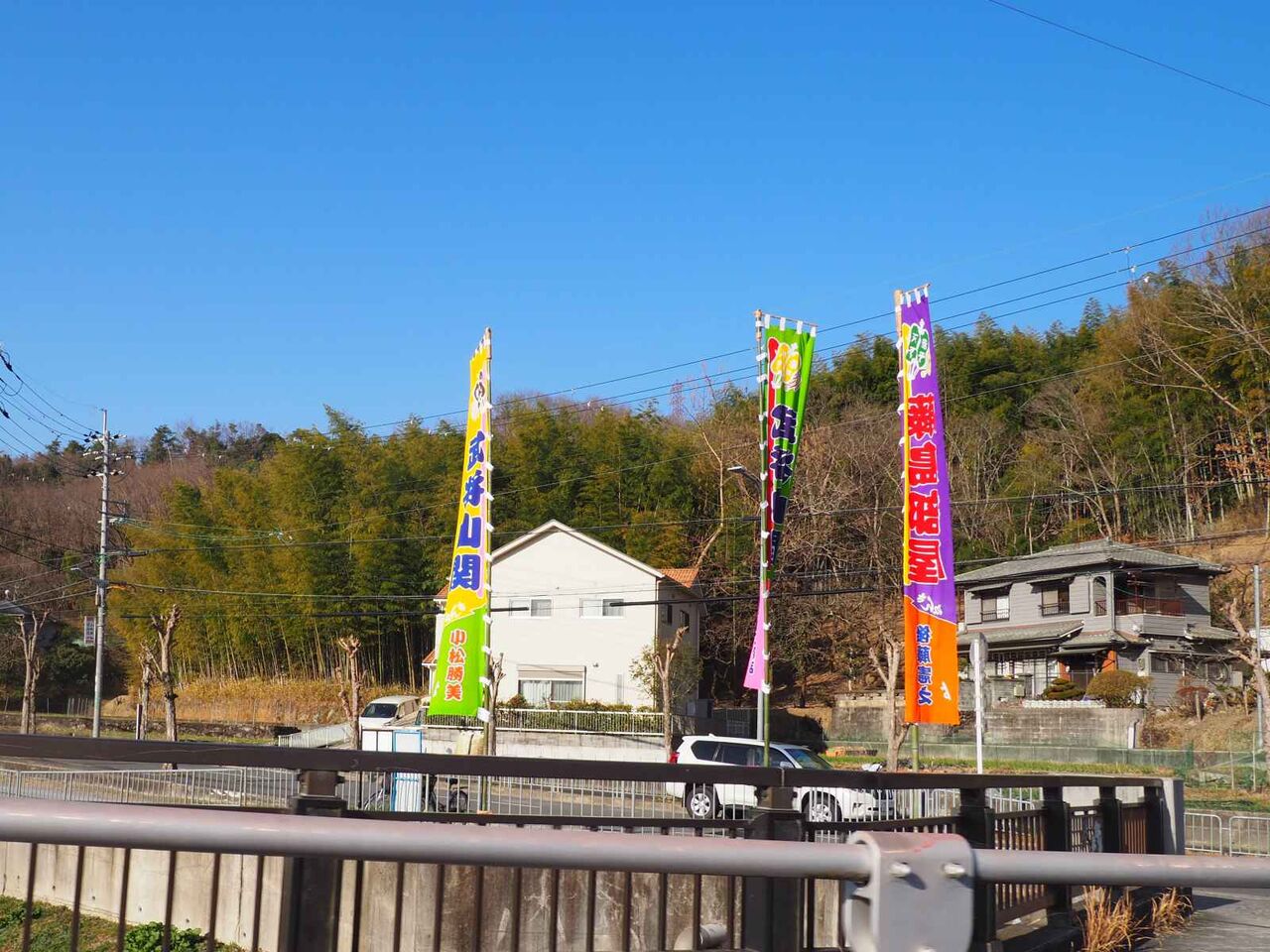早朝には稽古あとの力士さんを見かけました。塚脇橋のところにものぼりがあります。