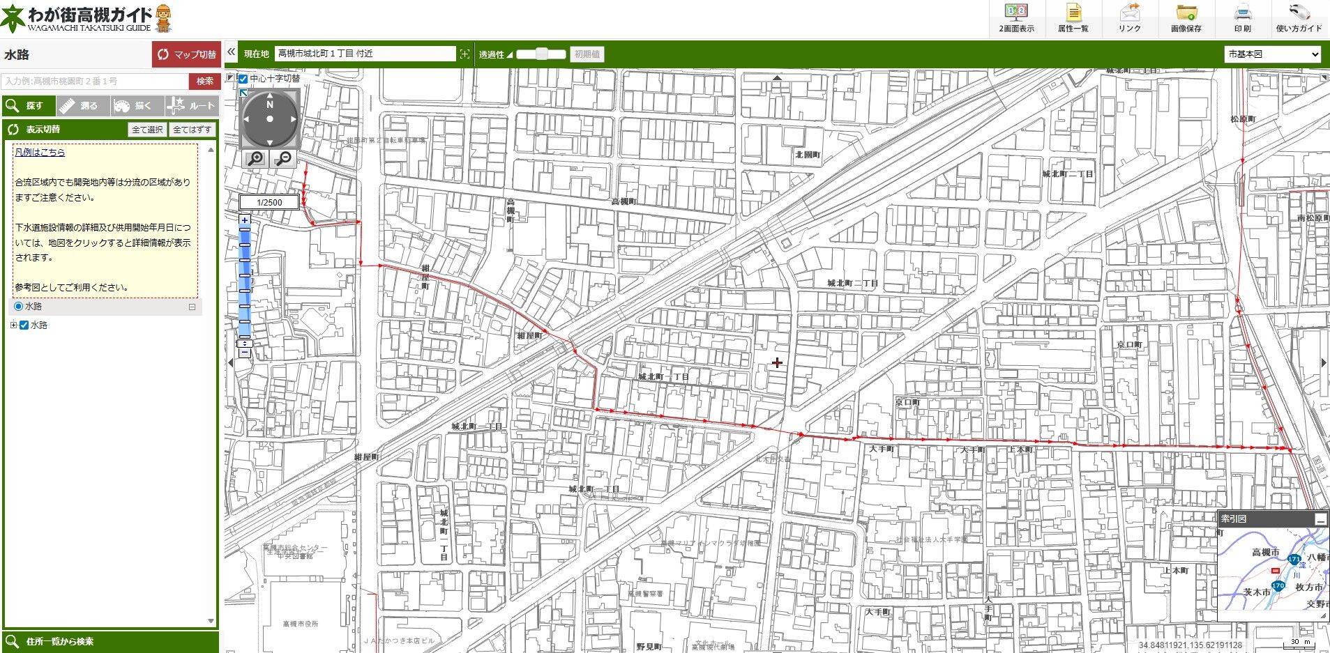 追記:高槻市の水路を検索しますと、出屋敷通りから、紺屋町、旧川之町、旧新川之町を通って国道170号線につながる水路の経路は今でもあるんですね。(赤線です 今は道の中央ではなく基本北側の水路が本線なんですね 普通の側溝より大きいので昔の名残を残されているのでしょうか)