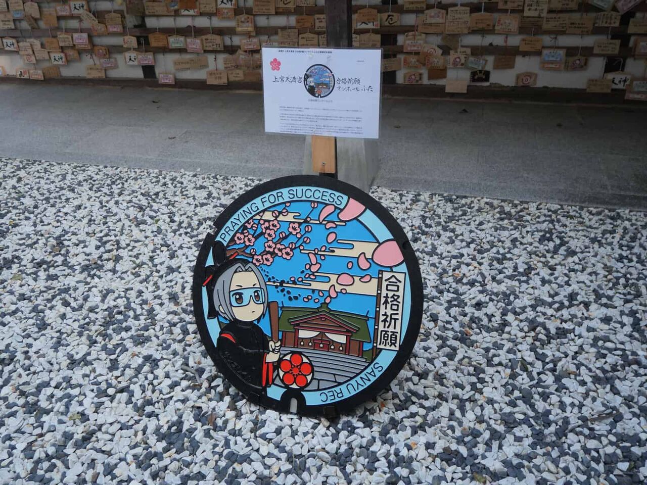 本殿の前にあった合格祈願のマンホールのふた 梅のデザインもありますね。
