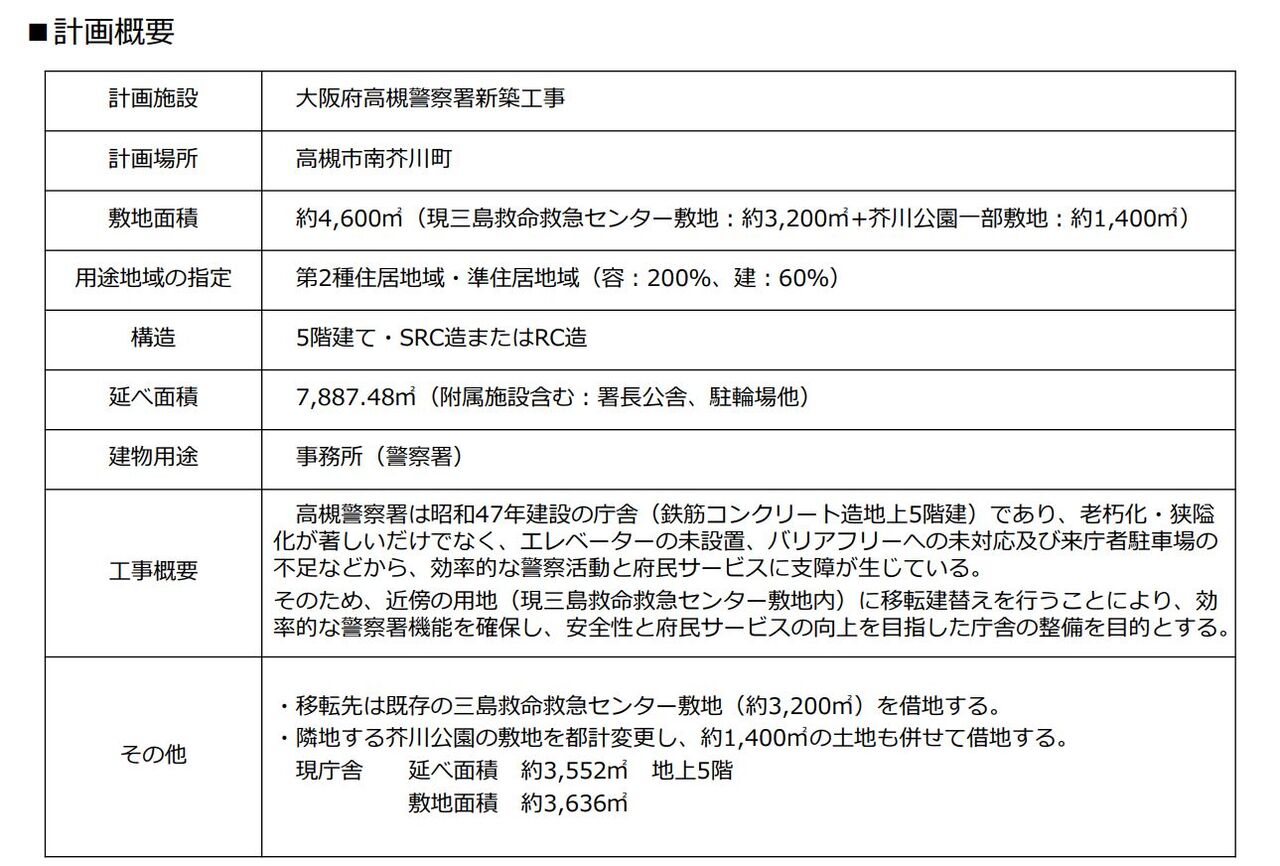 高槻警察は三島救命救急センター敷地と芥川公園の一部に移転される予定です。5階建で、基本設計が今年度終わり、来年度令和5年度(2023年4月~2024年3月)に具体設計が始まるようです。これはすでに昨年2022年2月に具体的な公募の概要が公表されていたんですが、おそらく来週の市議会でも、三島救命救急センターや夜間診療所の移転・稼働する話は出てくる可能性があるので、その跡地の活用としての計画を確認しておきたいと思います。