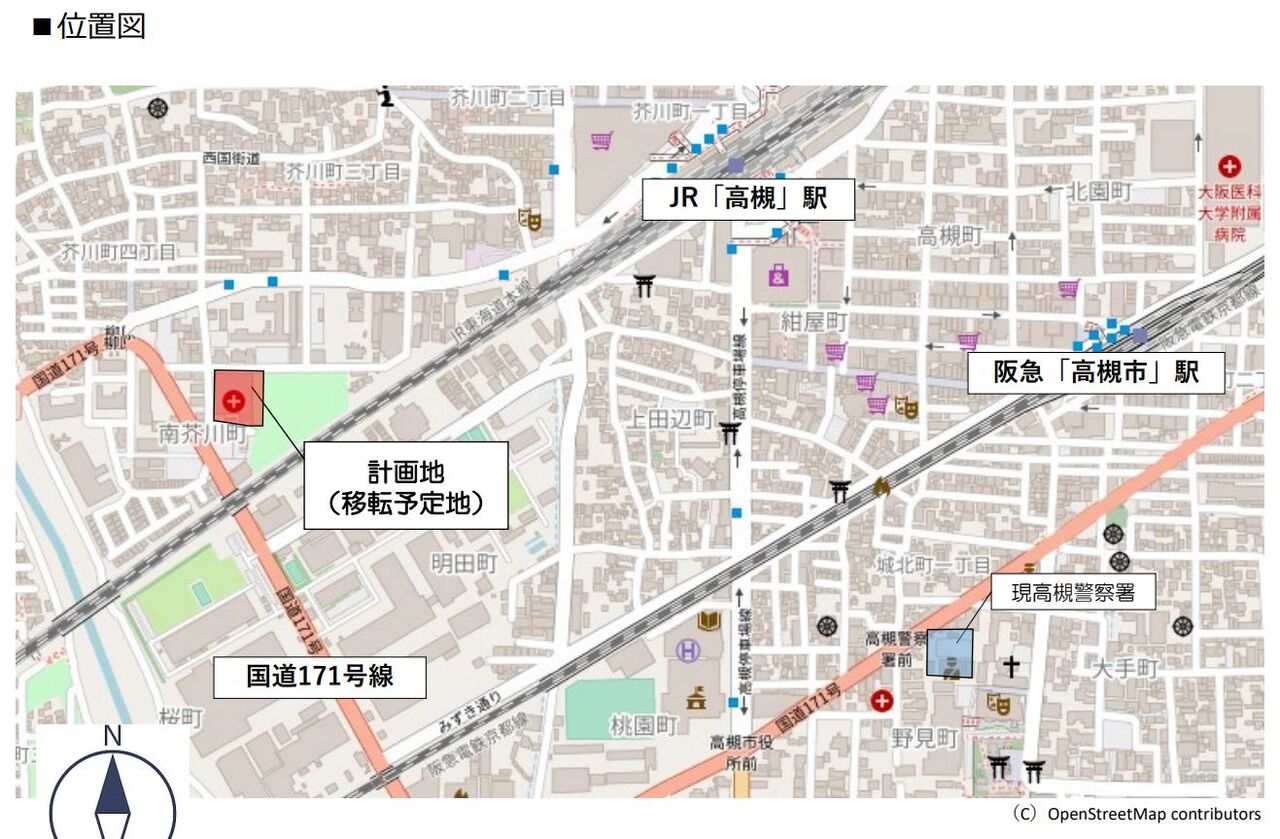現在の場所と、移転後の場所の位置関係はコチラ。JRからの距離は同じくらいですが、阪急高槻市駅からは少し遠くなりますね。
