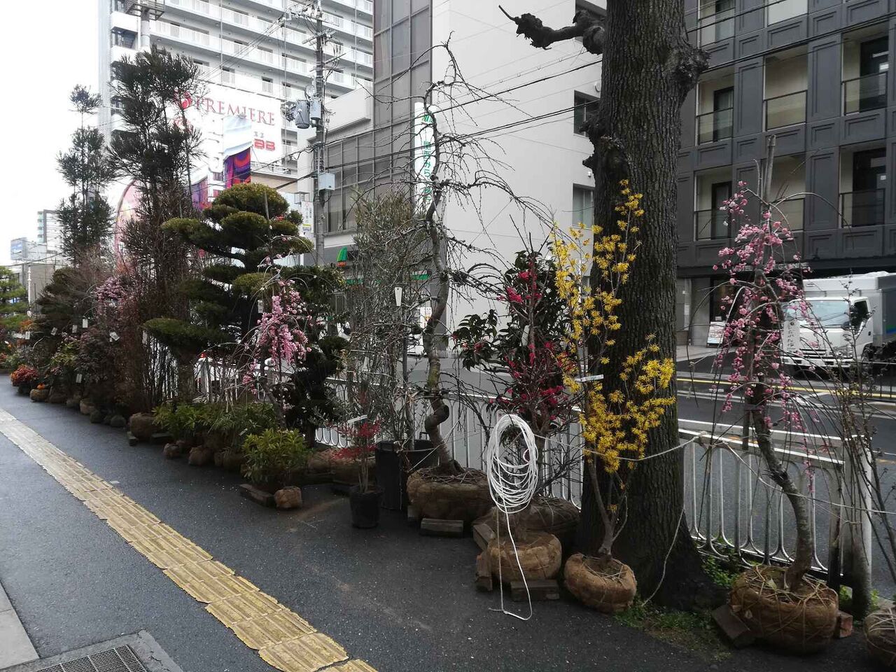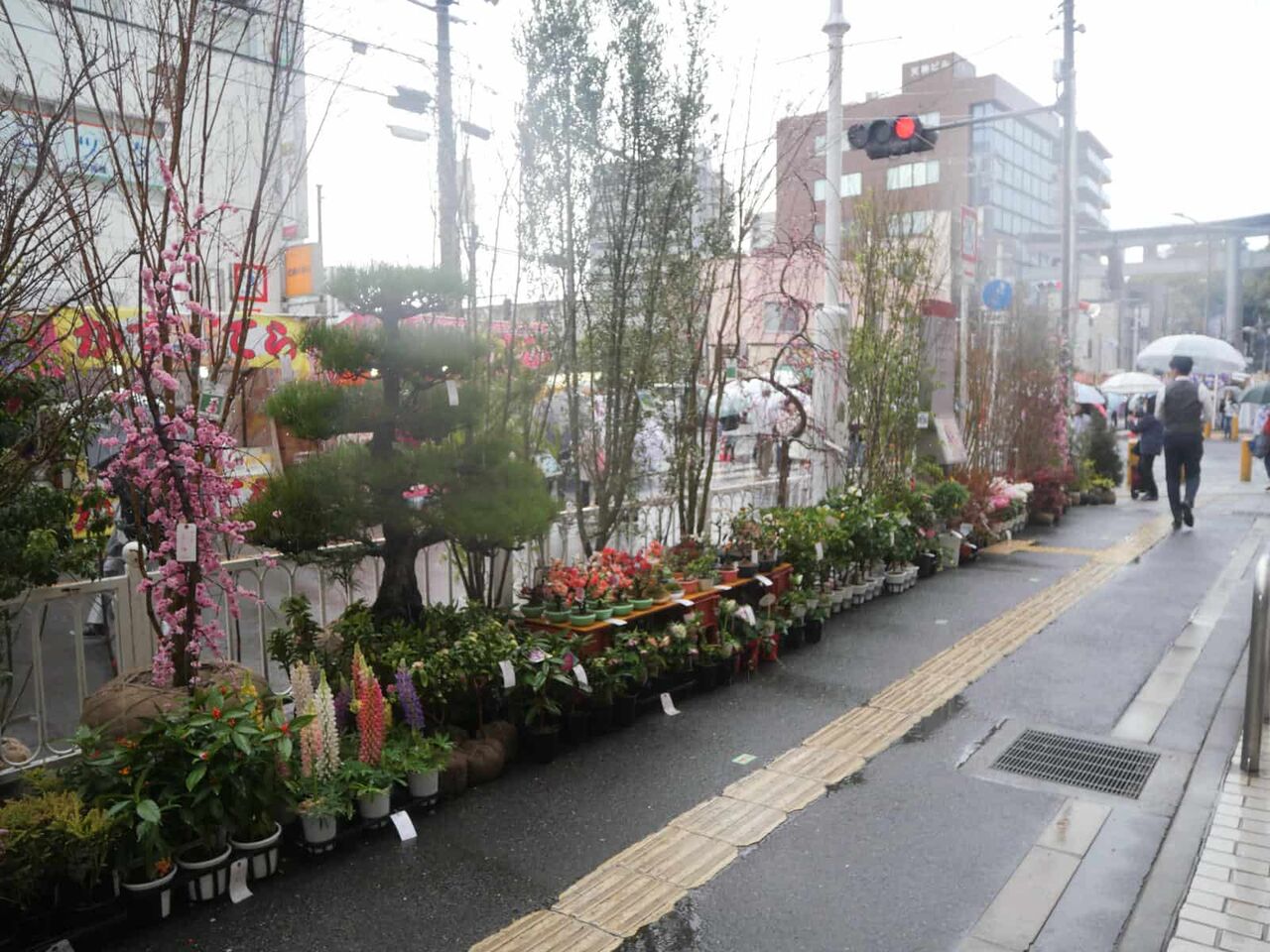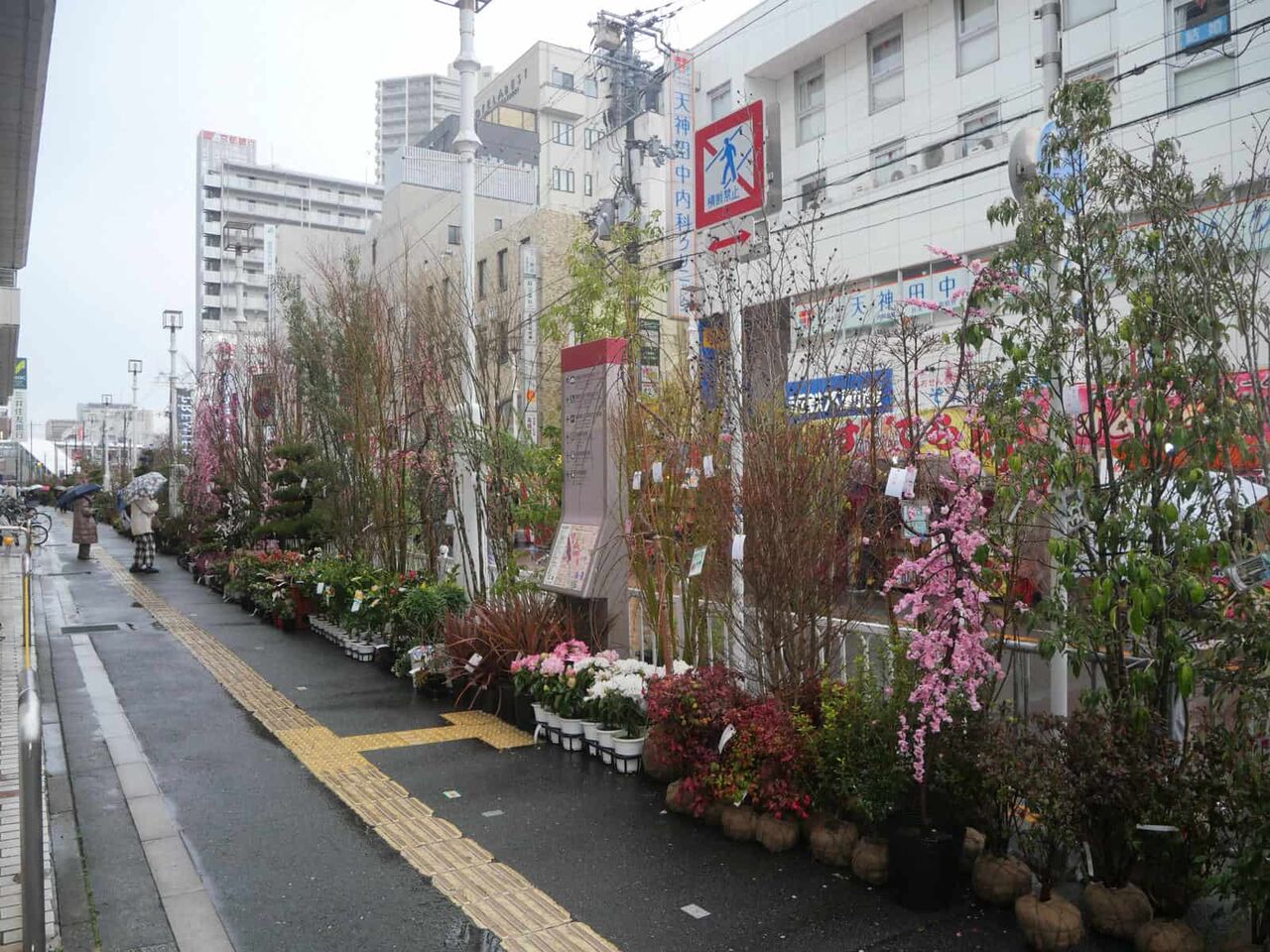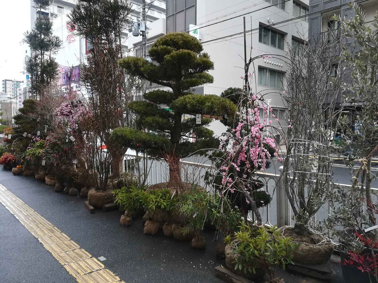 高槻阪急の歩道沿い、例年天神祭りの時期に合わせて開催されている植木市(植木展示即売会)です。