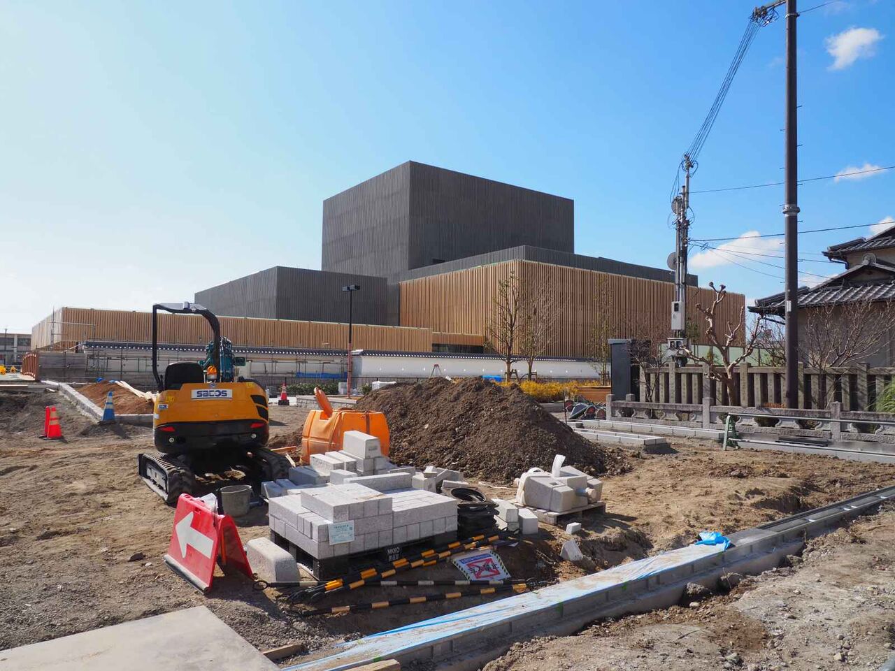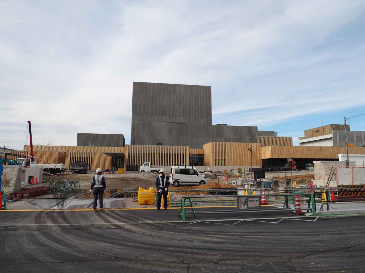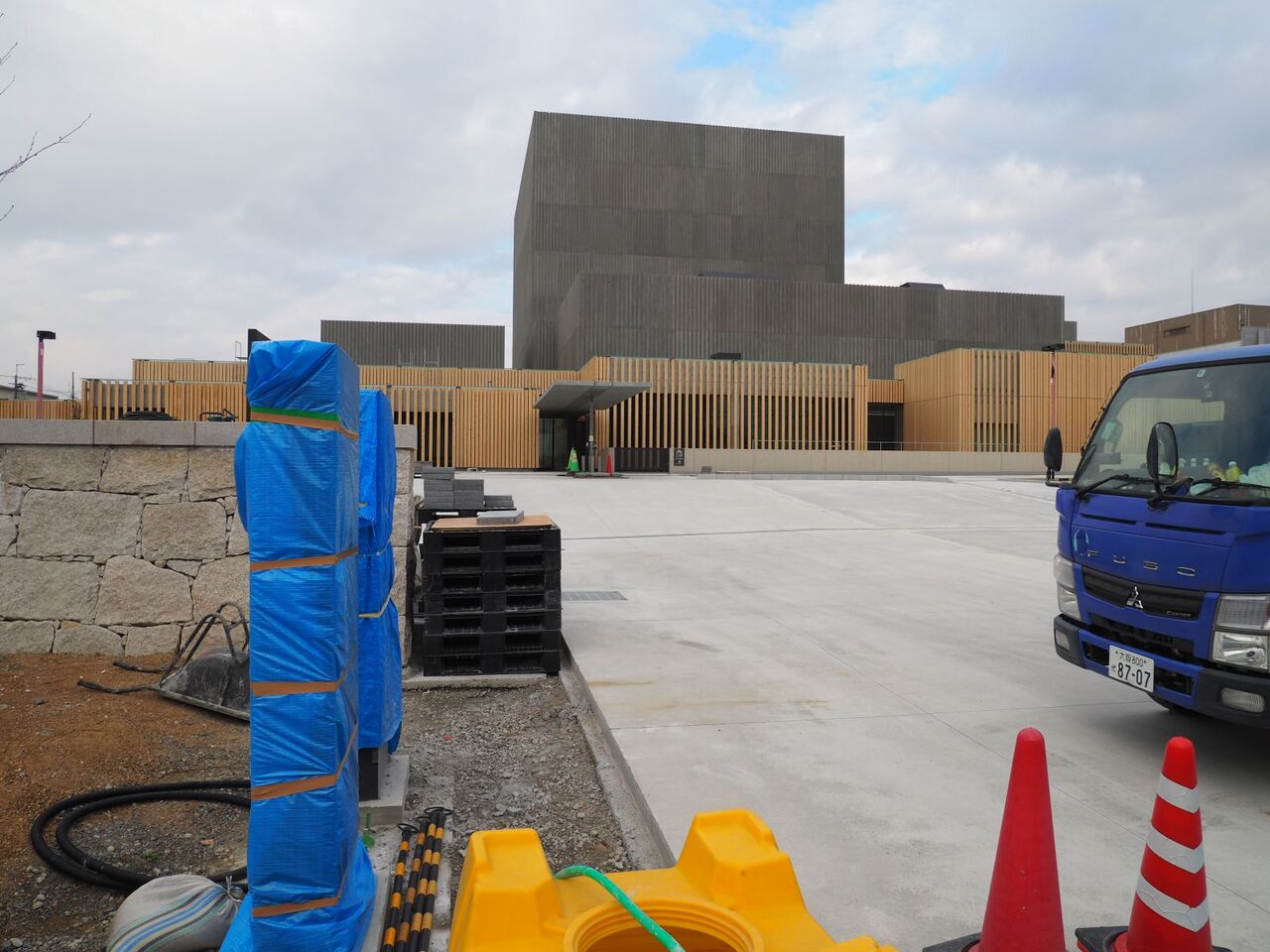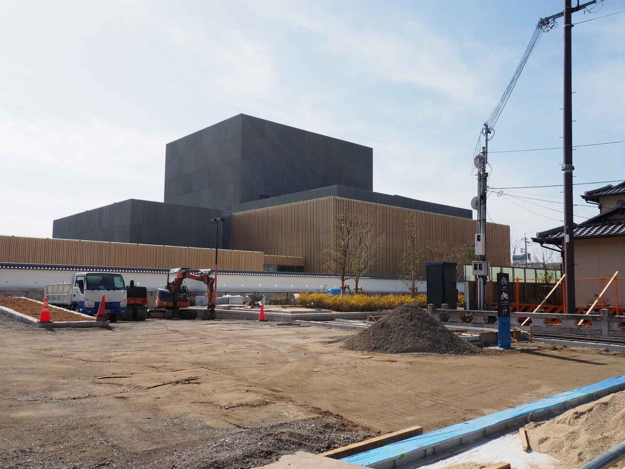 写真は21日時点のようすです。まだ正面の広場は舗装されていませんが、いよいよ完成真近です。
